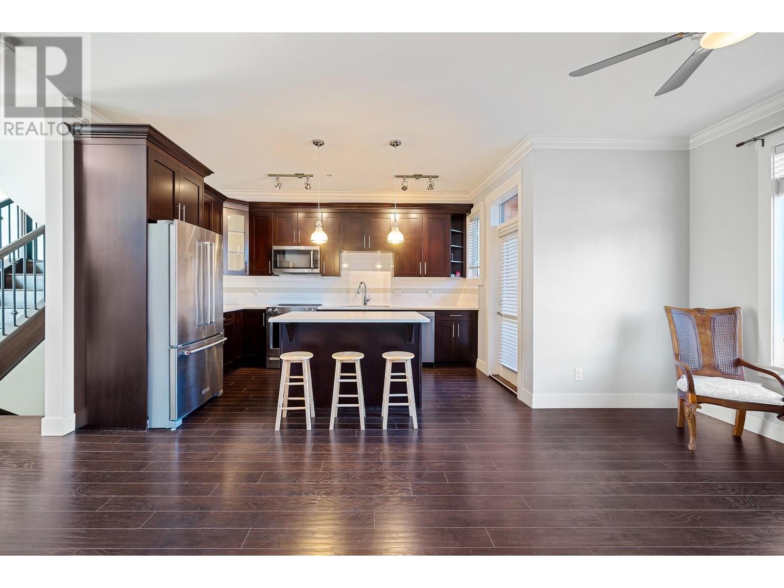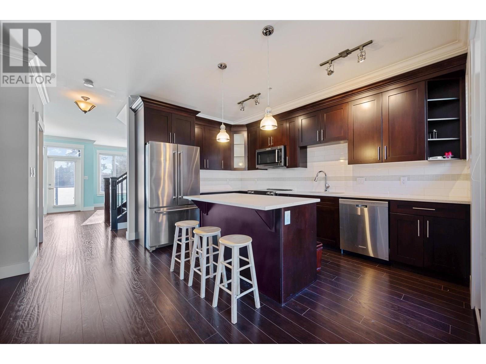 $400.19 MonthlyA jewel & excellent location. Beautiful architectural design in contemporary West Coast Style. South facing; corner & end unit; 4 bedrooms & 4 bathrooms with modern open concept. Exquisite Maple cabinets, white quartz countertops; sleek stainless appliances; hardwood laminate floors throughout the first two levels. Three upper deck one of which two bedrooms share. Main floor master bedroom with 4-piece en-suite and large walk-in closet, below a large bedroom and a fall bath. Built-in vacuum, double garage, cushy parking accessibility, fenced yard, close to shopping and just steps to transit. (id:44393)