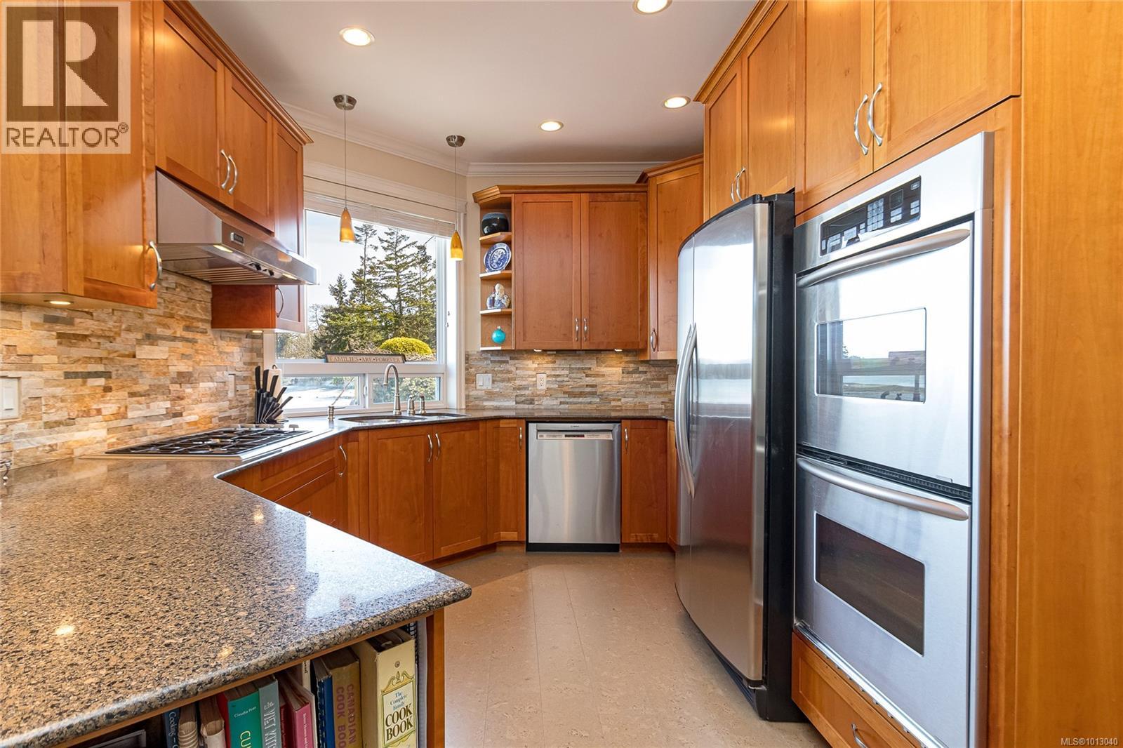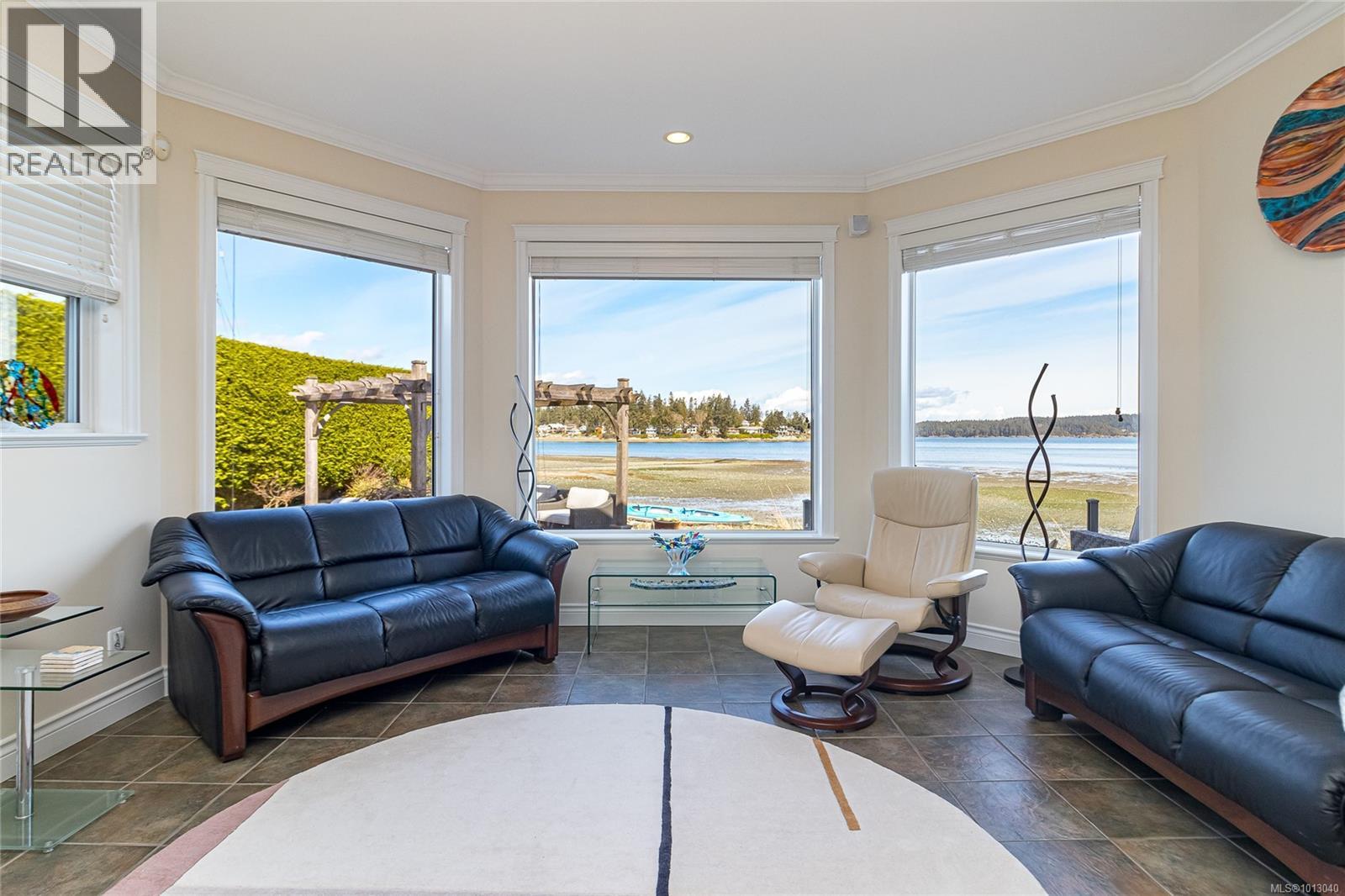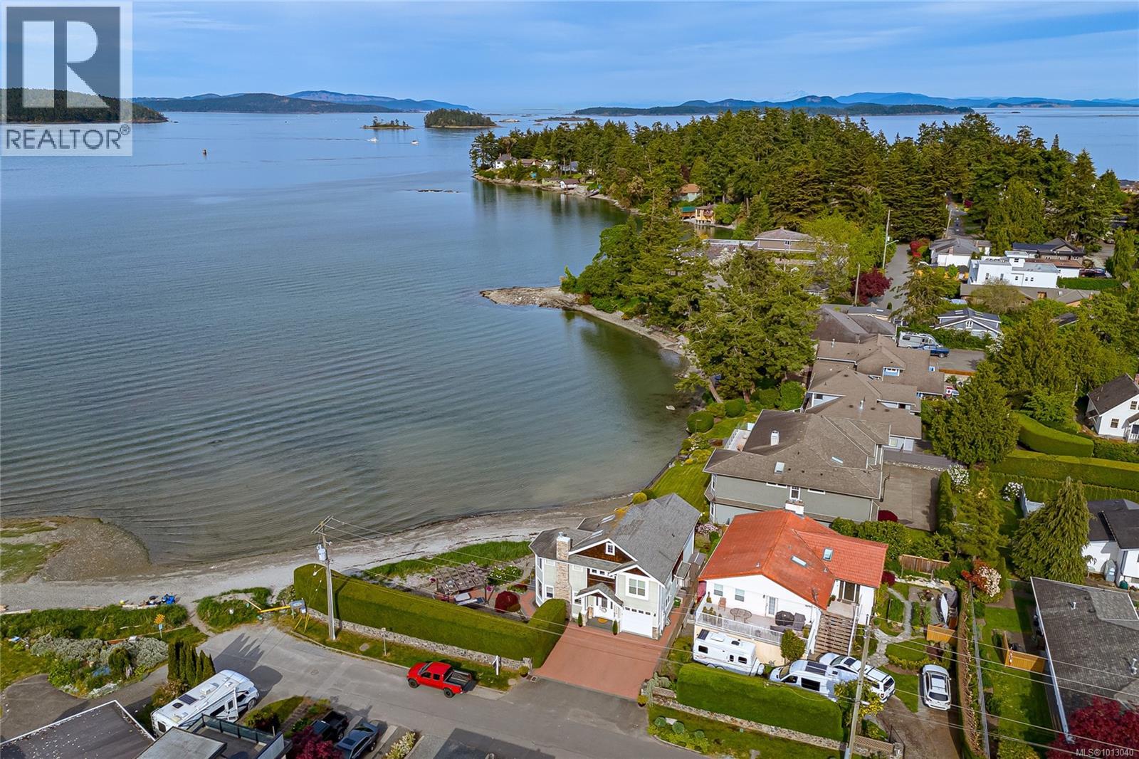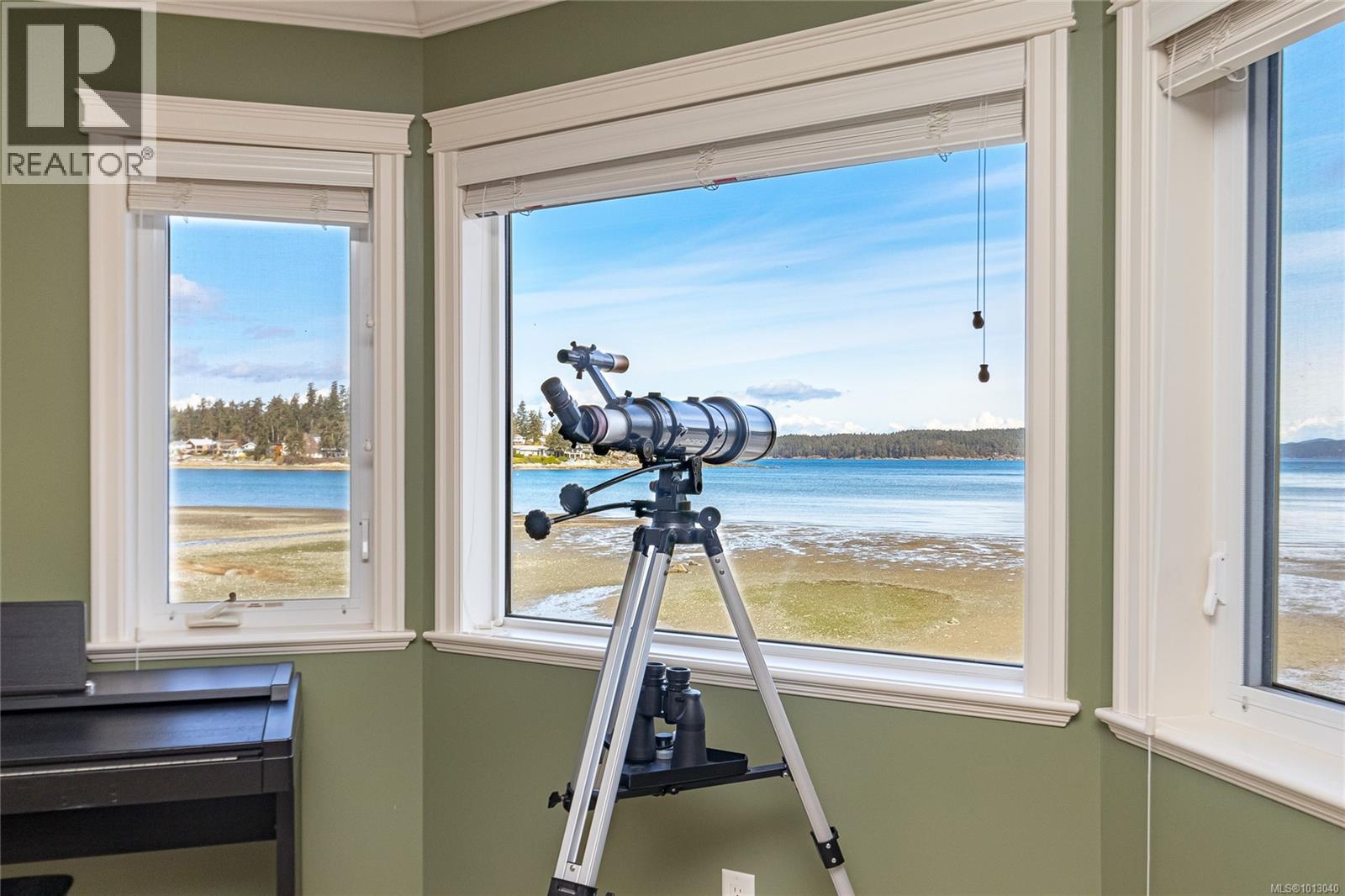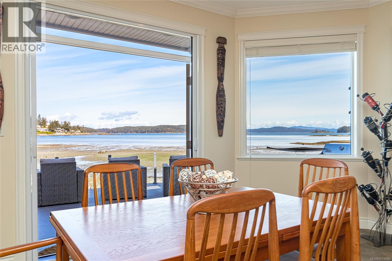 NEW PRICE! This exceptional waterfront home, custom-built, is nestled on a private lane with breathtaking views of Roberts Bay. The gently sloping waterfront offers easy access for kayaking and beach walks. The home boasts a gourmet kitchen with cherry wood cabinetry, granite countertops, crown moldings, central vac, and in-floor radiant heating throughout. Natural gas and an irrigation system for the a striking professionally designed seaside garden enhance comfort and convenience. With an easy walk to downtown Sidney, this unique property features water views from almost every room, four spacious bedrooms, three bathrooms (1 with a steam shower), and a low-maintenance yard with a brick-laid driveway and pathways. The beautiful patio extends the living space outdoors, and the attic offers a hobby room or ample storage. With flexibility for four to five bedrooms, this home is perfect for those seeking tranquility and coastal beauty. (id:44393)