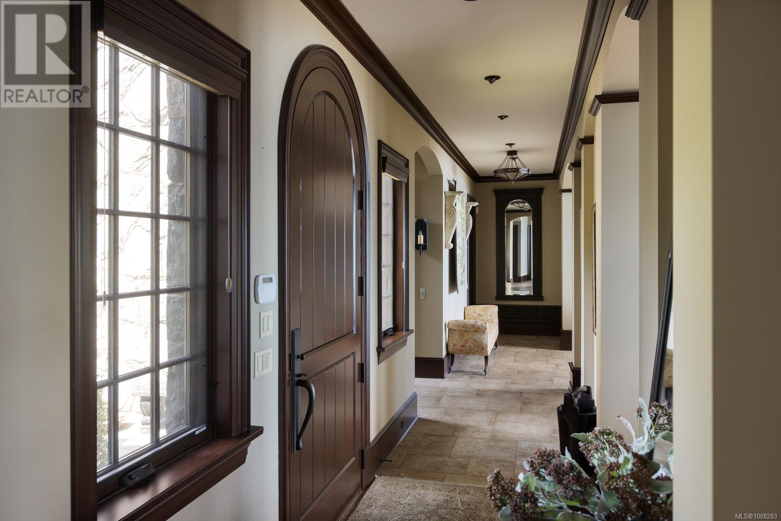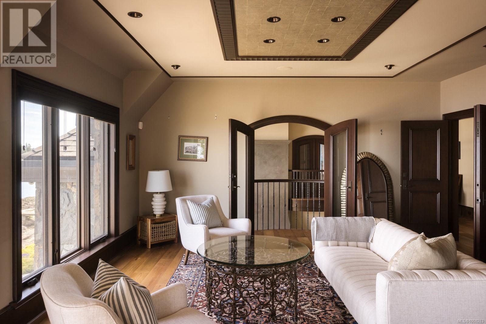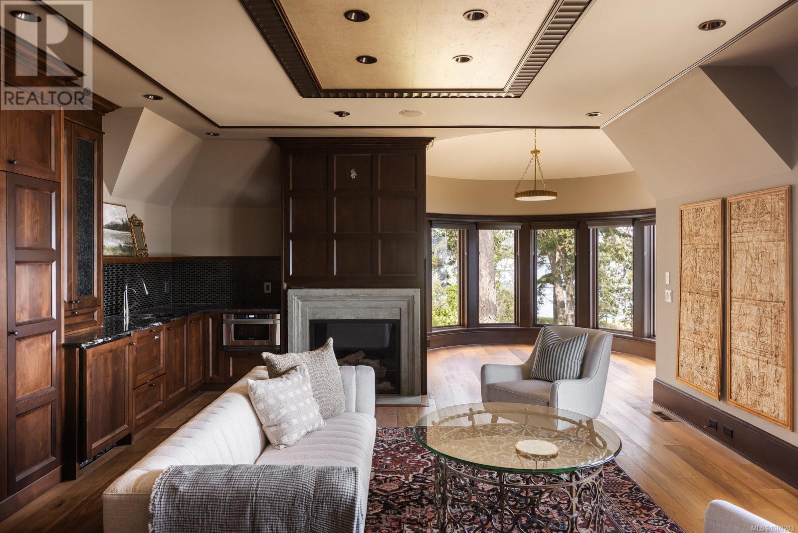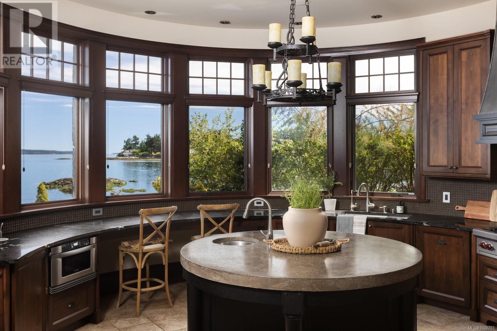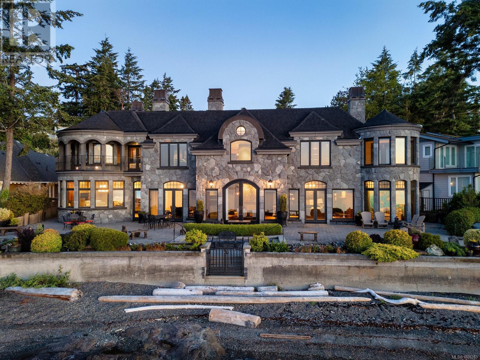 We proudly present this sophisticated West Coast waterfront retreat, showcasing breathtaking southerly panoramic ocean views of the Gulf Islands and Mount Baker. With its soaring ceilings and expansive windows, this solid stone residence creates a sensation of floating on water, offering an unparalleled living experience. Prepare to be mesmerized by the meticulous attention to detail and this home's high-quality construction and finishes, including walnut flooring imported from France, seven indoor fireplaces and custom millwork throughout. With a ground-level entry, guest quarters on the main floor and an elevator to the second level, the home offers enhanced accessibility. The main level boasts an exquisite circular kitchen with high-end appliances and a butler's pantry. The formal dining room is perfect for hosting elegant dinners, while the great room, featuring 21-foot ceilings, creates a grand yet inviting atmosphere. A charming study with built-in shelves and a coffered ceiling provides an ideal home office. Ascending the spiral staircase, you'll find a luxurious primary suite with a circular balcony offering ocean vistas, a serene reading nook, and a relaxing sauna, providing a private sanctuary for rest and rejuvenation. Enjoy your private enclosed sunroom, conveniently accessible from the primary bedroom's walk-in closet. The deluxe media room is ideal for movie nights, while the family room, with its convenient kitchenette and games room, offers additional space for activities. The exterior features are equally impressive, with expansive terraces perfect for outdoor dining, lounging and taking in the views. The low-maintenance, manicured grounds make upkeep easy, while a private hot tub patio offers a serene, relaxing space. Enjoy direct access to a sandy beach with a low-bank waterfront. Fully fenced and gated, this prime location is just minutes from all amenities, with convenient access to the Airport, BC Ferries and world-class marinas. (id:44393)