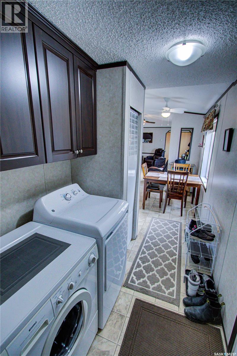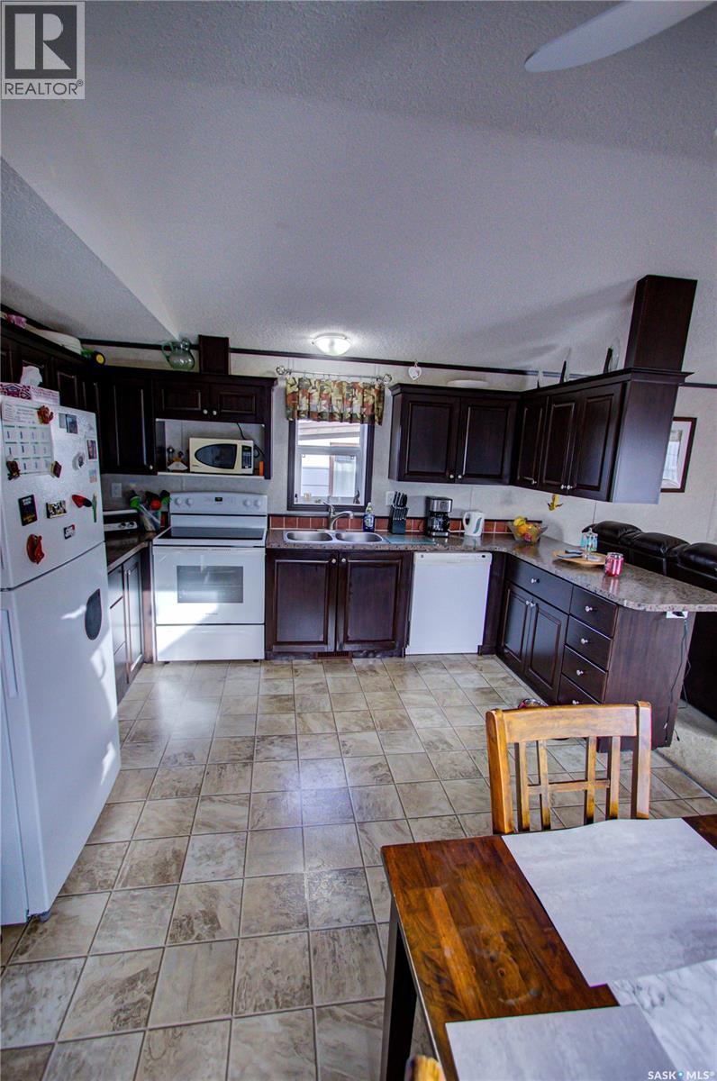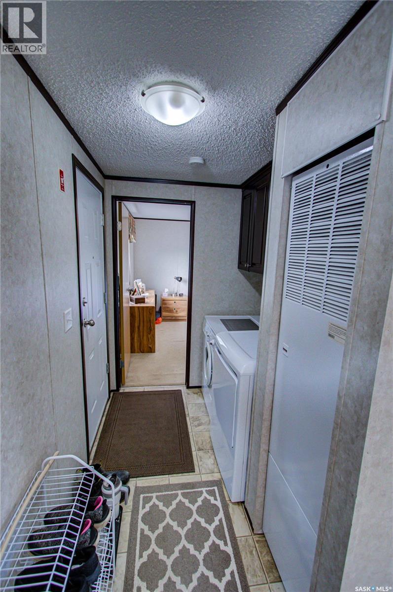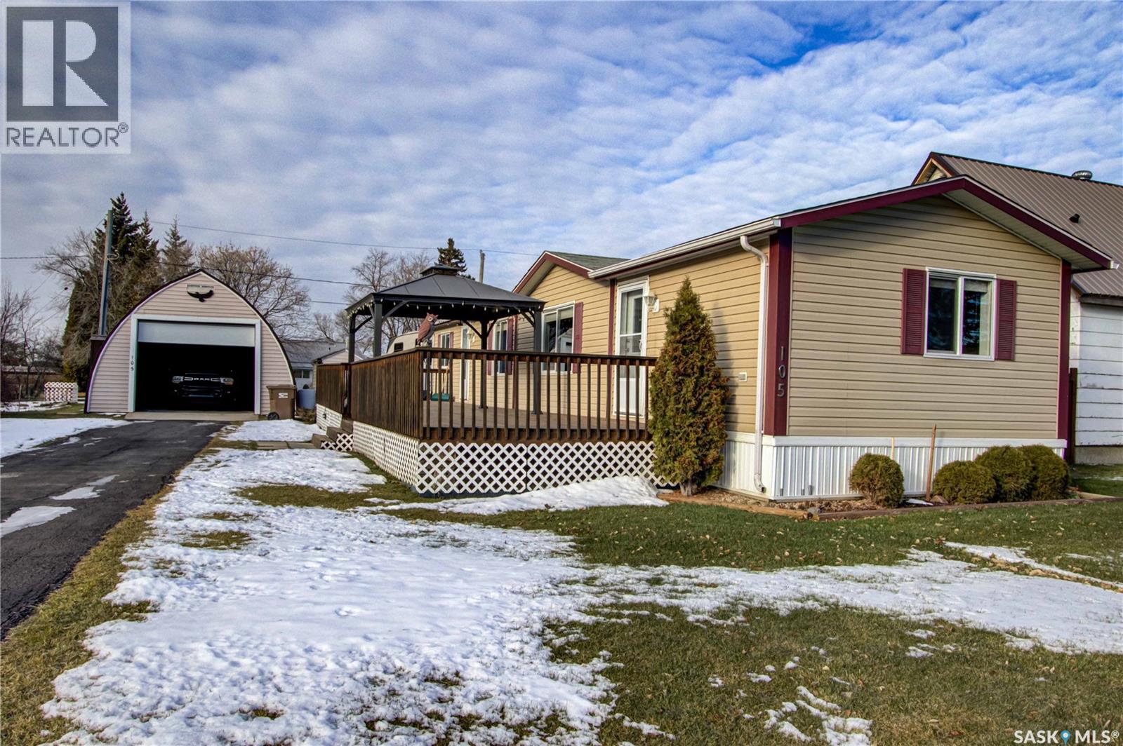 Welcome to Kinistino! This well-kept 970 sq ft modular home (built in 2010) offers affordable, comfortable living in a quiet and friendly community. With 2 bedrooms and 2 bathrooms, this home is an ideal fit for first-time buyers, retirees, or anyone seeking low-maintenance living on a peaceful dead-end street. Step inside to find a bright, clean, and meticulously maintained interior. Fridge and stove new in 2024, dishwasher and dryer in 2020. The functional layout provides great flow, ample natural light, and comfortable living spaces. Outside, enjoy summer evenings on the large west-facing 500 sq ft deck, complete with a gazebo—perfect for relaxing and entertaining. A 588 sq ft Quonset-style detached garage provides sheltered parking or a spacious workshop area. The paved driveway offers plenty of additional parking, while back alley access allows room to park an RV, boat, or other toys with ease. Located in the quiet community of Kinistino, known for its agricultural roots and home to several farm equipment dealerships, this town offers excellent local amenities including a K–12 school, gas station, grocery store, nursing home, health clinic, hockey rink, and more. Conveniently situated on Highway 3 between Melfort and Prince Albert, commuting is simple. If you're looking for comfort, convenience, and small-town charm, this property is ready to welcome you home. (id:44393)