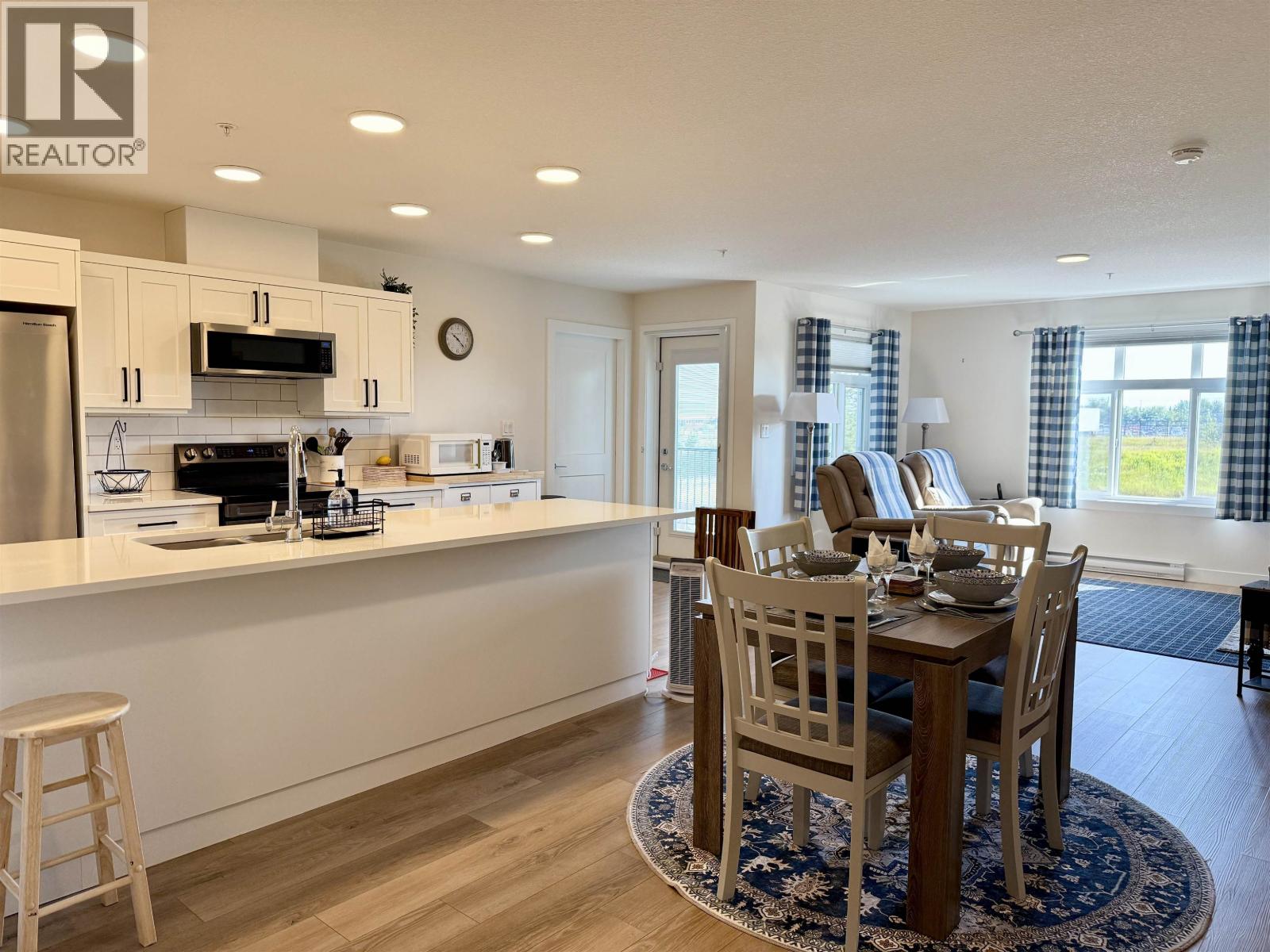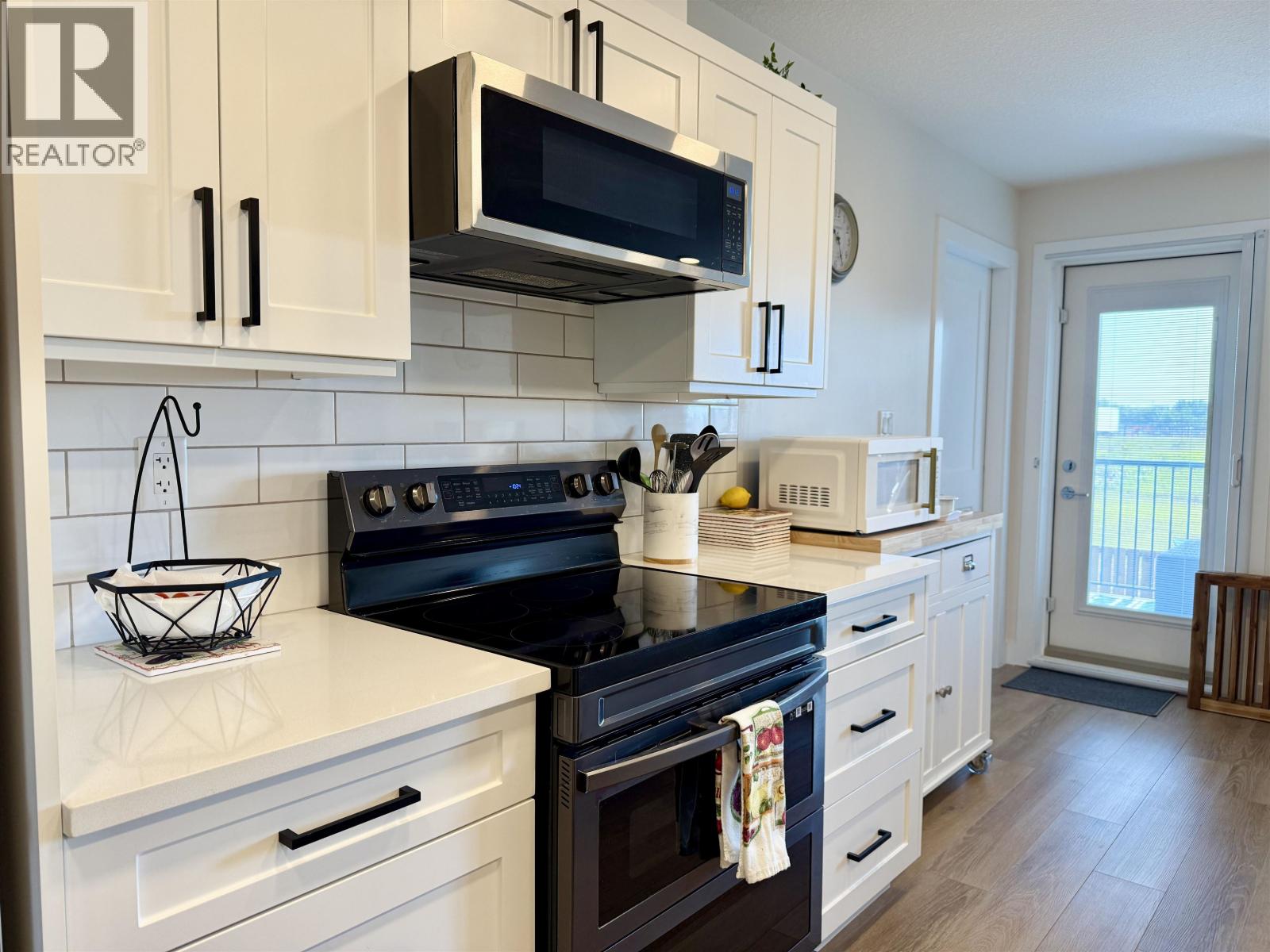 * PREC - Personal Real Estate Corporation. Sought-after east-facing condo near CN Centre. This 2 bed, 3 bath first-floor unit is designed for comfort and function. The open-concept layout showcases a stylish kitchen with light cabinetry, quartz counters, and a spacious island with seating—ideal for everyday living or entertaining. Both bedrooms feature their own private bathrooms, while the primary suite impresses with a walk-in closet and full 4-piece ensuite. Extras include a large pantry, in-suite laundry, glass shower doors, & quality finishes like durable vinyl plank flooring and cozy bedroom carpet. Fridge & blinds 2025. Step out onto your 100+ sq. ft. balcony with east exposure, where you can enjoy views of the rodeo grounds with thoughtfully planned privacy. Enjoy summer music concerts on your deck. Pets & rentals allowed. (id:44393)
