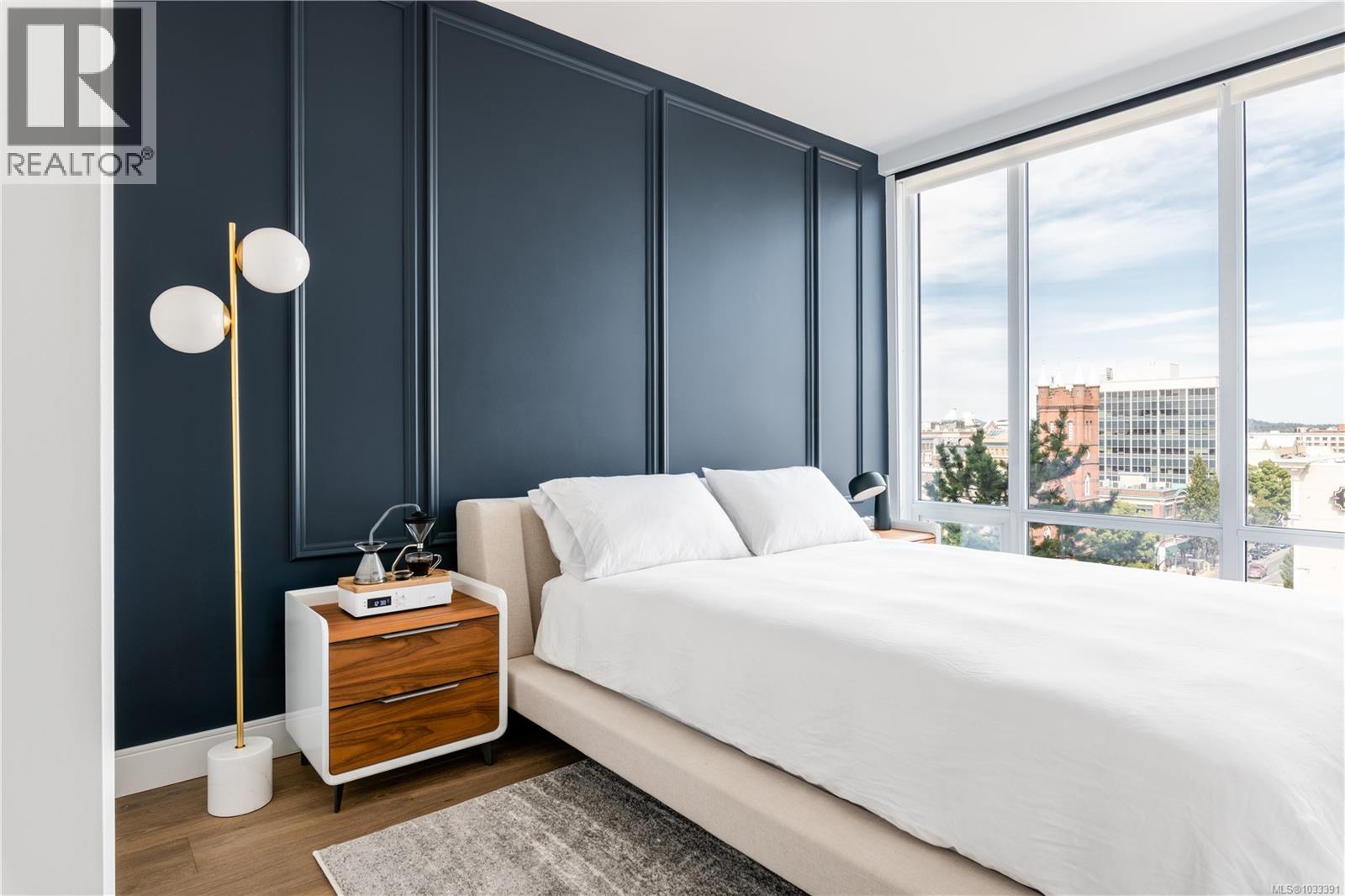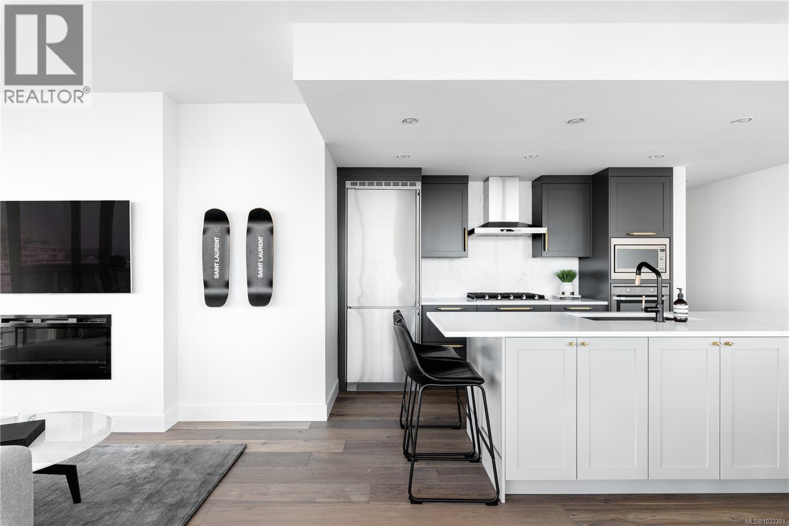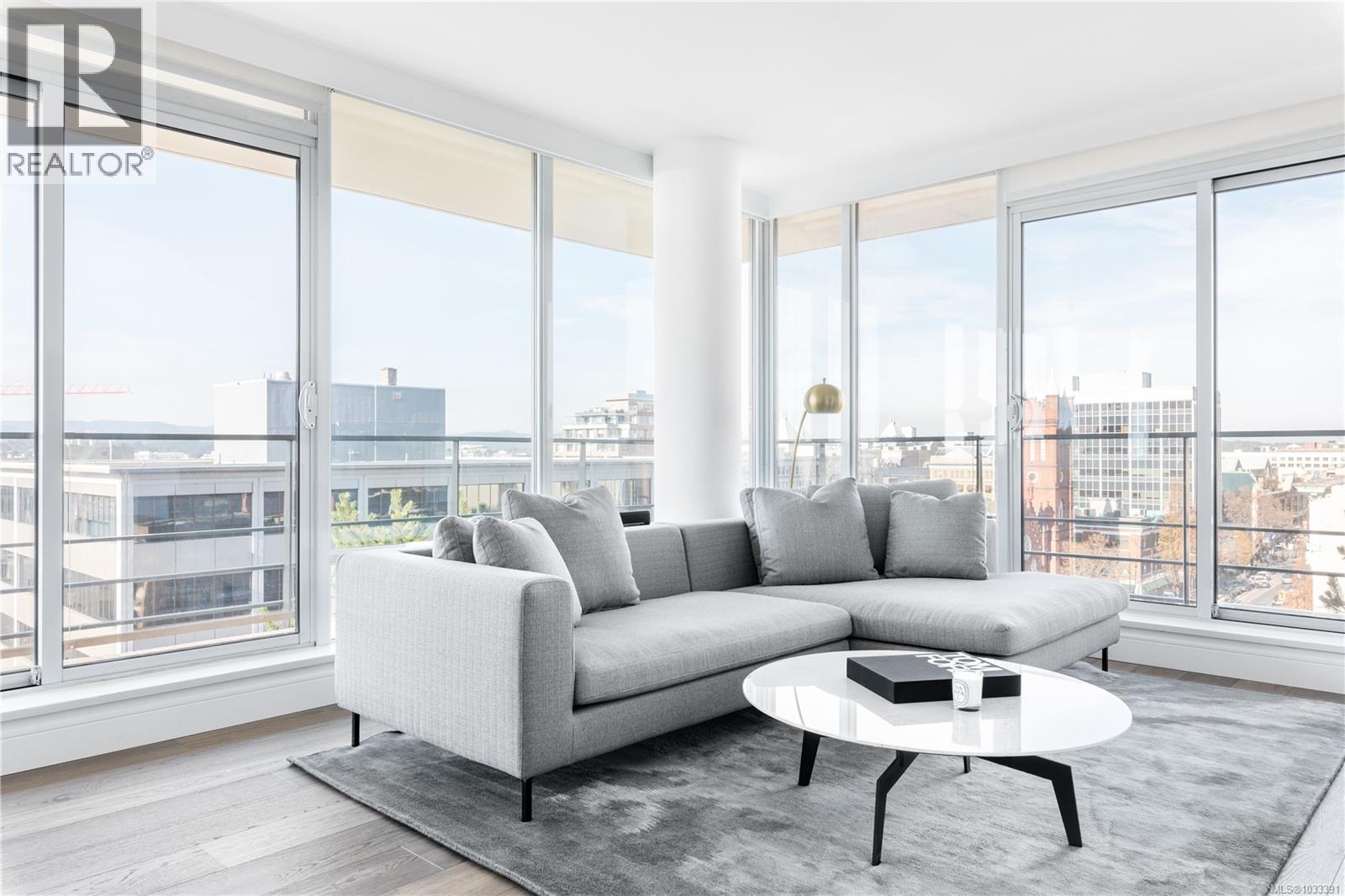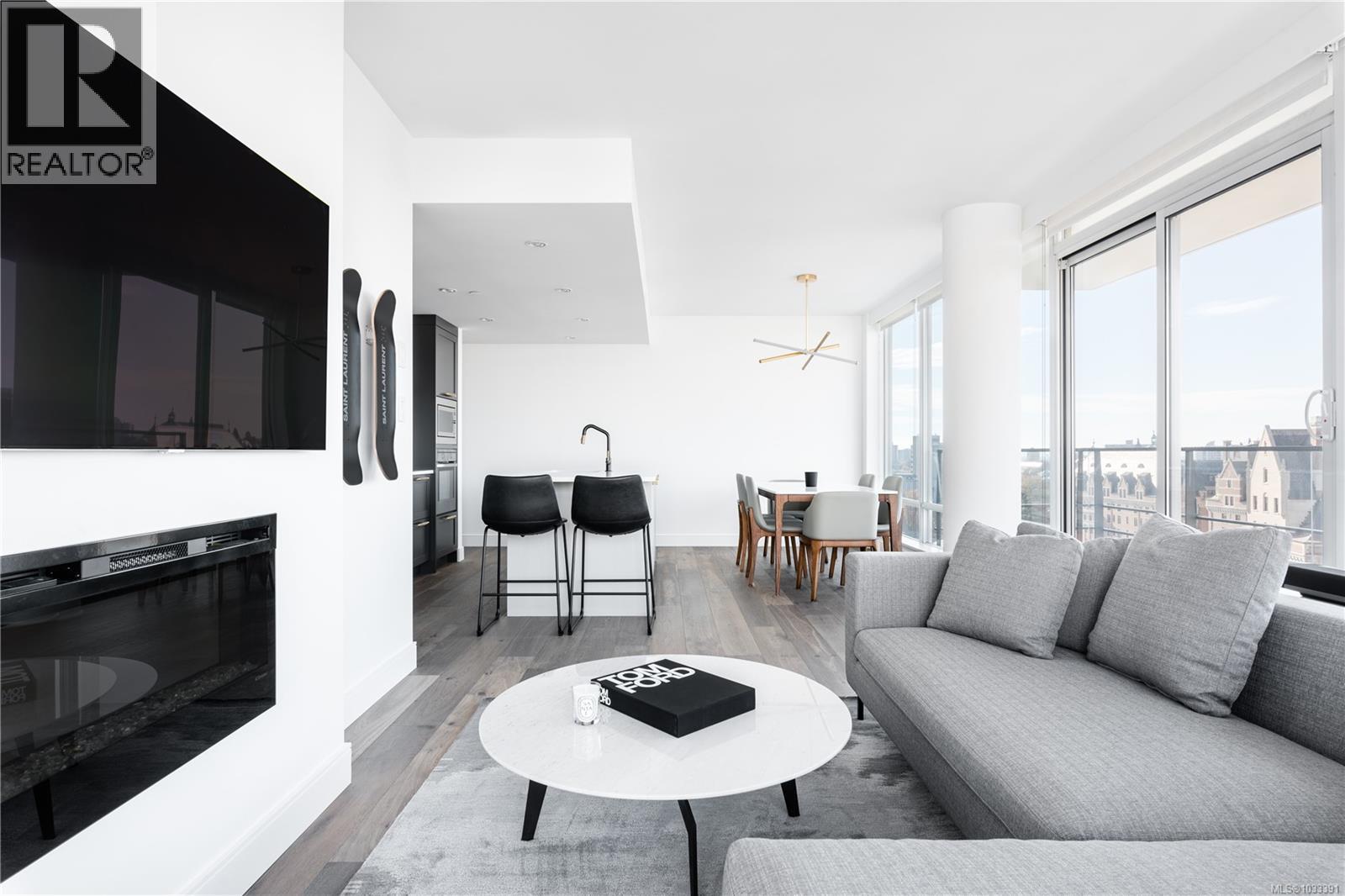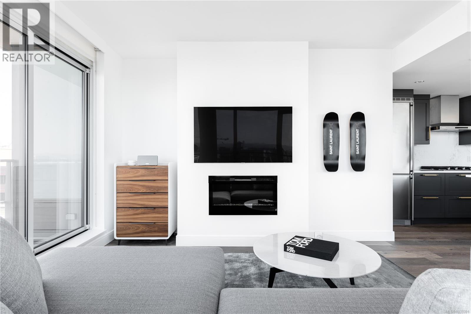 $827 MonthlyThe most refined and design-forward offering currently available at The Falls. This is 1105, a corner, harbour-sunset-facing 2-bedroom + den, 2-bath, in-suite storage room, and nearly 1,200 sqft of magazine-featured interior space. This custom residence stands apart with tailored upgrades and bespoke detailing throughout. Fully reimagined in 2021 with curated materials: real wide-plank walnut hardwood floors, custom Thomas & Birch kitchen millwork, quartz countertops, Buster+Punch hardware, and updated appliances. A modern fireplace anchors the living space, framed by in-set LED wall lighting. Functional updates include new heat pump w/ AC, new full-sized laundry, and two-layer blackout blinds in each bedroom. A true turn-key home w/ high-end furniture included and exclusivity to upscale amenities - pool, hot tub, and gym. Located steps from Victoria’s best dining and cultural landmarks, Unit 1105 is a rare blend of unique & timeless design, function, and lifestyle. AIRBNB INVESTMENT AVAILABLE. (id:44393)