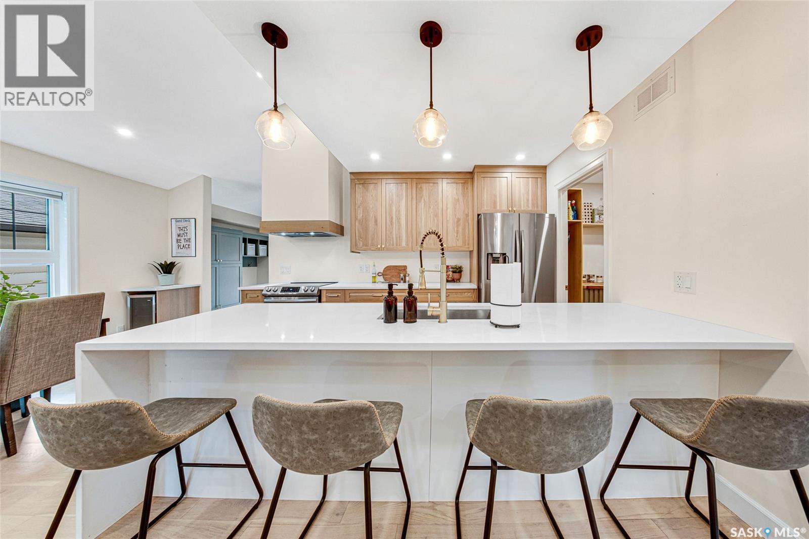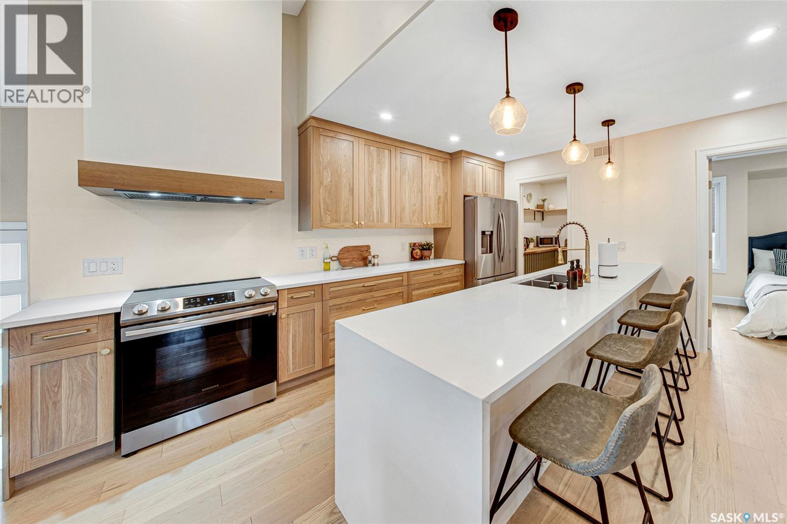 Welcome to this Holiday Park gem! This modern built 2 bed, 2 bath bungalow is sure to impress. Upon entering you are welcomed by the engineered hardwood flooring, the wood accents, the gold hardware, and the gas fireplace! The elegant kitchen will turn heads with quartz counter tops, custom cabinets, walk in butlers pantry and a wooden range hood. Master bedroom is warming with the wood work ceiling along with the eye catching tile in the ensuite. Other key notables: 2 car heated attached garage, 2 car detached garage, all appliances, heated ensuite floors, and there is a separate entry for a future possible suite (panel already installed) Located across from Gordie Howe Park, you can take advantage of the greenspace, the ball diamonds, the hockey rinks, the football fields, as well as being close to all amenities!! Don't miss out on this one!! (id:44393)