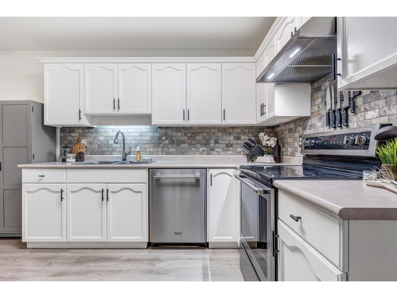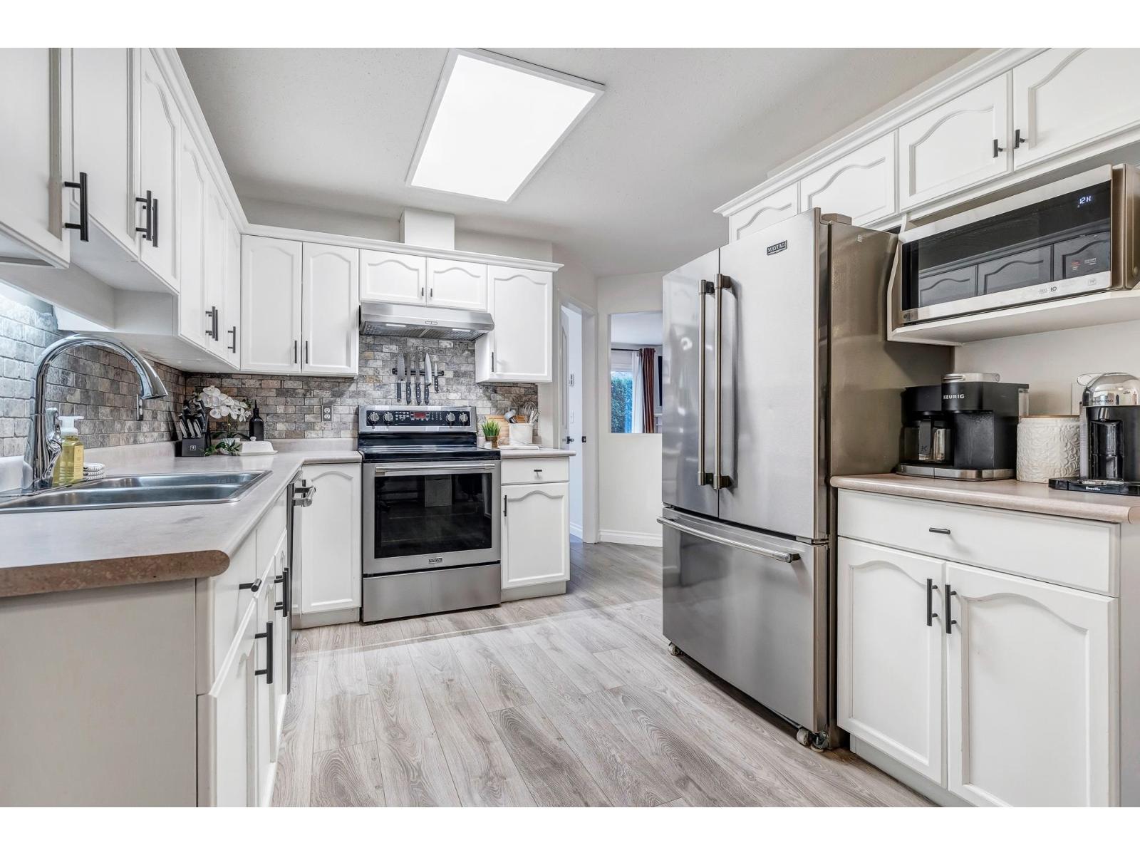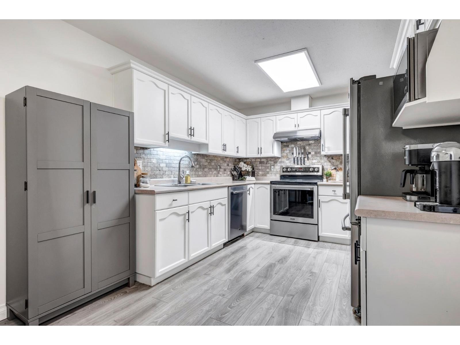 CHARMING 2 bed, 2 bath townhouse in a PRIME location - close to schools, transit, shopping AND MORE! This lovely unit boasts a FABULOUS layout w/laminate flooring and AMPLE natural light throughout! The pristine kitchen features nice white cabinets, chic tiled backsplash, stainless steel appliances, and TONS of room to cook OR entertain! The cozy living area has easy access to the back patio area and a gas f/p - not to mention, a generous dining area. Enjoy the stylish master bedroom w/grey wainscoting, large windows for extra daylight, and a 2 pc ensuite! Followed by another sizable bedroom, full 4 pc bath, large laundry room w/b.i. shelving, newer washer and dryer, AND room for storage! Don't let this one get away from you - book your showing today! * PREC - Personal Real Estate Corporation (id:44393)