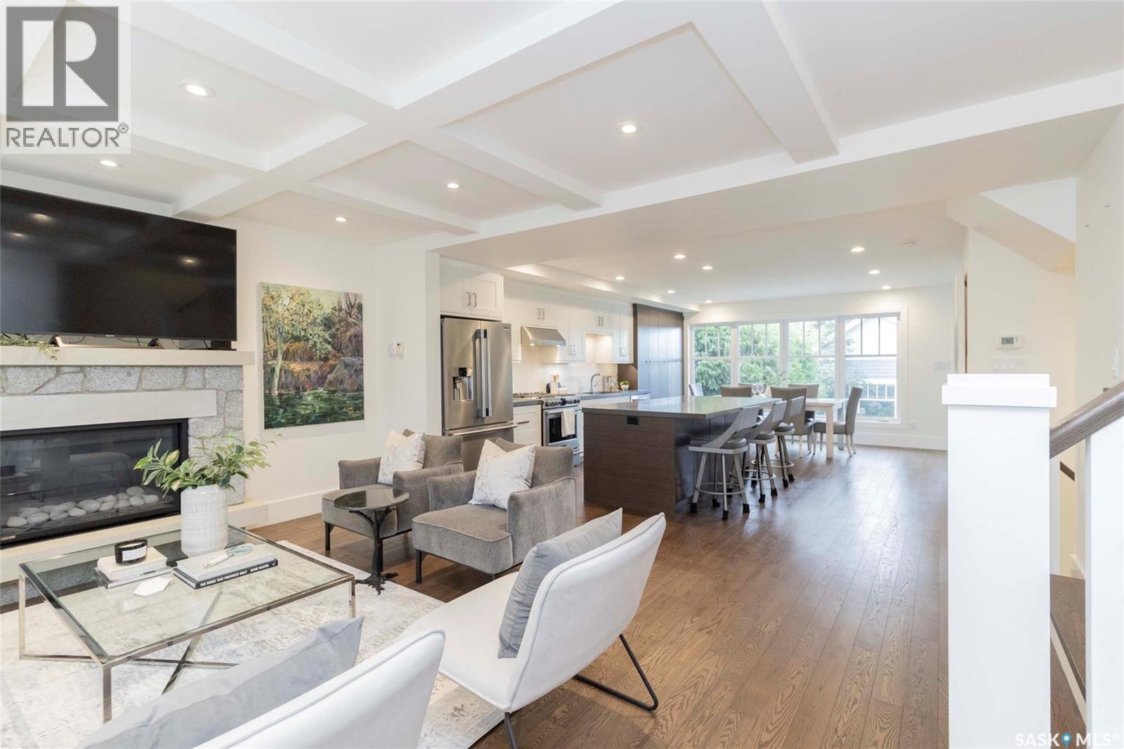 Welcome to 1315A 11th St E, a thoughtfully designed Craftsman-style home that blends timeless elegance with modern energy efficiency. This home is built with high quality finishes, and you can see it in the details. The main floor boasts a chef’s kitchen with custom cabinetry, a large island topped with 2" bluestone, and premium appliances including a gas range, and Miele speed and steam ovens. The bright living room features coffered ceilings, a gas fireplace with masonry surround, and large south-facing windows. Upstairs, the primary suite includes vaulted ceilings, skylights, and a spa-inspired ensuite with a walk-in tile shower. The bathrooms feature floating bluestone vanities, with a jet tub in the main bath. The spacious secondary bedrooms offer ample storage with built-in shelving and in-closet lighting. The basement is filled with natural light thanks to oversized windows and timber-framed window wells, and includes a home office, family room, and generous storage. Oriented to maximize passive solar gain, the home features natural materials, radiant in-floor heating on all levels, dual insulation (spray foam and reflective), and an offset stud wall system to eliminate thermal bridging. The professionally landscaped yard is finished with bluestone tile, LED lighting, and low-maintenance micro-drip irrigation. A heated, insulated double garage provides space for two vehicles, plus an additional driveway in front and parking behind the garage. A rare blend of beauty, efficiency, and craftsmanship in a prime location! (id:44393)