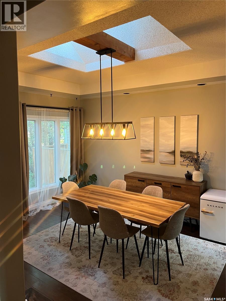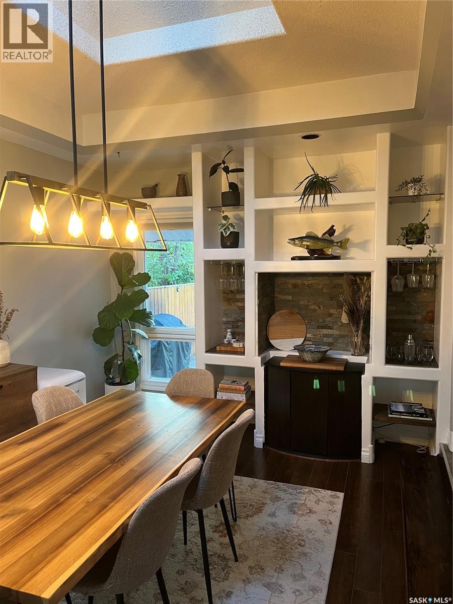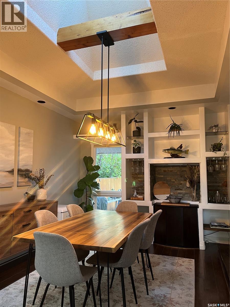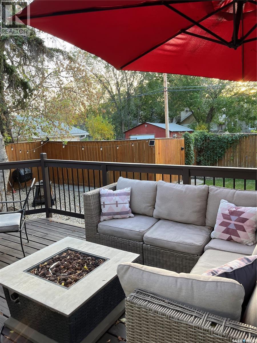 Absolutely beautiful one of a kind, spacious two bedroom one bathroom bungalow with true character. The original home had two additions in 1979 and 1981 with a beautiful dining room feature a beautiful sky light and feature shelving, as well as a spacious living room with cathedral ceilings and a wood fireplace in a fieldstone feature wall. This home features quality finishes. The backdoor opens out onto a spacious wraparound deck facing a beautifully landscaped and fenced backyard. Included in the sale is a patio table with chairs, a sectional, propane fire table, and two large umbrellas. The Smart Thermostat is included.There is a convenient lean too shed attached to the north side of the home. There are two parking spaces off a paved back lane. Plenty of space for a future double garage. We have the building plans from the City of Regina for both the dining room addition and the living room addition, that indicate that their foundations are built on piles, with crawl space. We also have an Engineer’s Certificate. Showings are easy to book on Broker Bay. (id:44393)