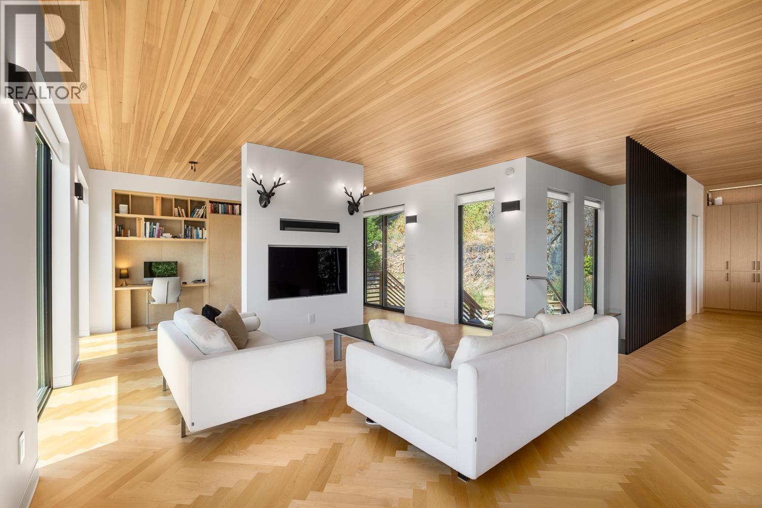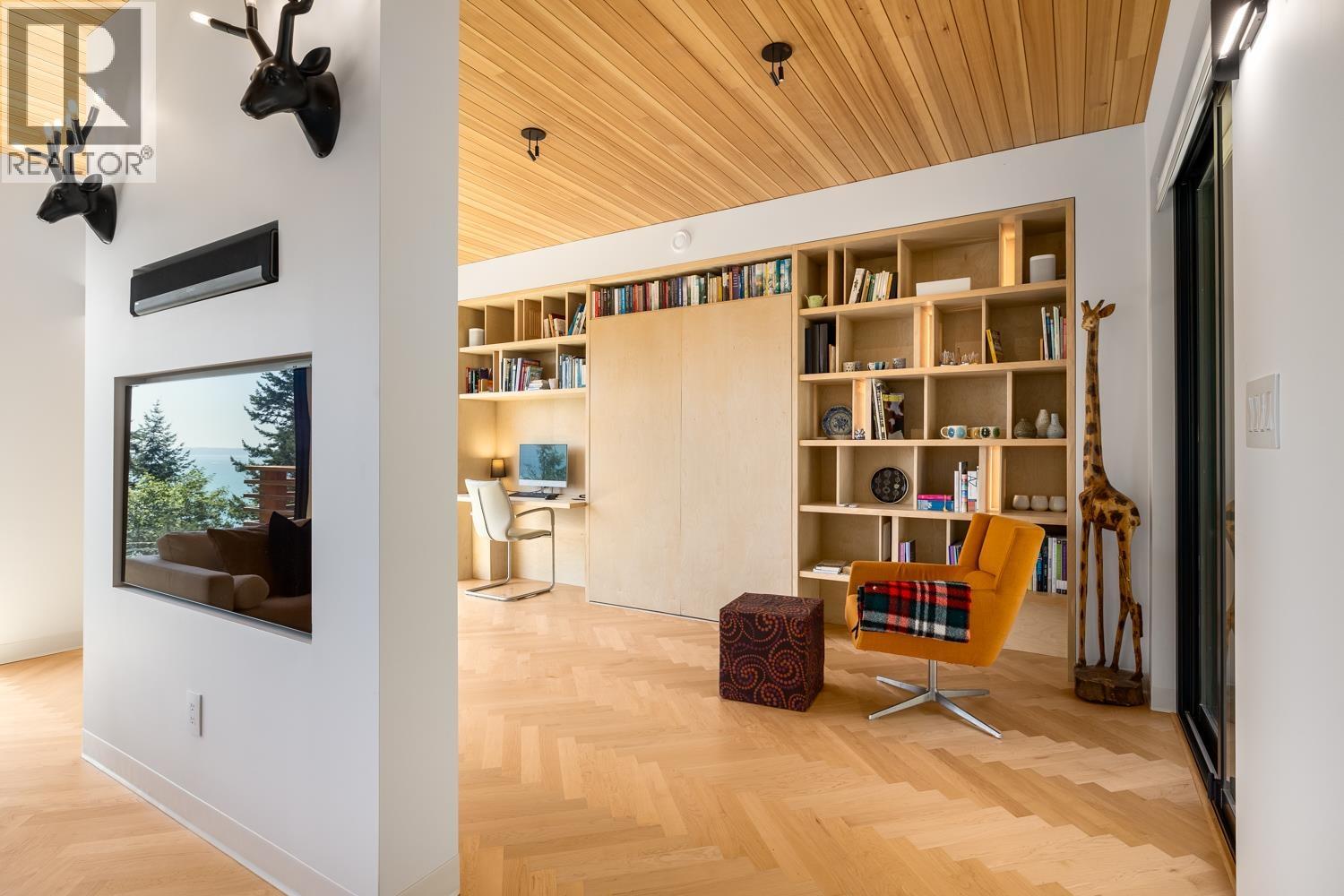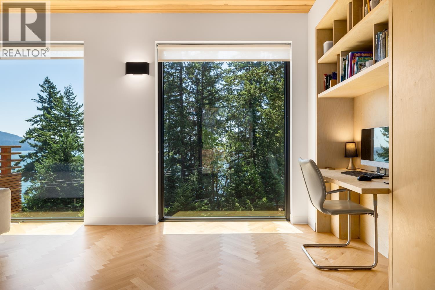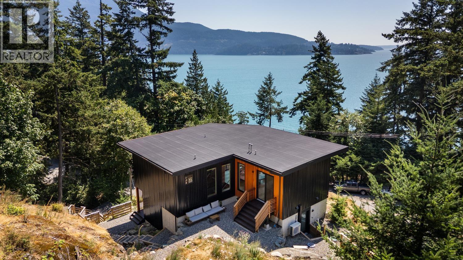Step inside this sleek, thoughtfully designed home and immediately feel a sense of calm. Polished concrete floors on entry; to the upper level Canadian Maple flooring, in the distinctive herringbone pattern; sets the foundation of quality and excellence surrounding you. South facing oversized windows overlooking Howe Sound will catch your attention. Overhead, the clear Hemlock ceilings, soffits and accent wall add to the refinement of this home. Local custom millwork and architectural lighting further elevate. A murphy bed in the flex space creates room for guests. Built to Step Code 4, with Passive House airtightness and home warranty in place, supports comfort and peace of mind. A five minute walk to Eaglecliff Community Beach & dock. On the bus route to/from Snug Cove ticks another box (id:44393)