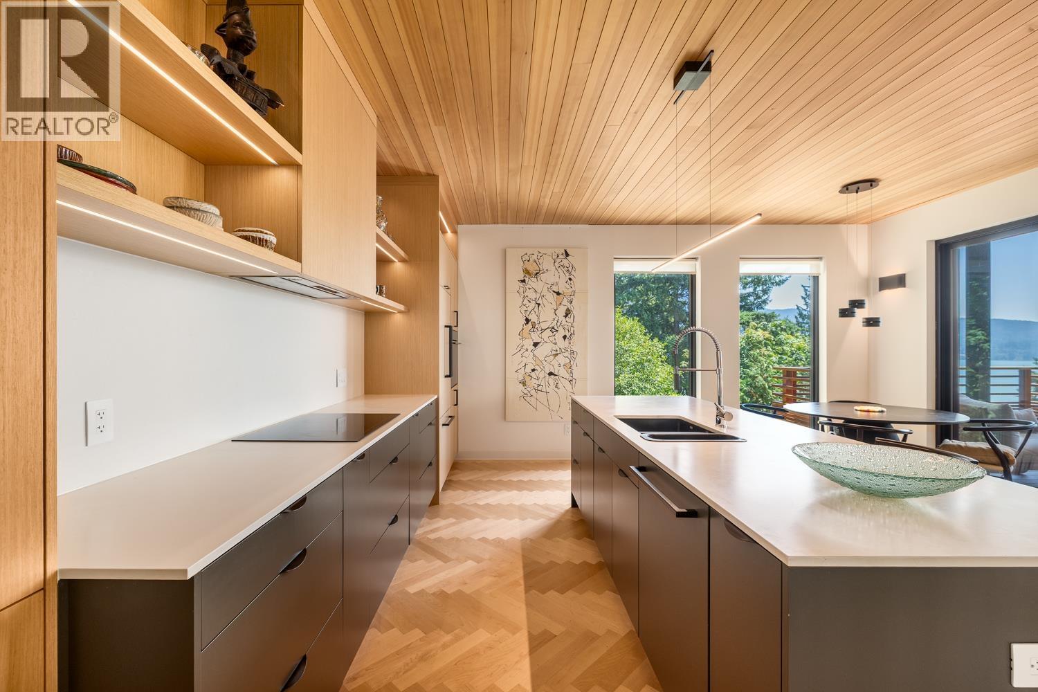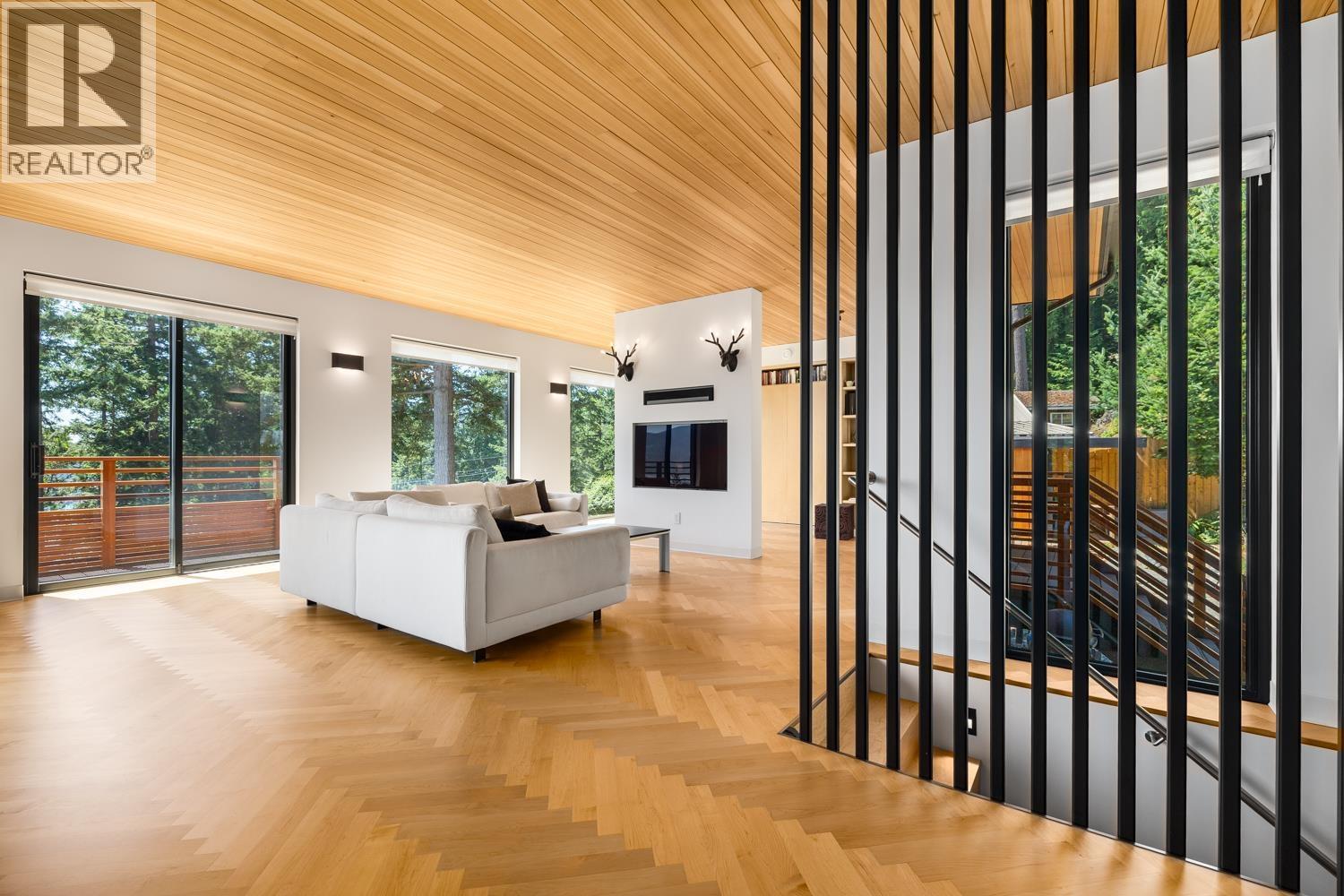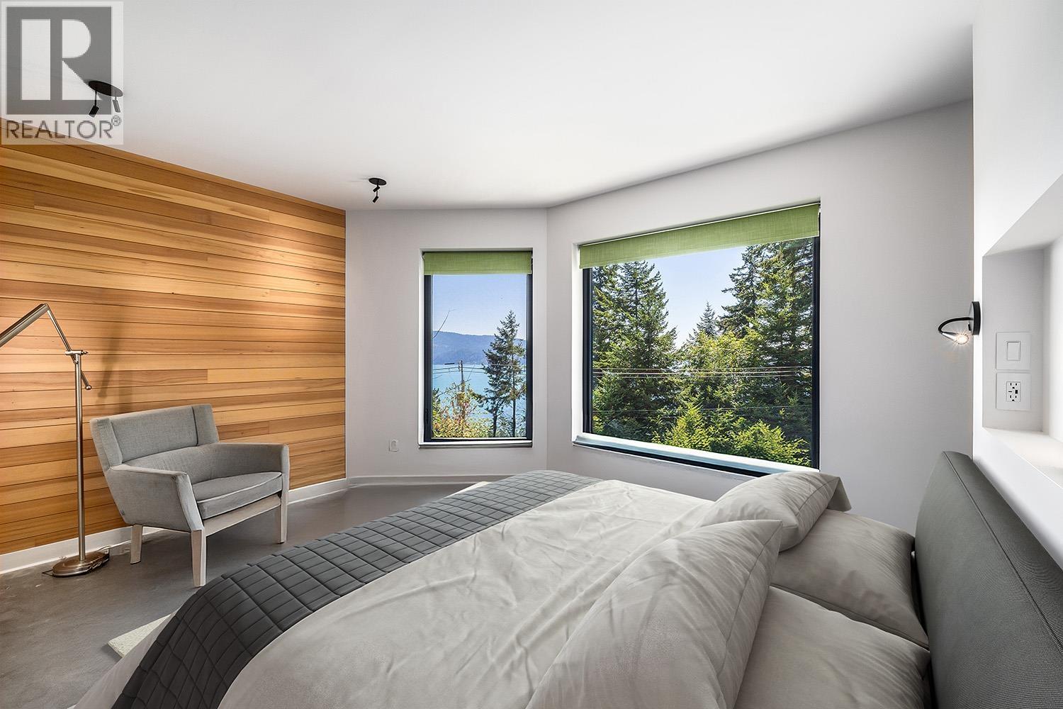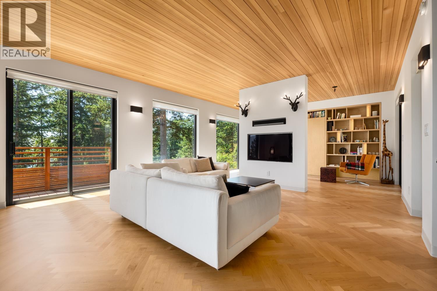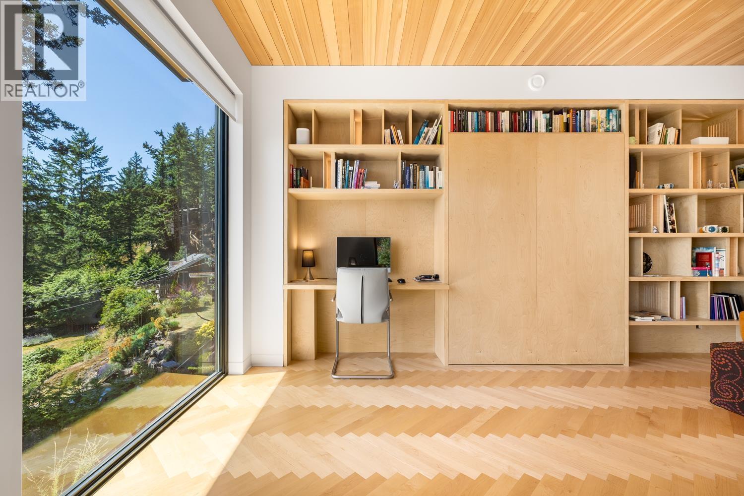 Step inside this sleek, thoughtfully designed home and immediately feel a sense of calm. Polished concrete floors on entry; to the upper level Canadian Maple flooring, in the distinctive herringbone pattern; sets the foundation of quality and excellence surrounding you. South facing oversized windows overlooking Howe Sound will catch your attention. Overhead, the clear Hemlock ceilings, soffits and accent wall add to the refinement of this home. Local custom millwork and architectural lighting further elevate. A murphy bed in the flex space creates room for guests. Built to Step Code 4, with Passive House airtightness and home warranty in place, supports comfort and peace of mind. A five minute walk to Eaglecliff Community Beach & dock. On the bus route to/from Snug Cove ticks another box (id:44393)