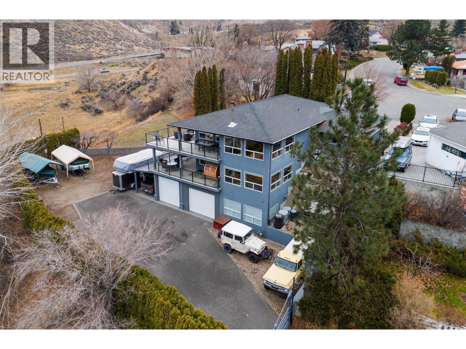 Perched at the end of one of the city’s most desirable cul-de-sacs, this remarkable executive home surprises from the very first step inside. From the street it presents as a modest rancher, but beyond the front door unfolds a meticulously designed 3,900 sq.ft. custom residence set on a rare 0.33-acre downtown lot. Thoughtfully positioned to capture breathtaking 220-degree panoramic views of the South Thompson Valley—from sunrise to sunset—the home is wrapped in floor-to-ceiling windows on both levels, bringing the landscape into every living space. Outdoor living is just as impressive with over 1,000 sq.ft. of covered and open deck space, complete with natural gas hookup, ideal for entertaining or relaxing while taking in the view. The main floor features a spacious primary bedroom with soaker jet tub, while the heart of the home is the Kitchen equipped with Jenn-Air appliances and a 6-burner gas range. Quality finishes include oak and tile flooring, high-efficiency furnace, central air, gas fireplace, wood stove, built-in vacuum, intercom, security system, and underground irrigation. Parking and workspace are exceptional with a street-level garage plus a rear high-bay heated shop exceeding 1,000 sq.ft. with parking potential for a fleet of vehicles and further development of this lot is possible A truly unique property combining estate-style privacy, incredible views, and quick possession available in a coveted downtown location. (id:44393)