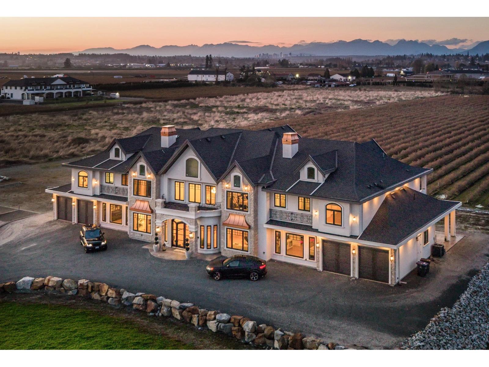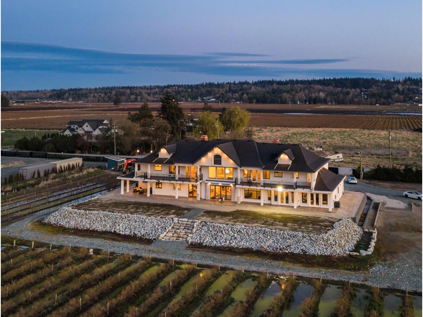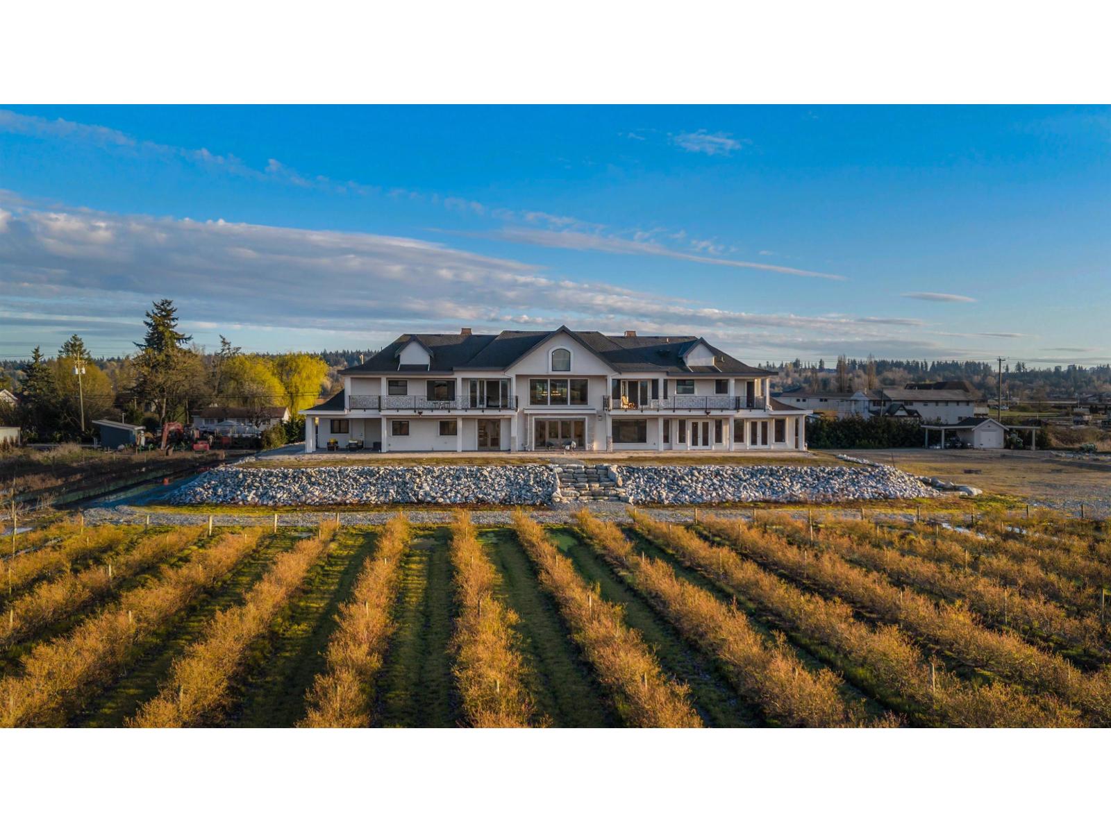 This sunny 9.41 Acre estate unites IRREPLACEABLE LUXURY w/country living in a coveted location. 11,000-SF dream home w/HIS+HERS GARAGES, 8.5 acres of established Liberty BLUEBERRY in a professional setup AND Foundation + approved plans for an ADDITIONAL 4,835-SF bldg! The main residence welcomes you with a custom plastered FORMAL STAIRCASE in a GRAND ENTRYWAY+ a feng shui WATERWALL. Soaring 25-FT VAULTED CEILINGS decorated w/architectural wood beams. Elegant interior design features a limestone fireplace, beautiful chandeliers, interior stone, & a lavish primary ensuite. 9 over-sized Bedroom Suites, Home Gym, Theatre, SAUNA, Wetbar + temp.controlled WINE CELLAR. Enjoy MOUNTAIN VIEWS from the walkout nano doors or upper balconies. Near PRESTIGIOUS AMENITIES w/easy access to hwys+border. (id:44393)