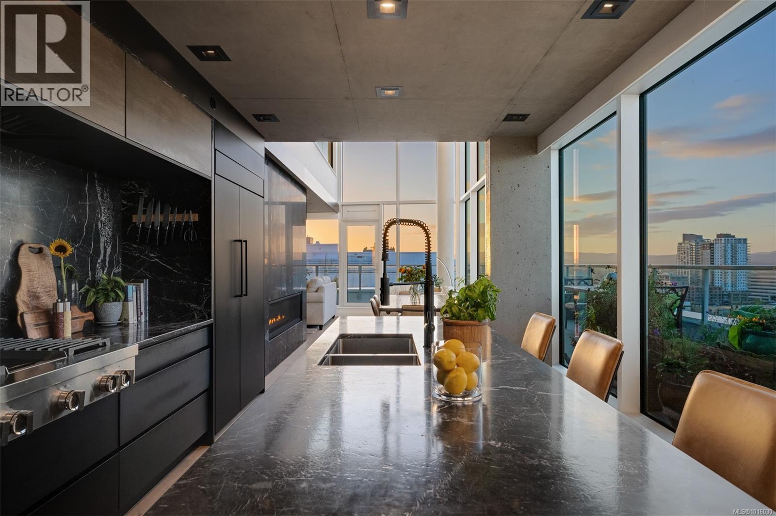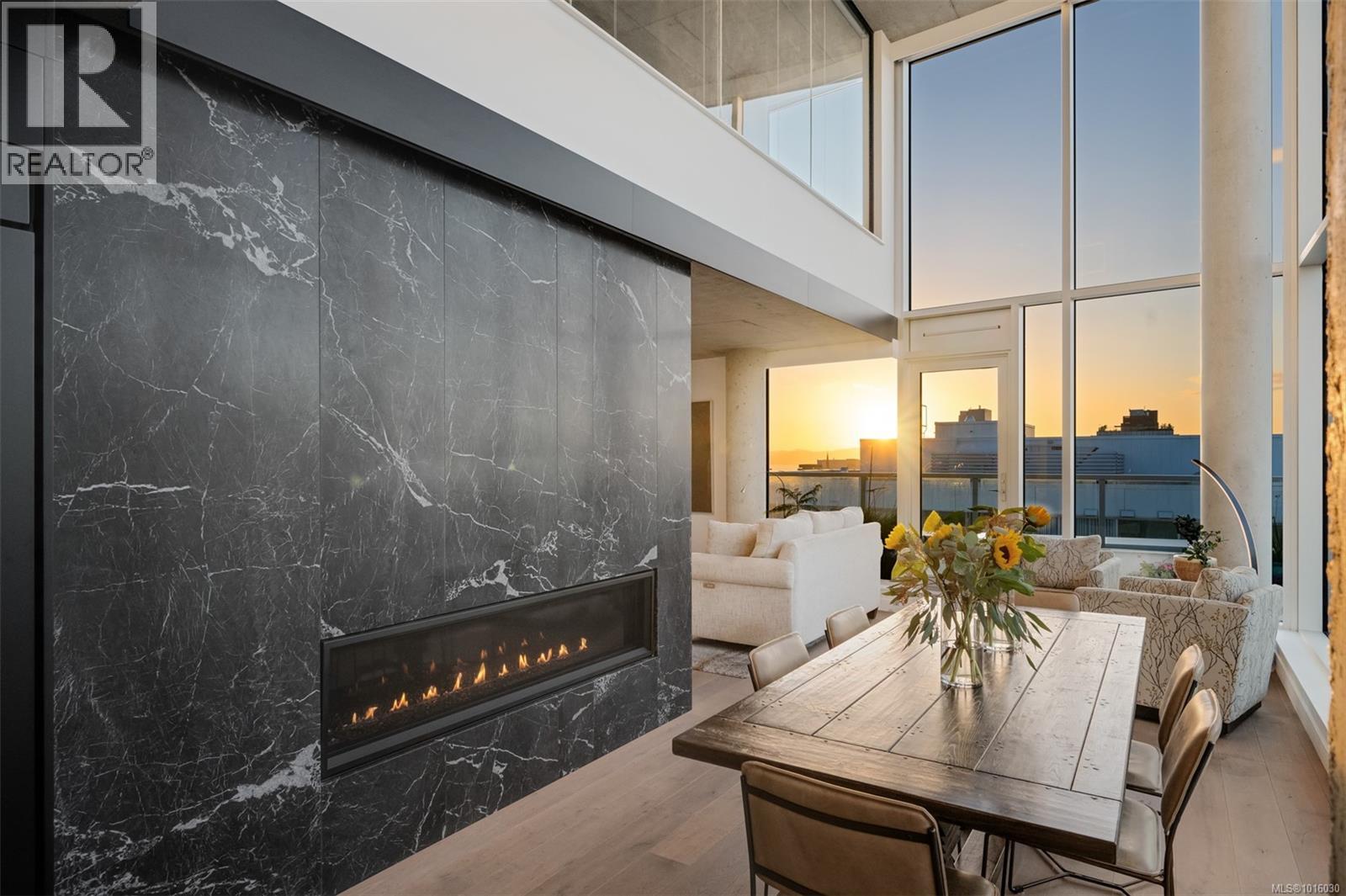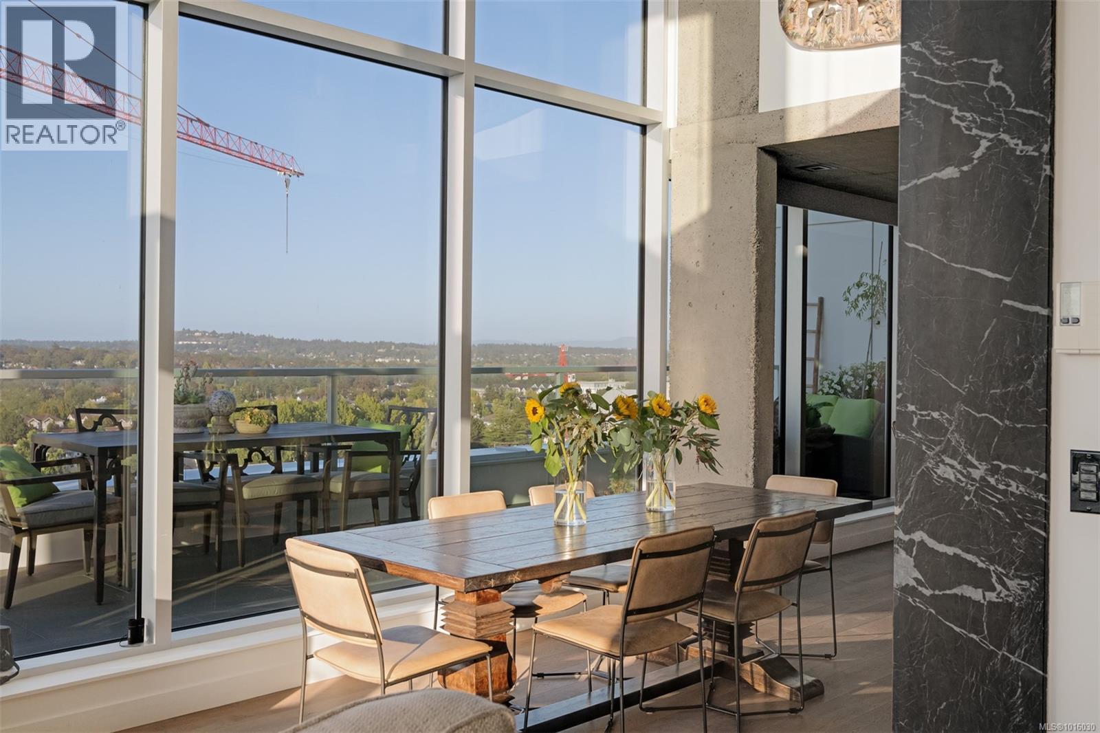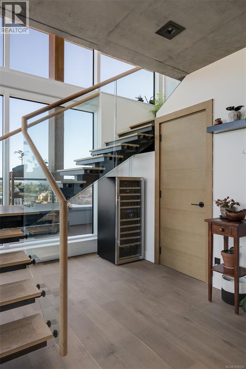 $999 MonthlyDiscover the ultimate penthouse lifestyle at 989 Johnson St in downtown Victoria. This stunning steel and concrete home spans 1,800 sqft over two levels with 17.5-ft ceilings. Floor-to-ceiling windows fill the space with natural light. The kitchen flows seamlessly into the open-concept living area, perfect for hosting or unwinding. Enjoy 270-degree views of mountains, ocean, and city, with three patios to take it all in, including two covered east-facing decks with electric blinds and water/gas hookups. High-end finishes and warm wood accents bring elegance to the industrial style, complementing three bedrooms and baths. The primary bedroom suite, complete with a luxurious ensuite, sits above the family room for unparalleled views. Just steps from restaurants, spas, and downtown amenities. This pet-friendly, rentable penthouse includes two parking spots and a large private storage unit. (id:44393)