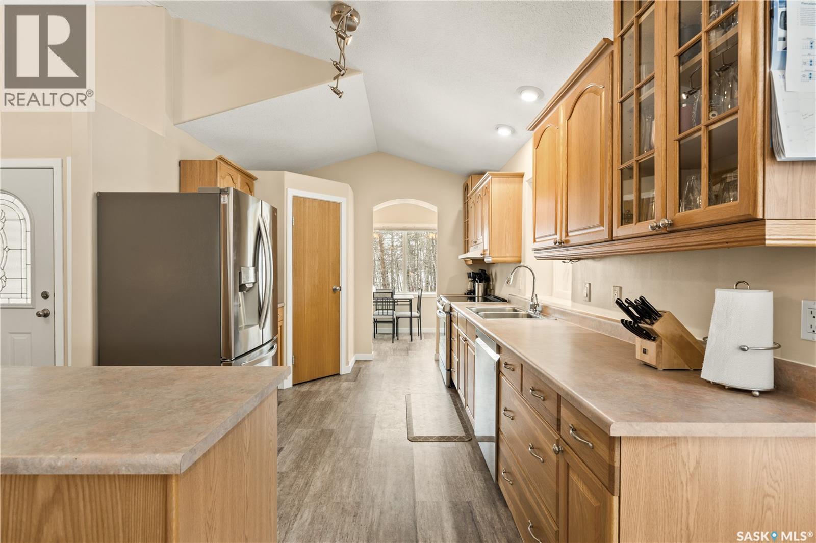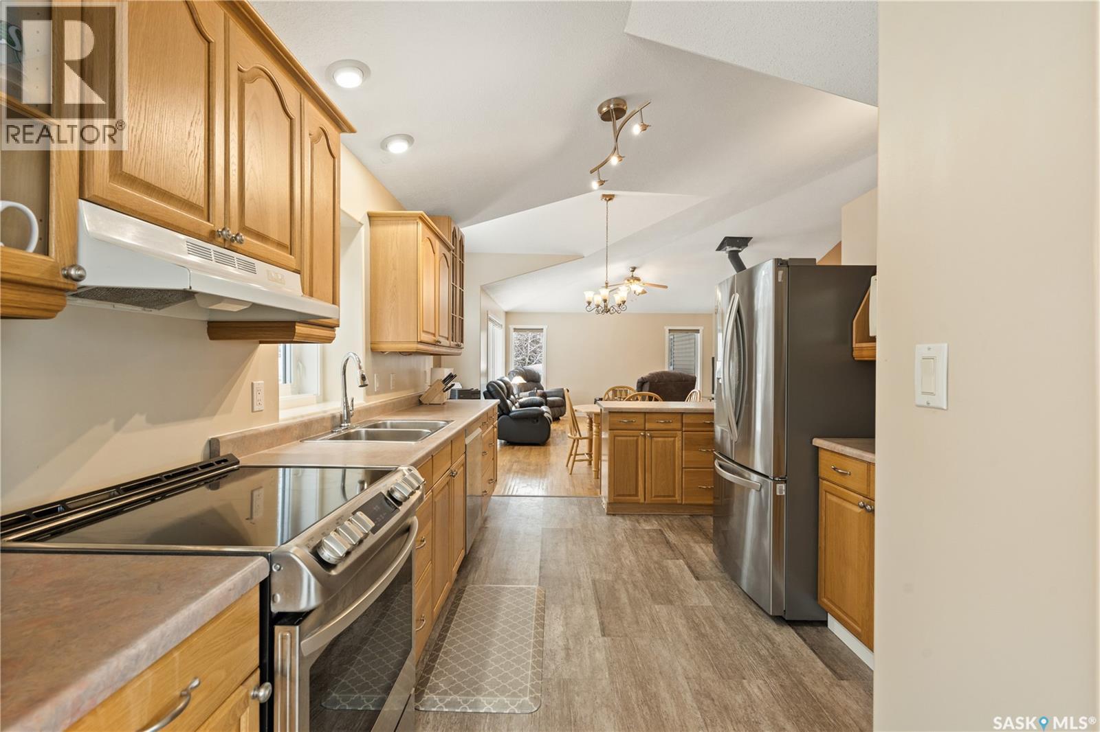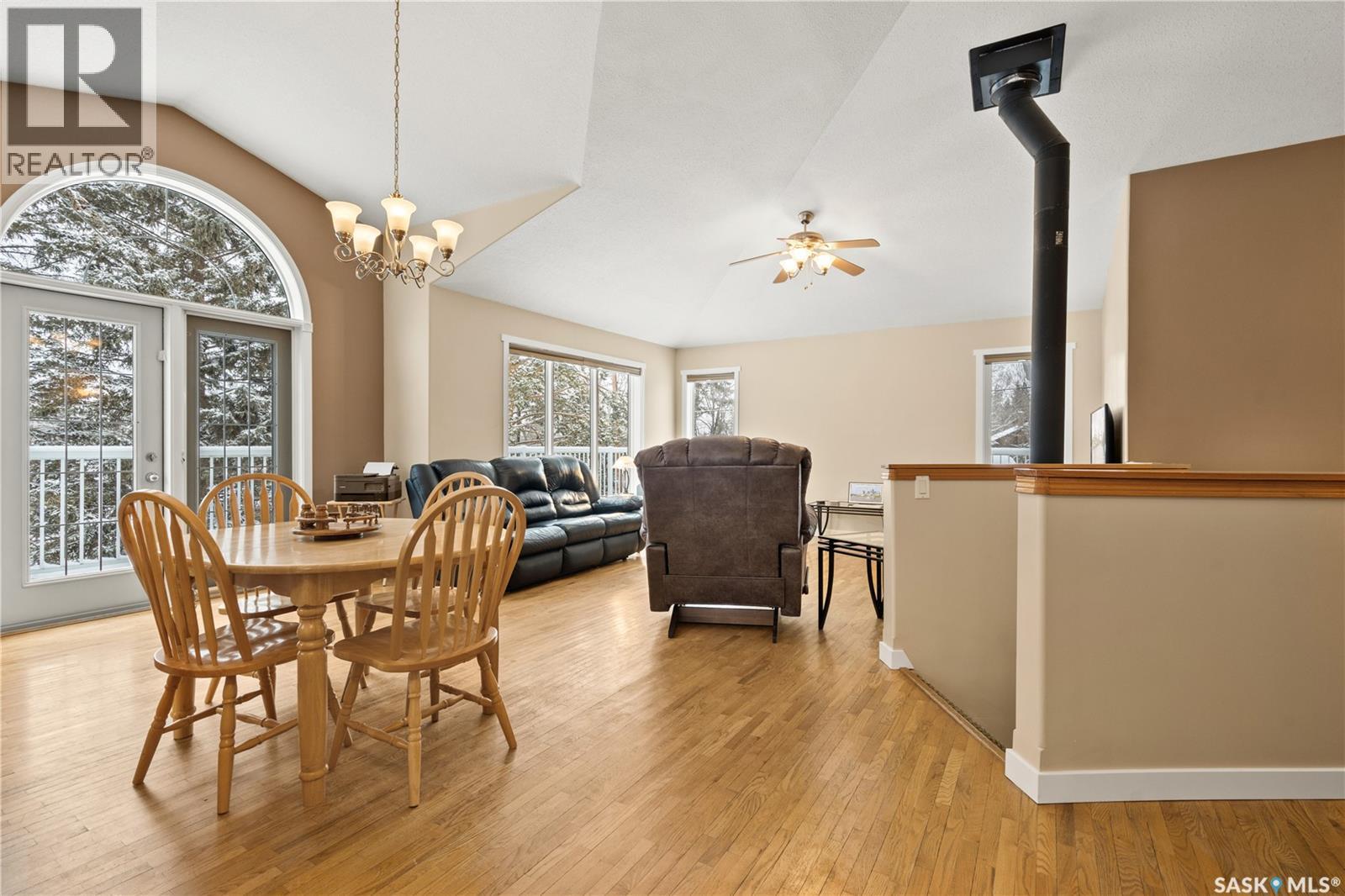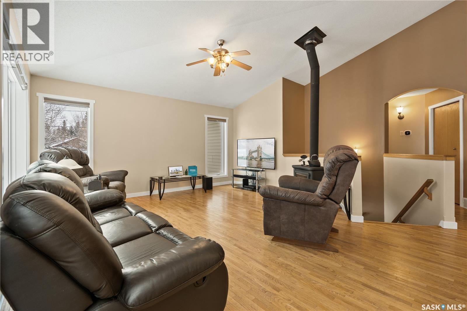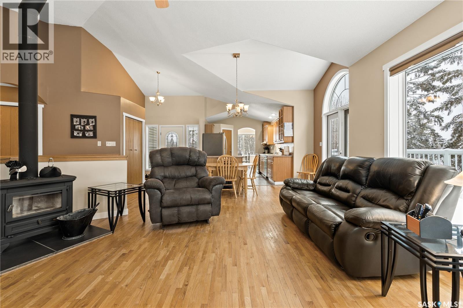 Pride of ownership is evident in this well-maintained home situated on three lots, offering four bedrooms and two bathrooms. With high vaulted ceilings and plenty of windows it fills the space with natural light and creating a bright, inviting atmosphere throughout the open-concept floor plan. The kitchen has new appliances, lots of counter space and a cozy breakfast nook. The main floor includes the primary bedroom, a second bedroom, the main bathroom, and laundry. Hardwood floors and a wood stove add warmth and character with doors that lead out to the large wraparound deck. The fully developed walkout basement provides additional living space with direct access to the backyard. Downstairs you’ll find two more bedrooms, a bathroom with dual shower heads, a large rec area, and in-floor heat. The home is also equipped with hot water on demand and secondary laundry hook ups. The double attached garage is heated and includes 220V power. Outside, you’ll find a garden area and a cozy fire pit area, perfect for evenings with family and friends. The property also includes a 12x18 shed, perfect size for lawn equipment and tools. This well-cared-for property offers space, comfort, and small-town living in a peaceful setting, conveniently located across from the K–12 school. (id:44393)