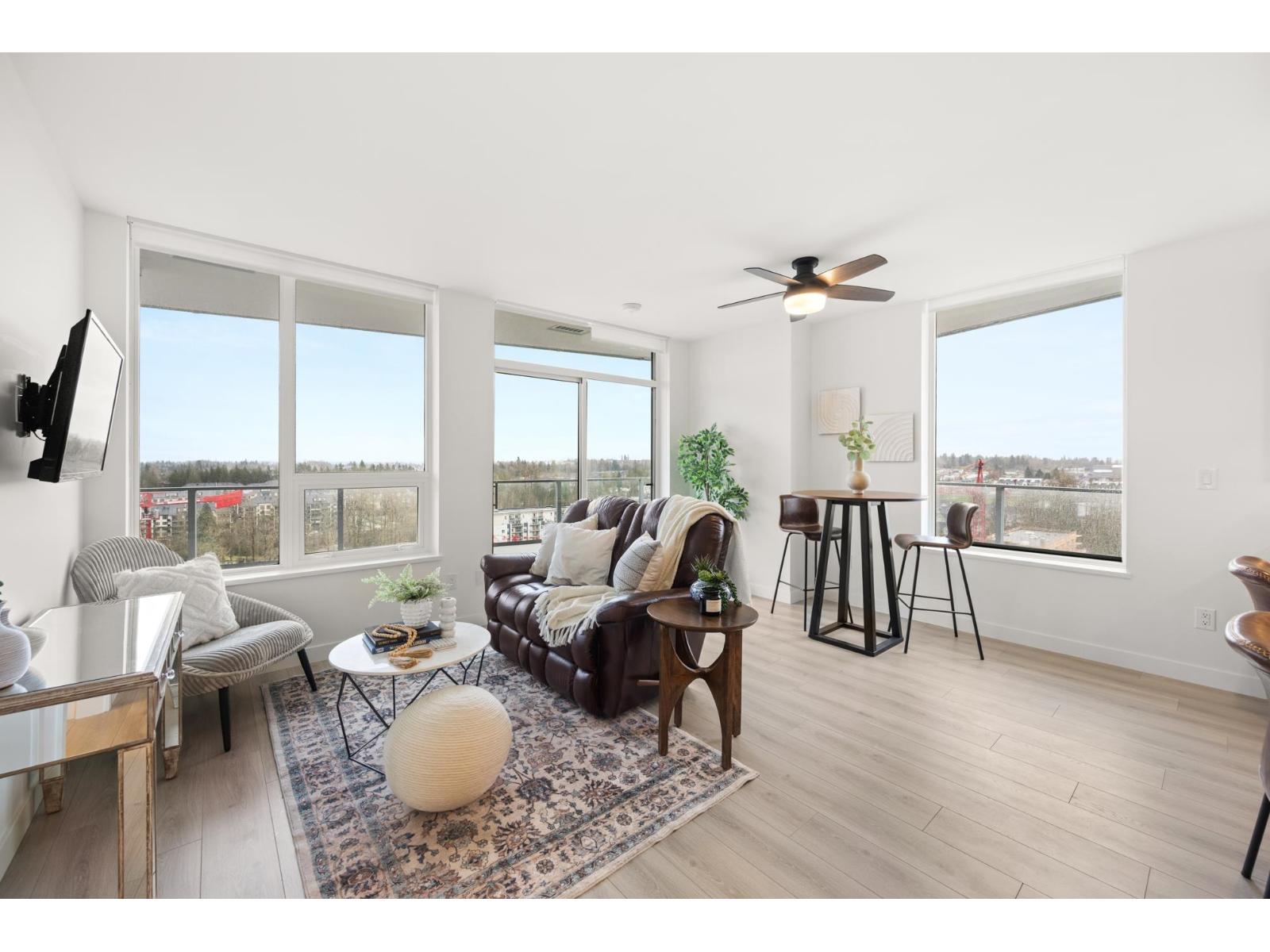 Soar above the city from the 18th floor at The Towers, Langley's first concrete high rise. This 1 bedroom + den corner suite captures incredible views of Golden Ears and Mt. Baker and features over 300 sq. ft. of wraparound patio space for seamless indoor outdoor living. The stylish kitchen is equipped with a large island and premium Fulgor Milano appliances, while the bright open concept design offers A/C, quality finishes, and a walk in closet in the primary bedroom. Complete with TWO PARKING STALLS!, EV ready charging, a storage locker, and impressive building amenities. Ideally located close to schools, transit, shopping, and Hwy #1 for effortless everyday convenience. (id:44393)