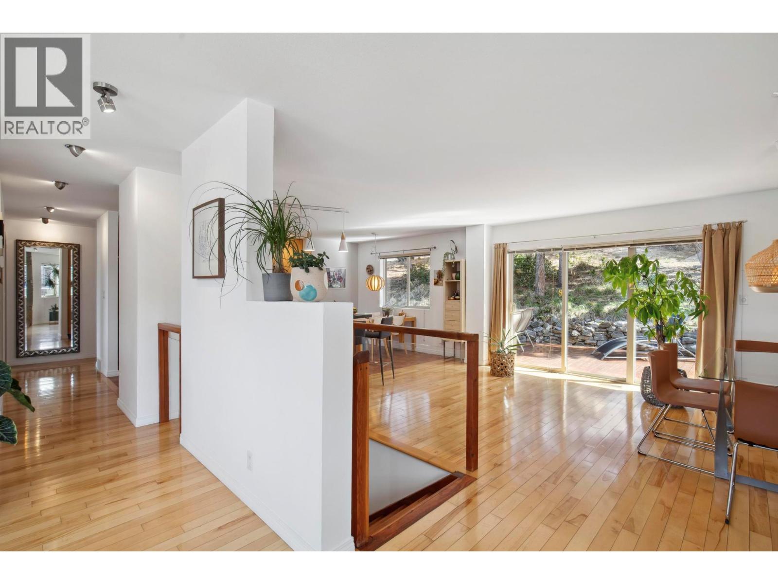 Located in the prestigious northern part of Magic Estates, this architecturally designed 4 bed 3 bath home offers gorgeous views of Okanagan Lake and the mountains. Designed to maximize natural light, it features oversized windows on all sides, bathing every room in daylight and offering stunning views from nearly every angle. With far more windows than a typical home, the design ensures a bright, open atmosphere throughout. Custom built with quality and longevity in mind, the home features a durable cement tile roof, offering fireproofing, exceptional thermal mass, and superior insulation for year-round comfort and energy efficiency. The spacious foyer leads to Douglas fir stairs with glass railings, opening to the upper level. Solid hardwood and ceramic tile floors provide timeless elegance. The living area boasts a cathedral ceiling, a gas stove on a stone feature wall, and panoramic lake and mountain views. A 180 sq. ft. covered balcony is perfect for relaxation. The kitchen offers ample counters, a gas range, and custom-built cabinetry for style and functionality. The dining room opens to a red cedar deck and tranquil low maintenance yard with mature trees. The lower level includes a bright office or studio with large windows, a spacious gym that can double as a theater, music room, or flex space, a 4th bed, a 3rd bath, and laundry. Offered for sale for the first time, this home reflects exceptional care and attention to detail, with easy access to Knox Mountain Park. (id:44393)