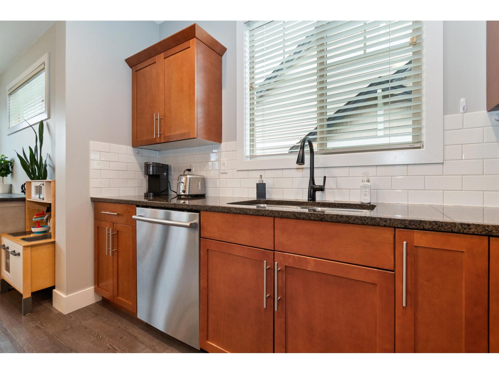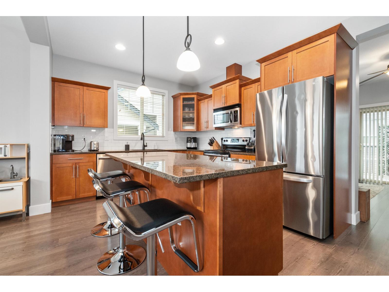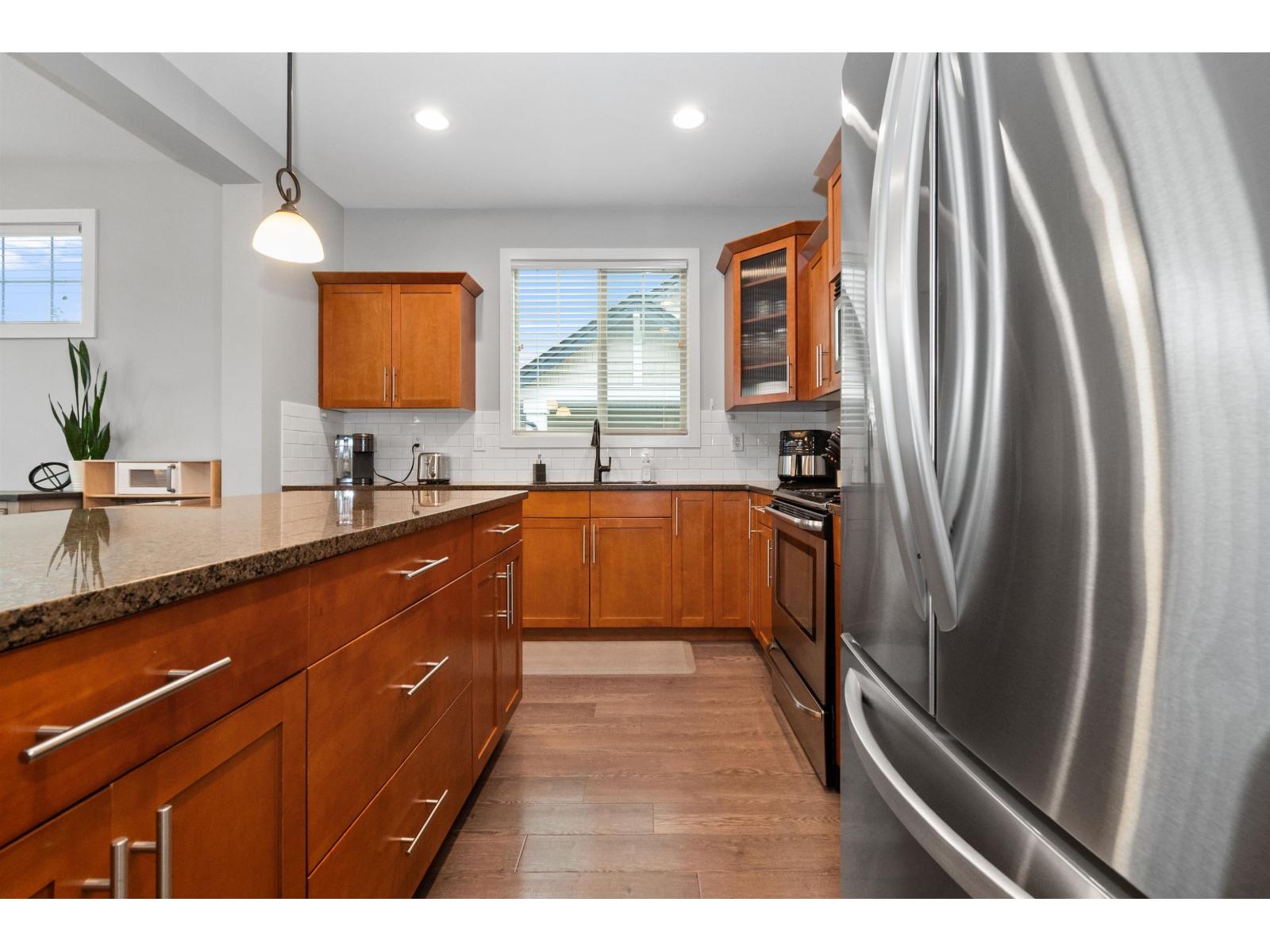 Pristine, bright END-unit townhome offering over 2,027sqft in convenient central location. Main floor features 9' ceilings, wide plank laminate flooring, a spacious kitchen w/ample cabinetry, large island, stainless steel appliances & expansive dining area + powder room. Plus a huge lvgrm w/elec fireplace, + access to balcony! Upstairs, enjoy an oversized primary bdrm w/ensuite & walk-in closet, laundry(new W/D) & 2 big bdrms w/full bath. The lower level incl lrg recrm (4th bdrm?) w/4-piece bath & sliders to patio & south facing fully-fenced yard. Single garage + lrg pkg pad & handy visitor pkg beside. Small, family-friendly 8-unit complex, mins to shopping, restaurants, schools & all amenities. Shows beautifully! Heat pump (3yo), HWT(2021), strata $479.54/mo & 2 small pets ok (max 14"). * PREC - Personal Real Estate Corporation (id:44393)