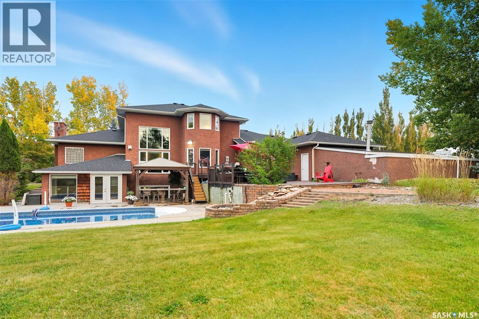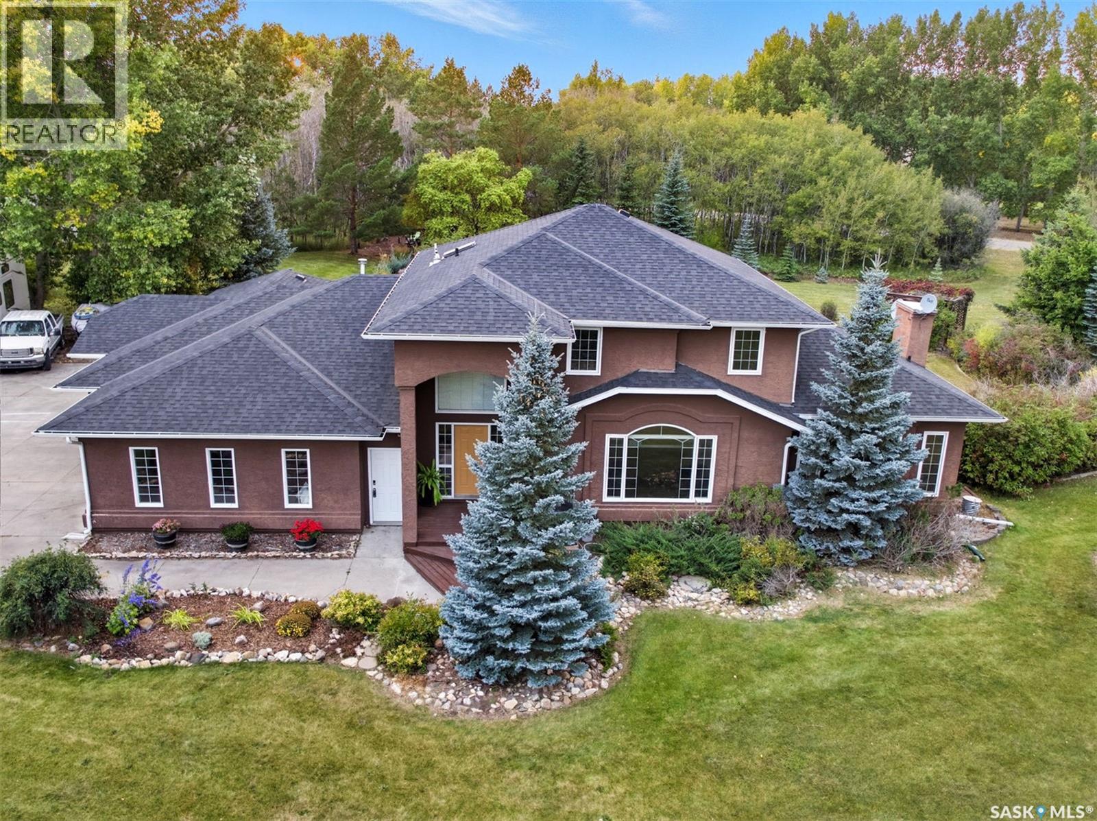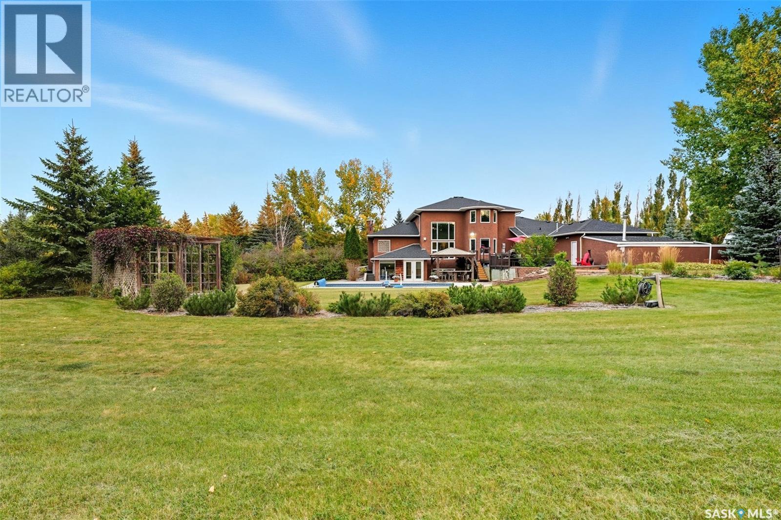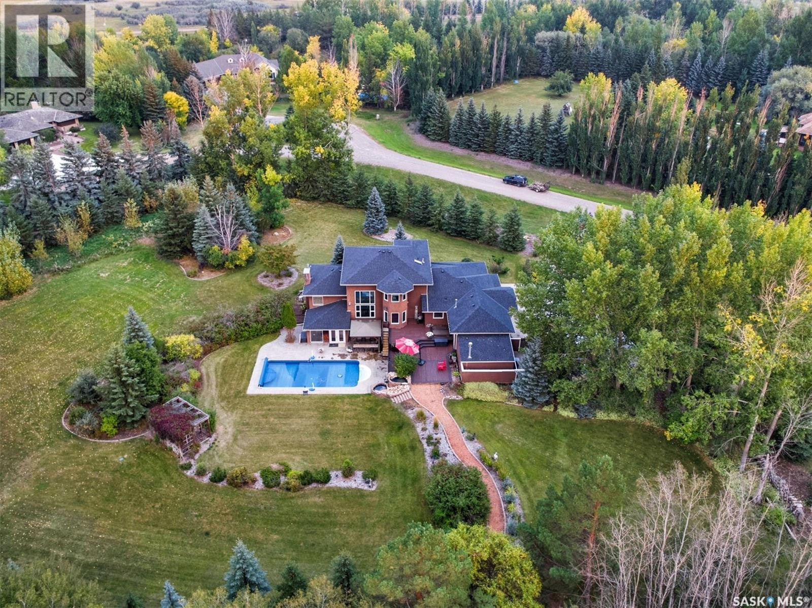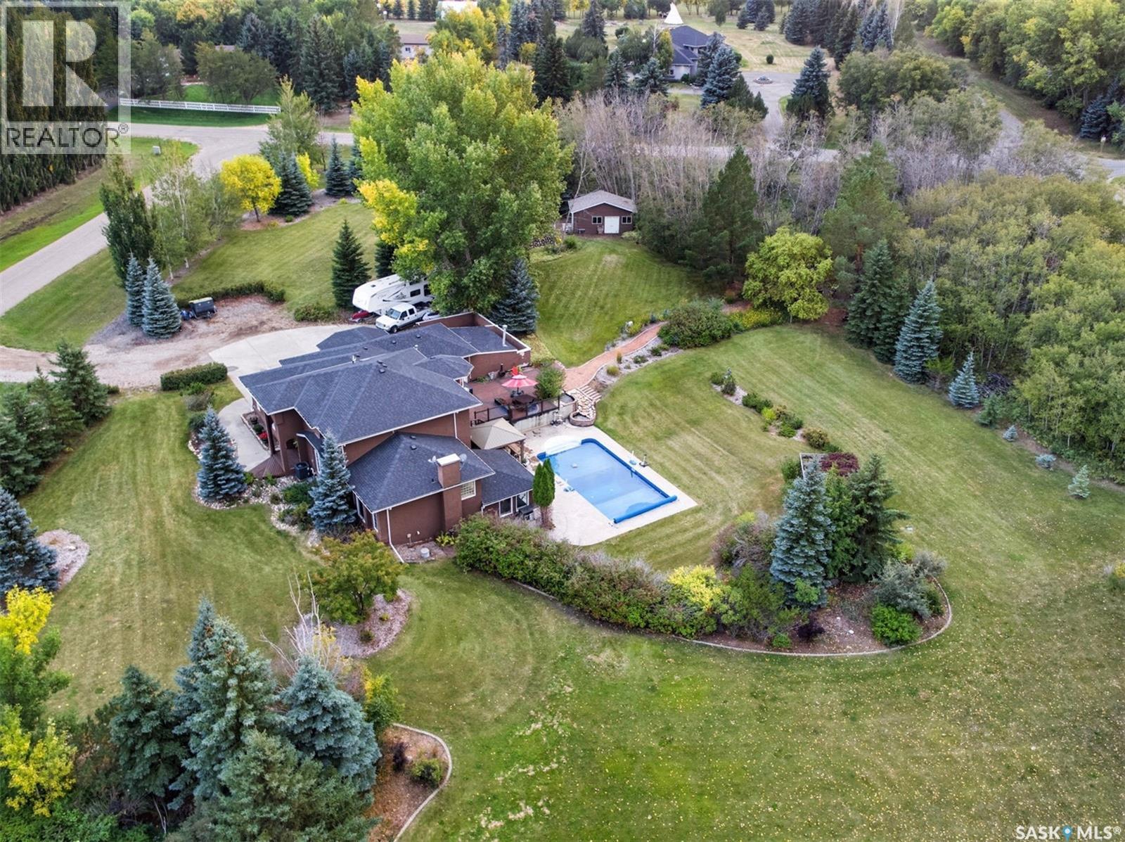Highly desirable CEDAR VILLA ESTATES!!! Only ONE km from city limits! Enjoy the serenity of country living with city convenience such as treated SK water and high speed fiber internet!! Well maintained 2 story split offers the perfect blend of luxury and tranquility situated on well treed 2.81 acres. This home is designed for function, style and entertaining. Gourmet kitchen with maple cabinets, granite counter tops including the island, tiled back splash + a pantry. Open into the Livingroom which offers cathedral ceilings and gas fireplace. Garden doors to multi-level deck. Separate formal dining room is great for hosting functions. Main floor laundry. Primary bedroom is on the main floor as well with 4 pc ensuite and walk-in closet. 2nd floor has 3 more spacious bedrooms and another 4pc bathroom. Plenty more space in the WALKOUT basement! Complete with a family room with built-in feature wall including a gas fireplace. Garden doors from the sunroom to the amazing yard. There is also a games area and 2 more "flex" rooms for a gym or your favorite hobby with it's own 3pc bath. Upgrades included newer engineered hardwood flooring, furnace, water heater and A/C 4 years old. Attached oversized 3 car garage with attached heated work shop. PLUS a detached 23'x13'7" garage. Plenty of room for the acreage toys! Perfect entertaining yard set up with in ground POOL and wrap around multi level deck complete with gazebo. The inviting pond adds to the aesthetic features and serenity of surrounding nature. Glorious heavily treed lot has plenty of space for out door activities. Inviting stone pathway leads to a private firepit area. There is a deep well for the yard watering along with underground sprinklers. Experience the perfect balance of luxury living and country charm in this Cedar Villa acreage!! (id:44393)