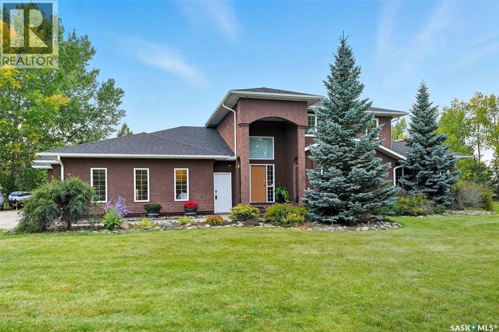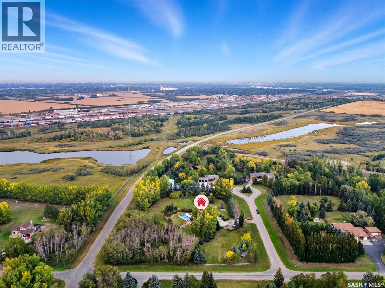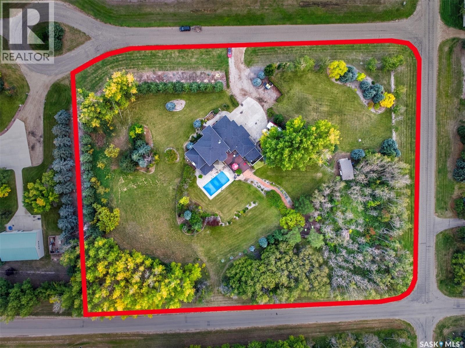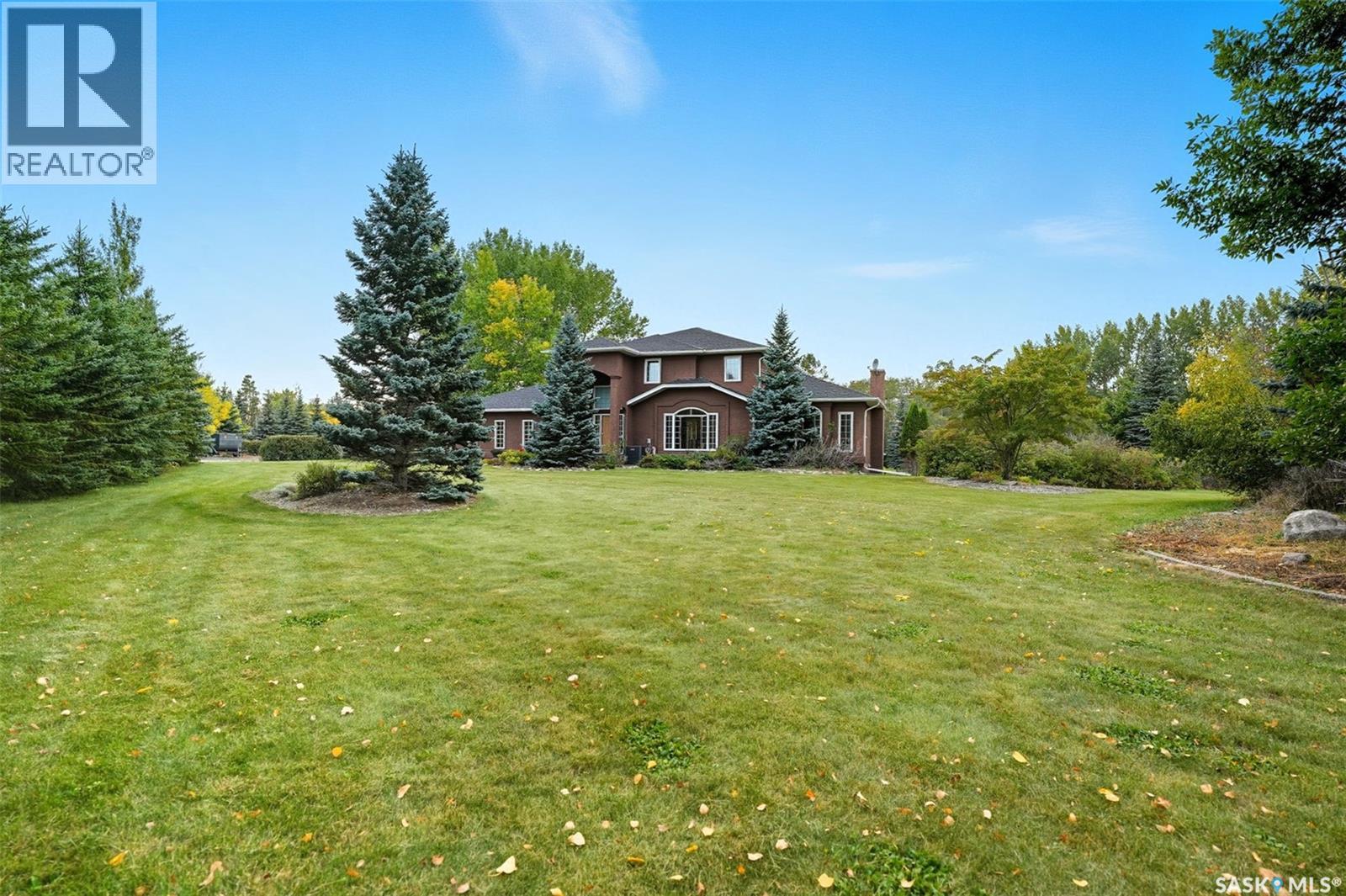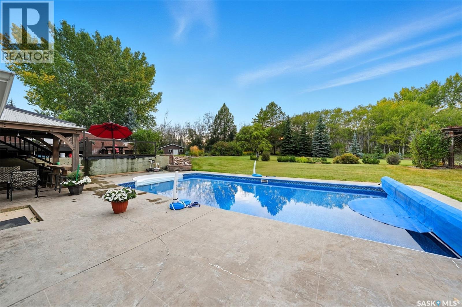 Highly desirable CEDAR VILLA ESTATES!!! Only ONE km from city limits! Enjoy the serenity of country living with city convenience such as treated SK water and high speed fiber internet!! Well maintained 2 story split offers the perfect blend of luxury and tranquility situated on well treed 2.81 acres. This home is designed for function, style and entertaining. Gourmet kitchen with maple cabinets, granite counter tops including the island, tiled back splash + a pantry. Open into the Livingroom which offers cathedral ceilings and gas fireplace. Garden doors to multi-level deck. Separate formal dining room is great for hosting functions. Main floor laundry. Primary bedroom is on the main floor as well with 4 pc ensuite and walk-in closet. 2nd floor has 3 more spacious bedrooms and another 4pc bathroom. Plenty more space in the WALKOUT basement! Complete with a family room with built-in feature wall including a gas fireplace. Garden doors from the sunroom to the amazing yard. There is also a games area and 2 more "flex" rooms for a gym or your favorite hobby with it's own 3pc bath. Upgrades included newer engineered hardwood flooring, furnace, water heater and A/C 4 years old. Attached oversized 3 car garage with attached heated work shop. PLUS a detached 23'x13'7" garage. Plenty of room for the acreage toys! Perfect entertaining yard set up with in ground POOL and wrap around multi level deck complete with gazebo. The inviting pond adds to the aesthetic features and serenity of surrounding nature. Glorious heavily treed lot has plenty of space for out door activities. Inviting stone pathway leads to a private firepit area. There is a deep well for the yard watering along with underground sprinklers. Experience the perfect balance of luxury living and country charm in this Cedar Villa acreage!! (id:44393)