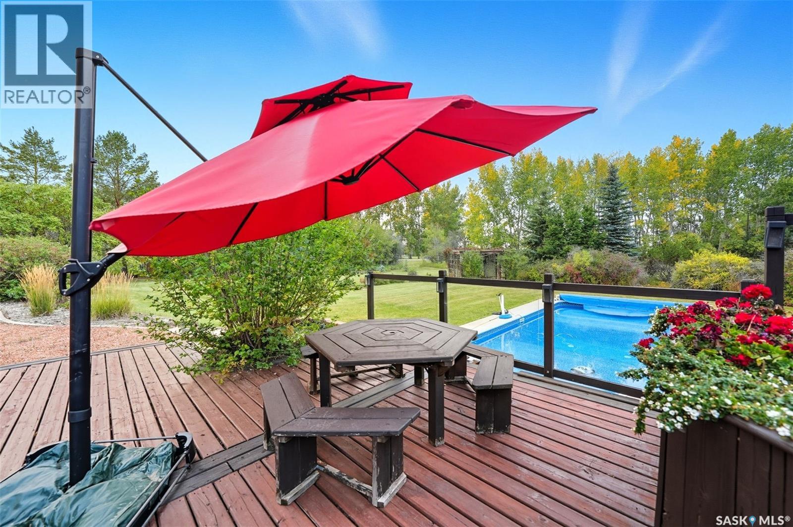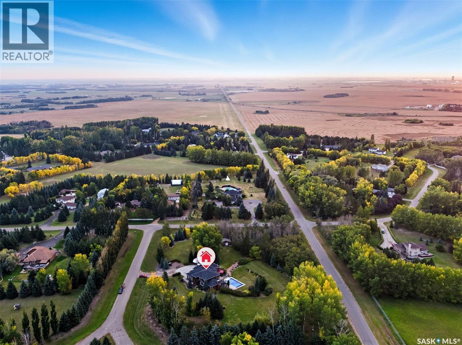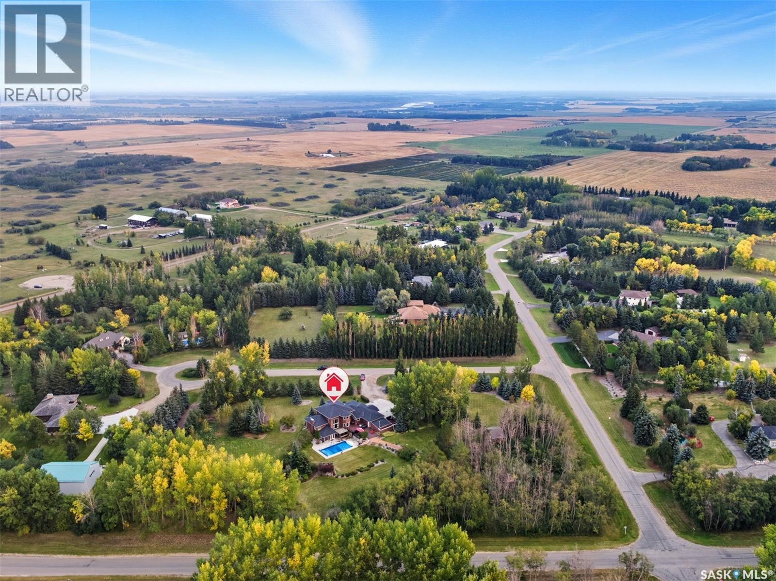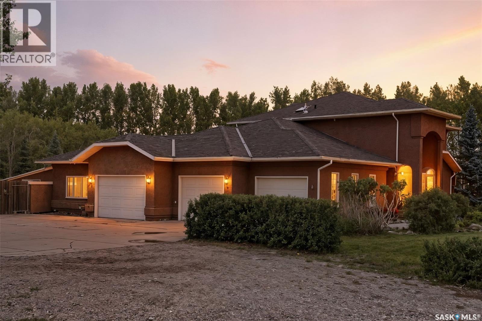 Highly desirable CEDAR VILLA ESTATES!!! Only ONE km from city limits! Enjoy the serenity of country living with city convenience such as treated SK water and high speed fiber internet!! Well maintained 2 story split offers the perfect blend of luxury and tranquility situated on well treed 2.81 acres. This home is designed for function, style and entertaining. Gourmet kitchen with maple cabinets, granite counter tops including the island, tiled back splash + a pantry. Open into the Livingroom which offers cathedral ceilings and gas fireplace. Garden doors to multi-level deck. Separate formal dining room is great for hosting functions. Main floor laundry. Primary bedroom is on the main floor as well with 4 pc ensuite and walk-in closet. 2nd floor has 3 more spacious bedrooms and another 4pc bathroom. Plenty more space in the WALKOUT basement! Complete with a family room with built-in feature wall including a gas fireplace. Garden doors from the sunroom to the amazing yard. There is also a games area and 2 more "flex" rooms for a gym or your favorite hobby with it's own 3pc bath. Upgrades included newer engineered hardwood flooring, furnace, water heater and A/C 4 years old. Attached oversized 3 car garage with attached heated work shop. PLUS a detached 23'x13'7" garage. Plenty of room for the acreage toys! Perfect entertaining yard set up with in ground POOL and wrap around multi level deck complete with gazebo. The inviting pond adds to the aesthetic features and serenity of surrounding nature. Glorious heavily treed lot has plenty of space for out door activities. Inviting stone pathway leads to a private firepit area. There is a deep well for the yard watering along with underground sprinklers. Experience the perfect balance of luxury living and country charm in this Cedar Villa acreage!! (id:44393)