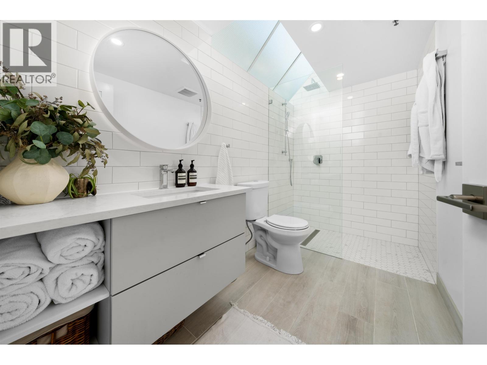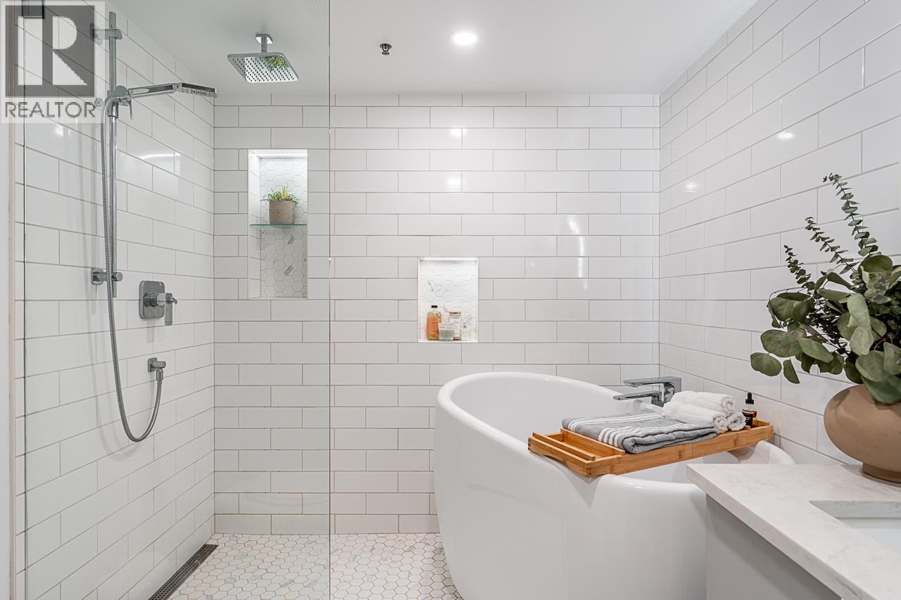 $1,033.03 MonthlySteps from the oceanfront and all the best of Ambleside in this stunning, SW-facing FRESH & BRIGHT corner unit impressing even the most discerning with lofty vaulted ceilings and generous skylights. Thoughtfully renovated, the attention to detail throughout creates a warm and inviting aesthetic: from the angled hardwood flooring, to the designer kitchen and spa-like bathrooms. The spacious primary offers patio access, walk-in closet with custom built-ins and serene ensuite bath with deep soaker tub and recessed lighting. Enjoy an XL, west-facing, 200+ square ft private patio with updated modern pavers for summer entertaining. Features include a cozy gas fireplace, in-suite laundry, 2 side-by-side parking spots with hose access and an XL storage locker. OPEN HOUSE SAT SEPT 27TH 2-4pm (id:44393)