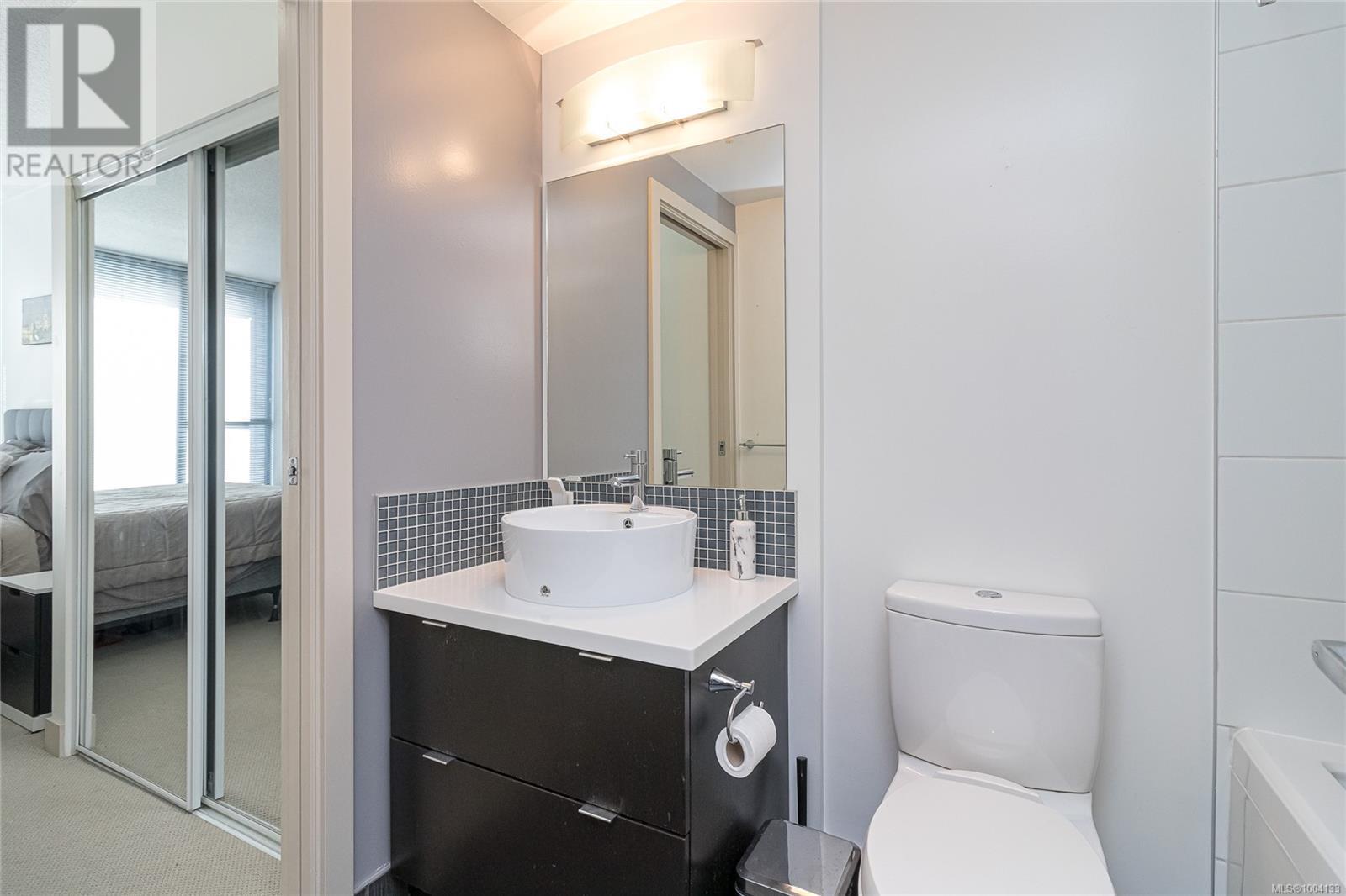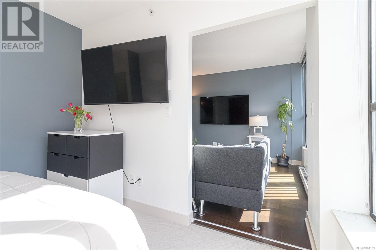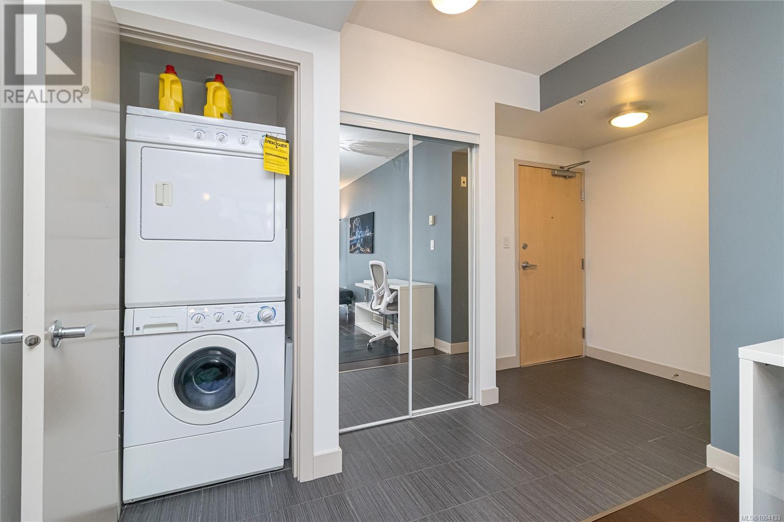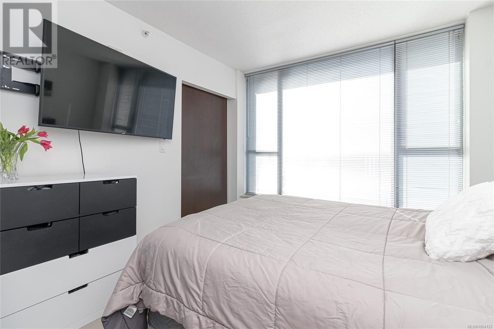 $520 MonthlyDowntown Living! This beautiful, PET-FRIENDLY, affordable 1 bedroom, 1 bathroom condo may be just what you're looking for! Spacious at 647 fin sq ft, this bright, south-facing unit has expansive windows and an open concept layout. The kitchen has a contemporary look with its fresh white countertops and Frigidaire stainless steel appliances. The generous bedroom with large closet leads into the modern cheater ensuite. An in-suite washer/dryer completes the interior. A storage unit is handily located on the same floor, and downstairs a secure bike storage room is available. This suite comes with an increasingly rare amenity—an underground PARKING SPACE! The rooftop terrace with its 2 BBQs and seating, and its stunning 360 views, is the showpiece of the Juliet building. With this amazingly convenient location you can walk in minutes to cafes, restaurants, shops, gyms, the YMCA, Save-on-Foods, Odeon, Atrium, Royal Theatre, and more. Don’t wait to view it! (id:44393)