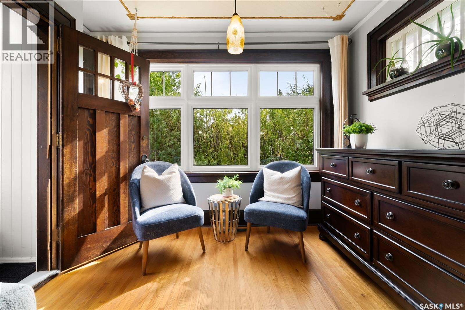 Welcome to 2054 Pasqua Street, a charming 1 ½ storey home located in the heart of Cathedral. This 887 sq ft character home, built in 1922, offers a perfect blend of original charm and modern updates. Step inside to a bright and spacious living room featuring refinished original hardwood floors, beautiful woodwork, a new glass window in the original frame, and a striking antique (non-functional) fireplace with built-in bookshelves. The formal dining room boasts a trayed ceiling and a cozy bay window. The updated kitchen offers maple cabinetry, while the main floor 4-piece bathroom features newer fixtures, a modern vanity, and ceramic tile. Two good-sized bedrooms complete the main floor, one currently used as a home office. Upstairs, you’ll find a private master retreat with bamboo flooring, newer windows, spray foam insulation, and a 3-piece ensuite bathroom. The finished basement offers a comfortable family room, cold storage, and a high-efficiency furnace. Enjoy the private backyard oasis with a fire pit area, pergola included, and a new deck built in 2022, perfect for relaxing or entertaining. A single detached garage (used as a shed) plus additional parking complete the exterior. Major upgrades include new shingles in 2024, PVC windows in 2022, new back door in 2020, front step in 2022, refinished hardwoods in 2019, new basement flooring, and updated wiring. Located steps from parks, schools, and Cathedral’s unique shops and restaurants, this home is move-in ready and full of character. (id:44393)