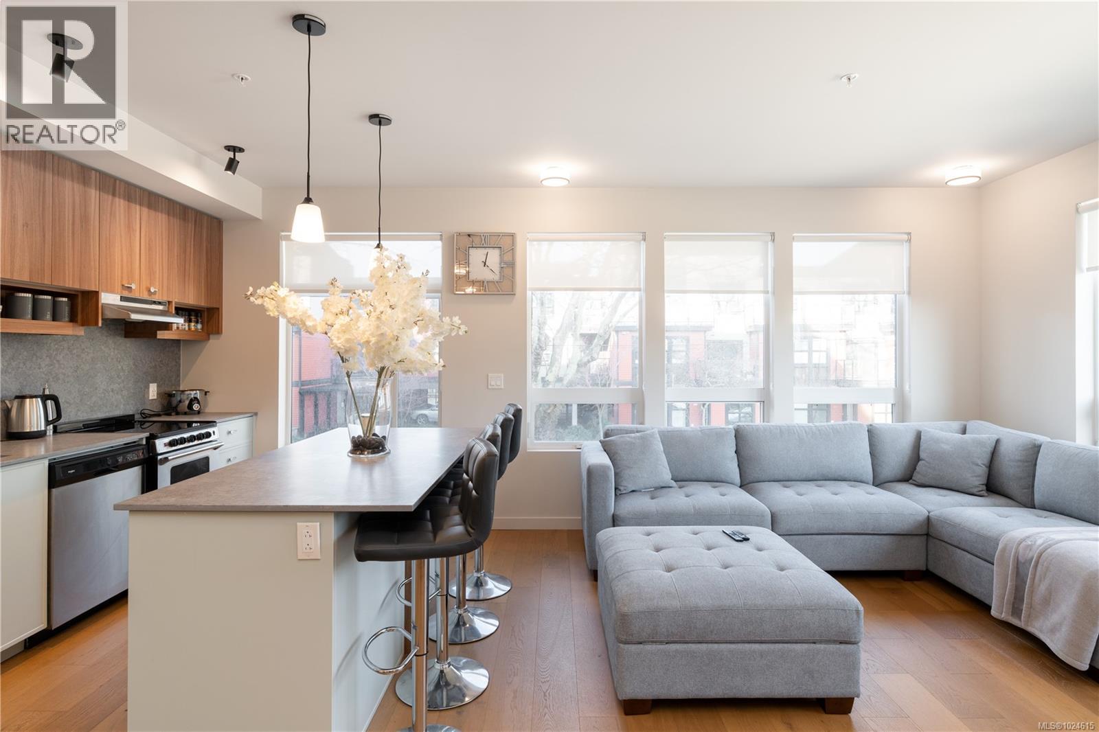$299 MonthlyWelcome to Tresah East, a contemporary condo community ideally located in Victoria’s vibrant Midtown, just minutes to downtown, the Galloping Goose Trail, and the Gorge Waterway.Unit 206 is a bright and well-designed northeast-facing corner suite offering an exceptionally spacious living area, perfect for both everyday living and entertaining. The open-concept layout features nearly 9-foot ceilings, wide-plank oak flooring, and modern finishes throughout.The stylish kitchen includes quartz countertops and a stainless steel appliance package, seamlessly flowing into the oversized living space filled with natural light from multiple exposures. Additional features include in-suite laundry and enhanced soundproofing for added comfort. Tresah East offers secure bike storage and MODO car share access—an ideal opportunity to enjoy modern urban living in one of Victoria’s most convenient locations. (id:44393)