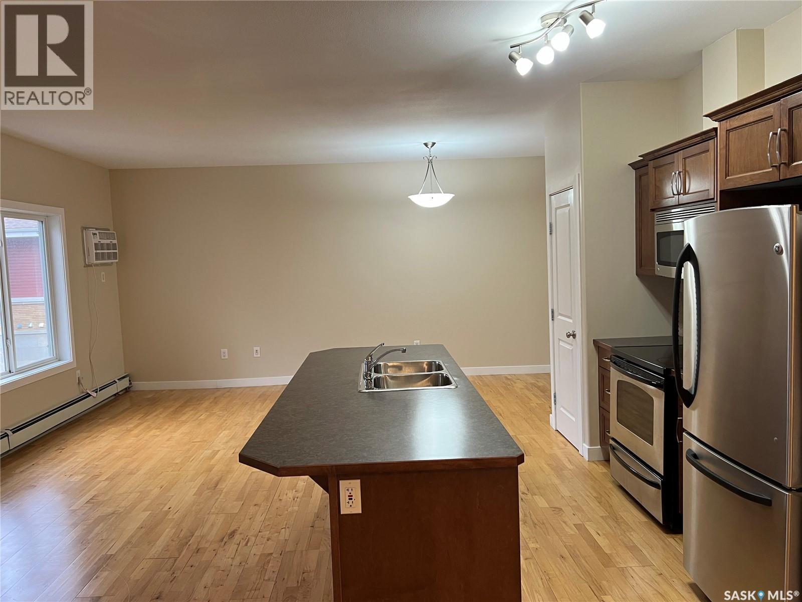 $389 MonthlyLocated in Bemister Place Condominium complex, this unit has a balcony. Enjoy easy living with rear parking lot, elevator access and a very convenient location. Walk to almost anywhere... The unit has maple style cabinets, an island, kitchen appliances included such as fridge, stove, dishwasher, microwave fan and an island plus pantry. There is an in-suite laundry room with washer and dryer included, one bedroom and a full four piece bathroom. Wall air conditioning unit. The unit will be tenant free at end of September and plans are to have the unit painted, but can be negotiable with buyer and seller. Spacious covered balcony is the perfect place to hang you potted plants in summer and sit back and enjoy some sun. (Notice to show required for the month of September as teancy in place till then) (id:44393)