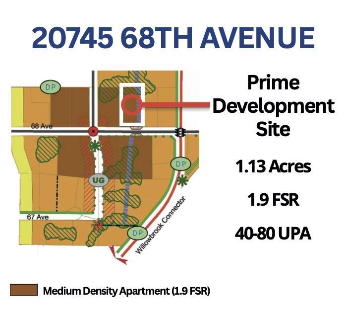 1.13 acres with a 1.9 FSR and 40-80 UPA. A prime development opportunity in the heart of Willoughby. Zoned SR-2, this property allows for small-scale multi-unit, medium density housing and fits within Langley's long-term growth strategy. The area is rapidly transforming with new residential developments, schools, parks, and commercial hubs on the way. Major road upgrades, including 208 St and a planned east-west connector, will improve traffic flow and access. Plus, the future Surrey-Langley SkyTrain extension is just minutes away and will bring even more connectivity. Don't miss out on a strategic investment in a high-demand, fast-growing neighbourhood. (id:44393)