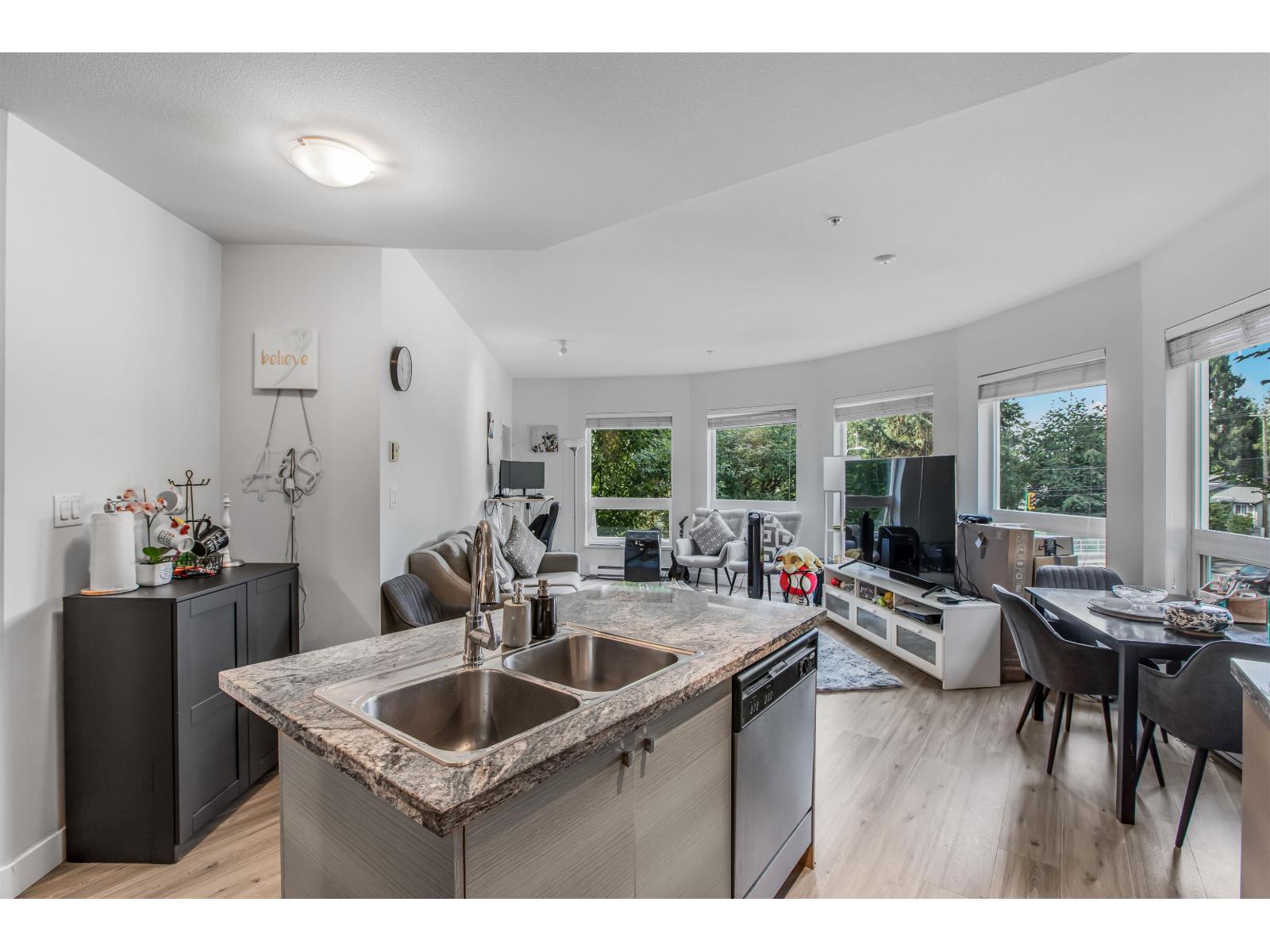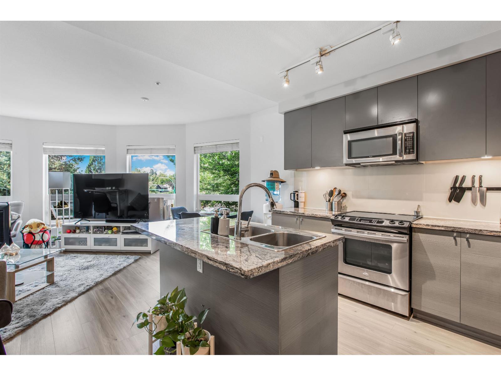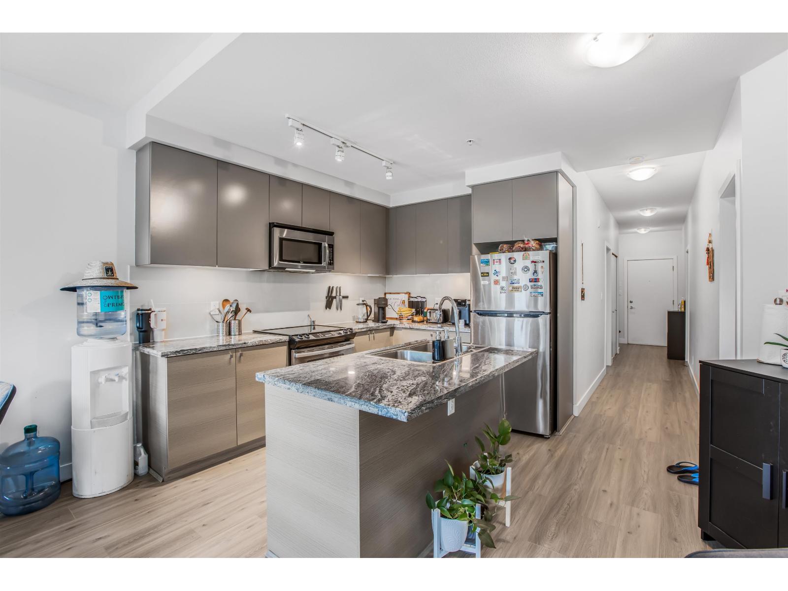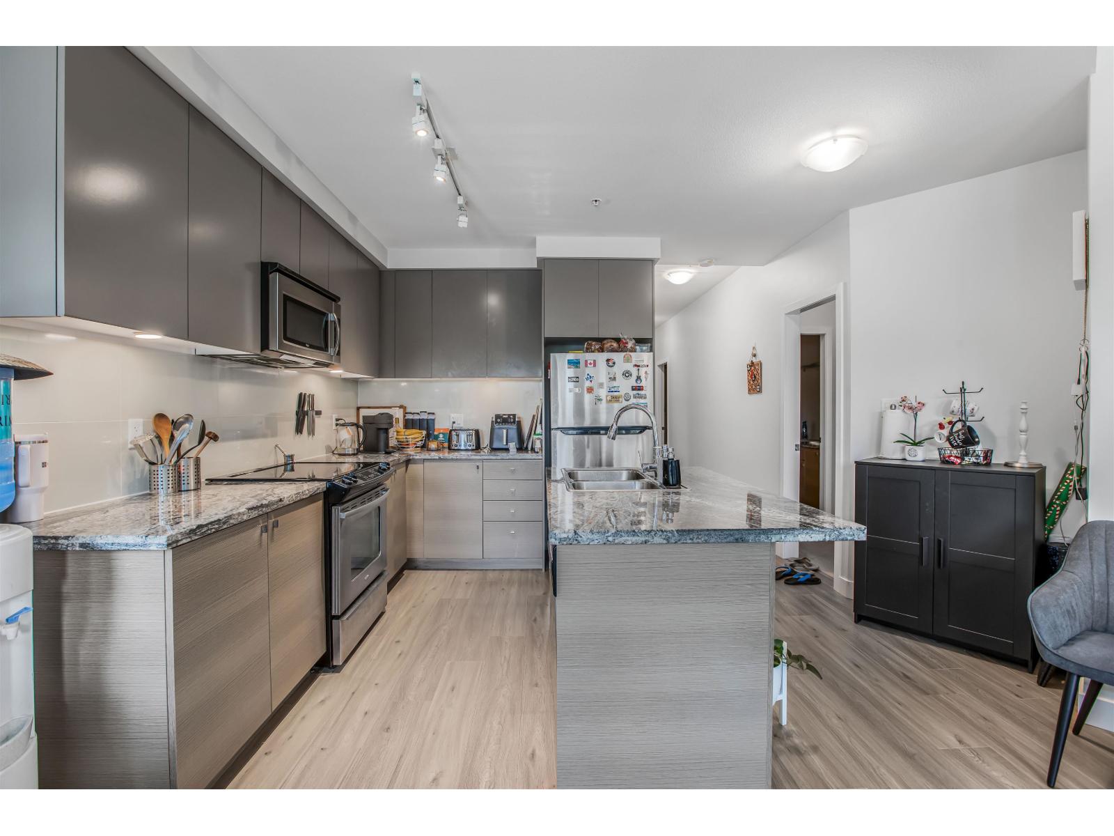 $528.10 MonthlyWelcome to Waterstone - premier resort-inspired community on the border of Surrey/Langley. This spacious 2 bedroom, 2 bathroom CORNER UNIT offers designer living with a gourmet kitchen featuring granite countertops, lots of natural light, and rich laminate flooring. The open layout is highlighted by soaring 9' ceilings, oversized windows, upgraded in-suite laundry, and a private sunny balcony perfect for relaxing or entertaining. Added value includes 2 underground parking stalls and 2 large storage lockers. Waterstone is known for its 15,000 sq. ft. Clubhouse & Wellness Centre-offering a fireside lounge with demo kitchen & wine bar, private 17-seat movie theatre, billiards room, state-of-the-art fitness facilities, yoga studio, indoor lap pool, sauna, and hot tub. Don't miss this one! (id:44393)