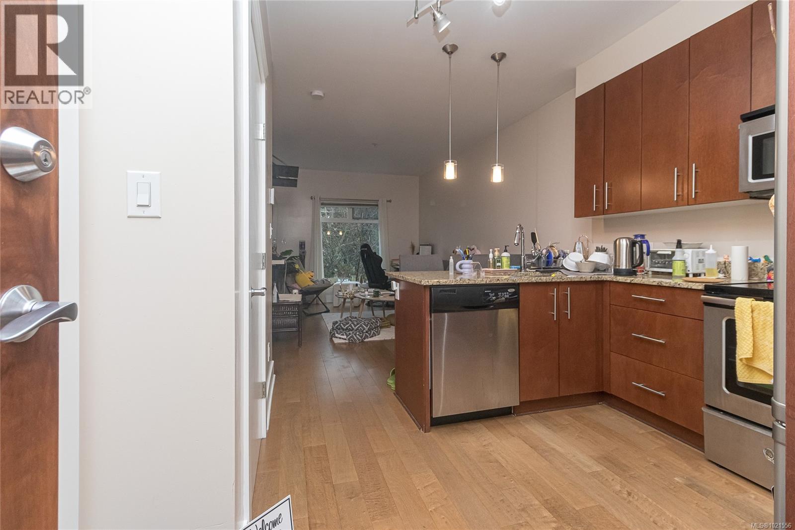 $462 MonthlyThis beautifully designed one-bedroom residence offers an exceptional blend of style, comfort, and sustainability. Enjoy seamless indoor-outdoor living with a spacious west-facing deck—perfect for evening sunsets and entertaining. High-end finishes include geothermal radiant in-floor heating, endless hot water, customized concrete soundproofing, hardwood floors, granite countertops, fibre-optic connectivity, and premium stainless steel appliances. Built to exceed Green Build “Gold” standards, the home also features secure underground parking, heated storage, and full window treatments. Ideally situated within walking distance to VGH and close to shopping, schools, transit and the Galloping Goose trail. This inviting condo delivers effortless urban living in one of Victoria’s most well-connected neighbourhoods. (id:44393)