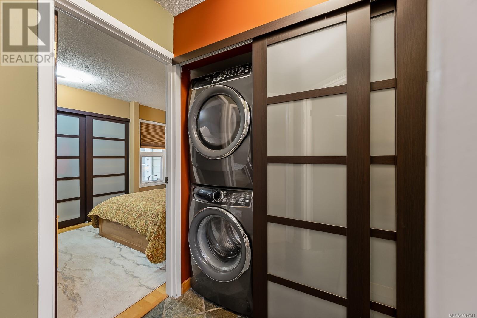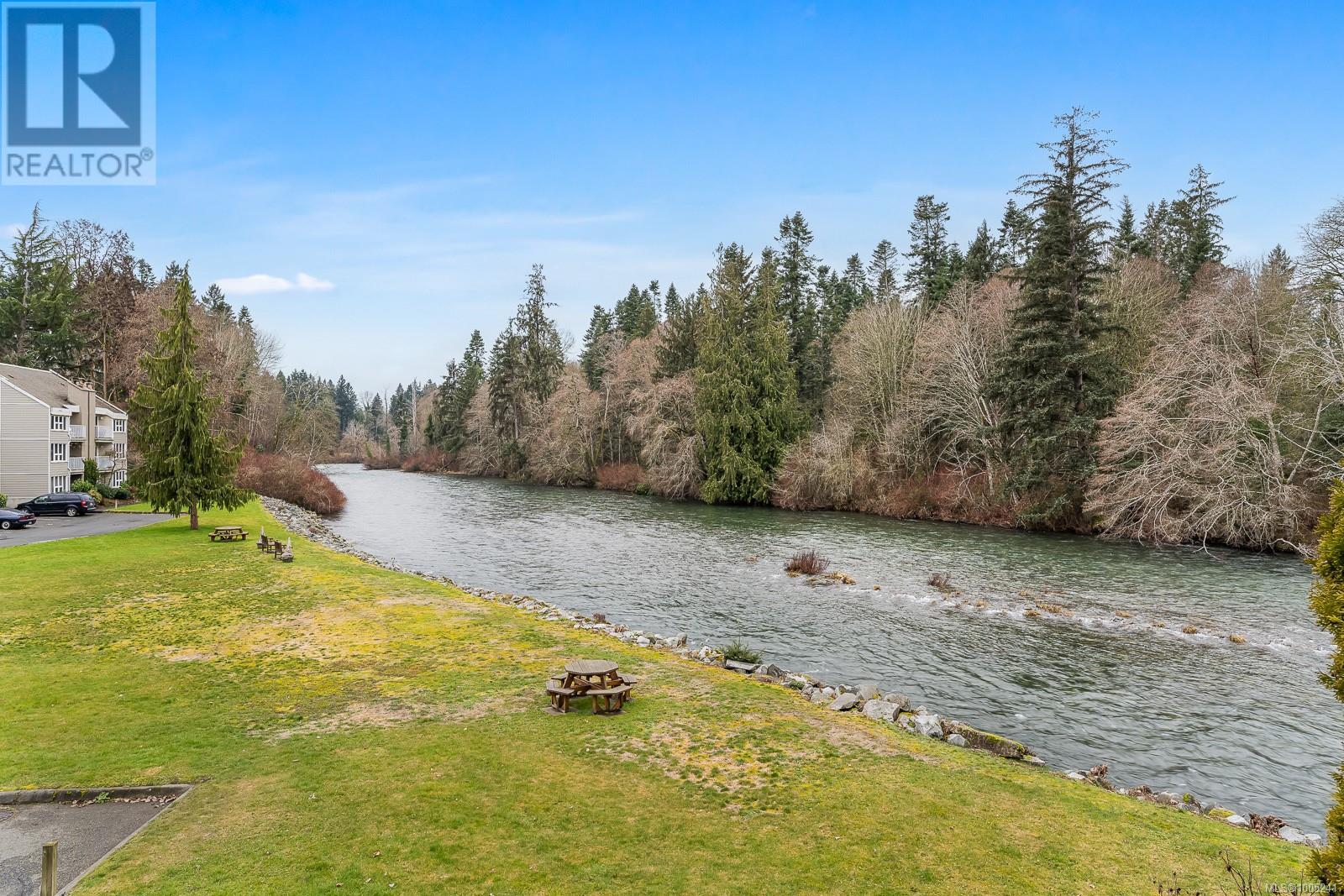 $437 MonthlyA HIDDEN GEM! Perched on the edge of the Puntledge River, here is a completely renovated two-bedroom, two-bathroom condo that is only minutes to the amenities of downtown Courtenay. The spacious 960 sq.ft unit faces southwest and looks directly up the river while enjoying evening sunsets. In the summer, relax on your patio or on the large park-like riverside lawn while listening to the relaxing sound of the river. In the winter, throw a log in the wood-burning stove and nestle in the ambiance of its heat. The interior updates are on a long list including slate and engineered hardwood floors, a custom kitchen with Italian tile counters & backsplash, custom window coverings, new Euro Glass closet sliding doors, LED light fixtures, new hot water tank, new premium appliances., new plumbing fixtures, new bathroom vanities, updated plumbing, wiring for in-wall audio and TV systems and much more. The layout is semi open and allows for plenty of natural light. The comfortable primary bedroom has an ensuite and large closet. Outside, there is one assigned parking stall plus the complex has been updated with hardiplank siding, vinyl windows, vinyl decks and aluminum deck railing. Recreational activities include hiking and biking trails, fishing and river tubing. The strata fee is $405, there are no age or rental restrictions. Hydro averaged under $70/month over last 2 years. Bring your pet of any size and stay for a long time in this well-located Courtenay condo! (id:44393)