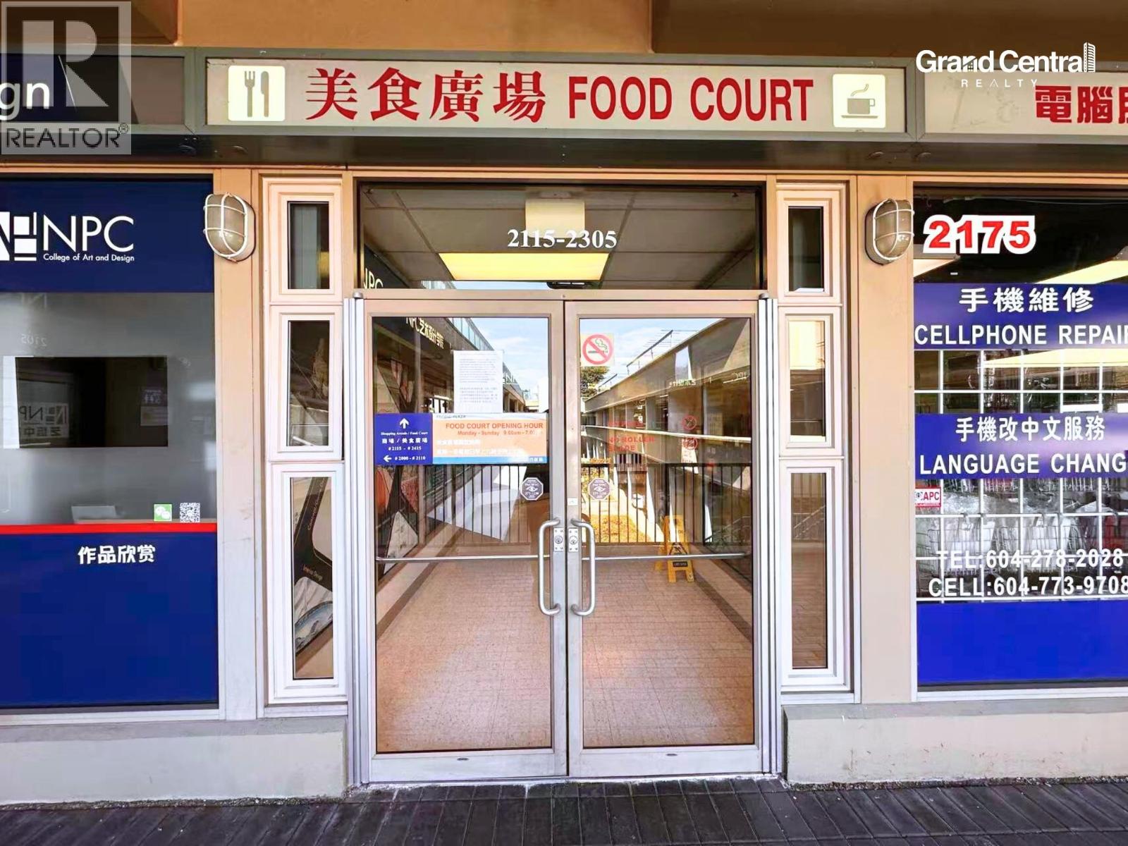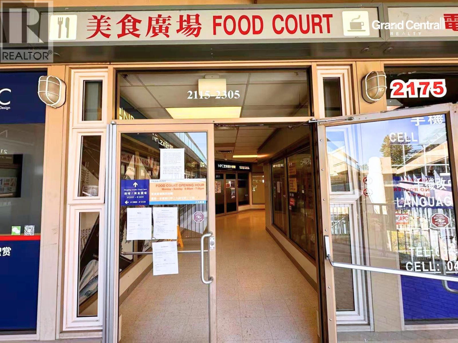 *Showing by appointment only, do not disturb staff. * Prime Commercial Unit at Pacific Plaza. Located in high foot traffic in a rapidly developing neighborhood, surrounded by high-rise residential buildings and popular shopping destinations, including No.3 Road & Yaohan Center, Continental Shopping Center, Aberdeen Square, and a variety of restaurants. TEasy access to Canada Line Station, Vancouver Airport, Highway 99, and major bridges, connecting seamlessly to Vancouver, Burnaby, New Westminster, and Delta. This bright 201 sq. ft. commercial unit on the 2nd floor of Pacific Plaza offers excellent visibility and wide frontage with large windows,perfect for a café, small office, or food court business. Strategically located near elevators, parking, and washrooms. With low property taxes, a concrete building structure, and high demand for commercial space, made it's an ideal investment opportunity. Please contact the listing agent for more information today! (id:44393)