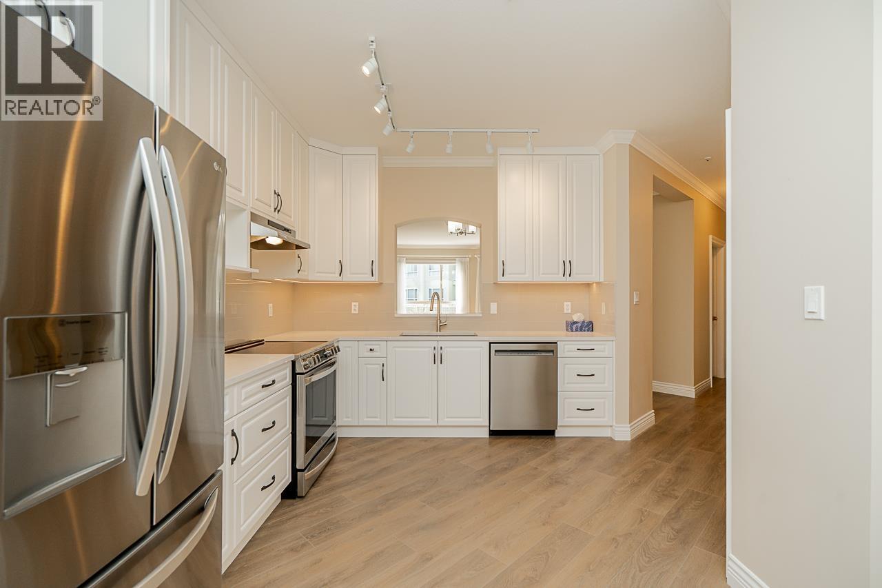 $708.77 MonthlyWelcome to Marlborough House, a vibrant 55+ community across from Lafarge Lake and steps to Coquitlam Centre and SkyTrain. This fully renovated 2 bed, 2 bath home features a stunning 317 sqft sun deck overlooking the gardens, perfect for relaxing or entertaining. Inside, enjoy brand new laminate flooring, quartz counters, white cabinetry, high-end stainless steel appliances, remodeled bathrooms, crown moulding, and radiant in-floor heating throughout. The spacious primary suite includes a walk-in closet and ensuite with double sinks and oversized walk-in shower. Two parking stalls and storage included. Resort-style amenities feature an indoor pool, hot tub, gym, guest suites, workshop, and social rooms. Strata fees include heat, gas, and hot water. Pets: 1 dog (14" at shoulder) or 1 cat. (id:44393)