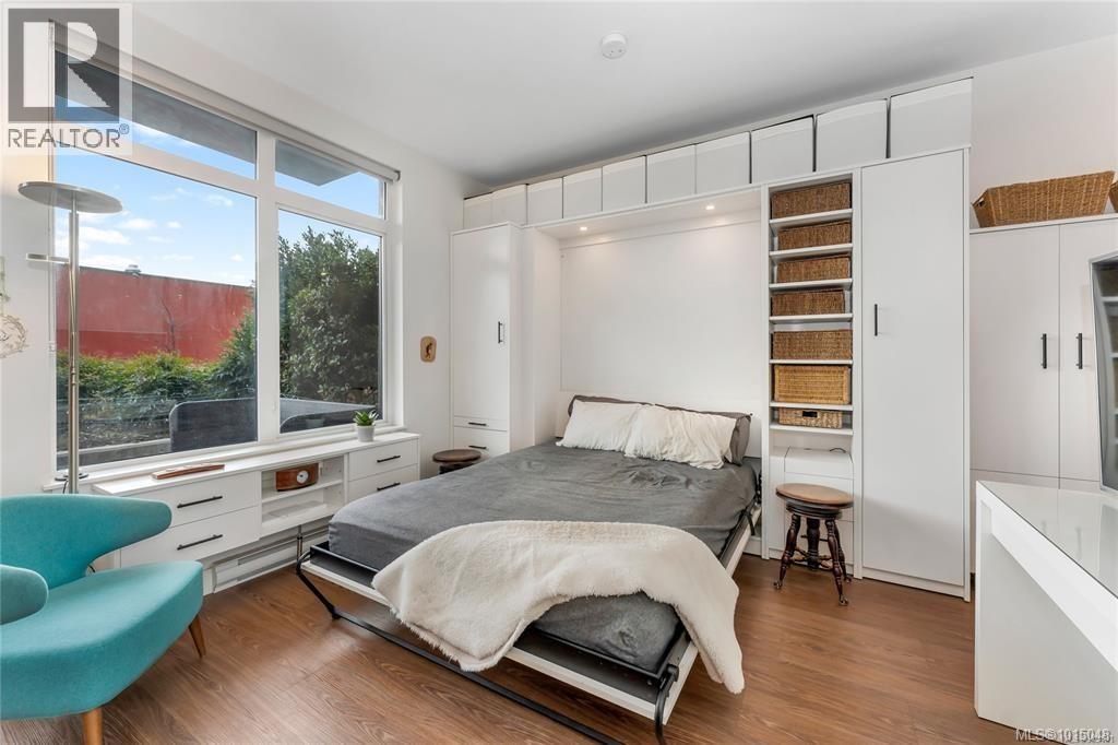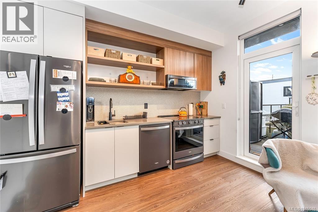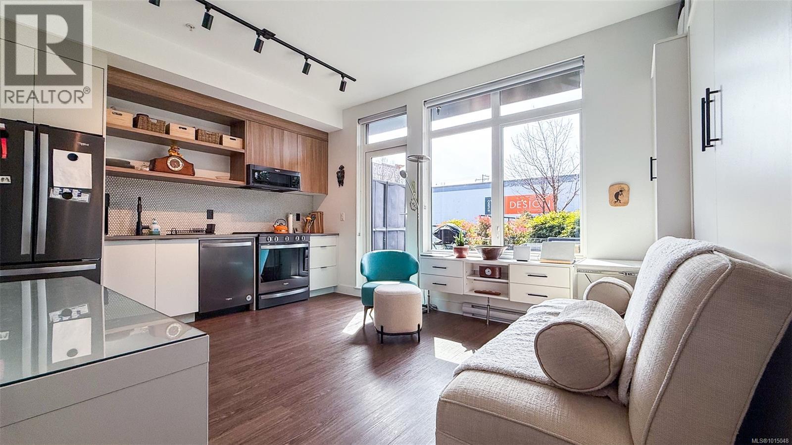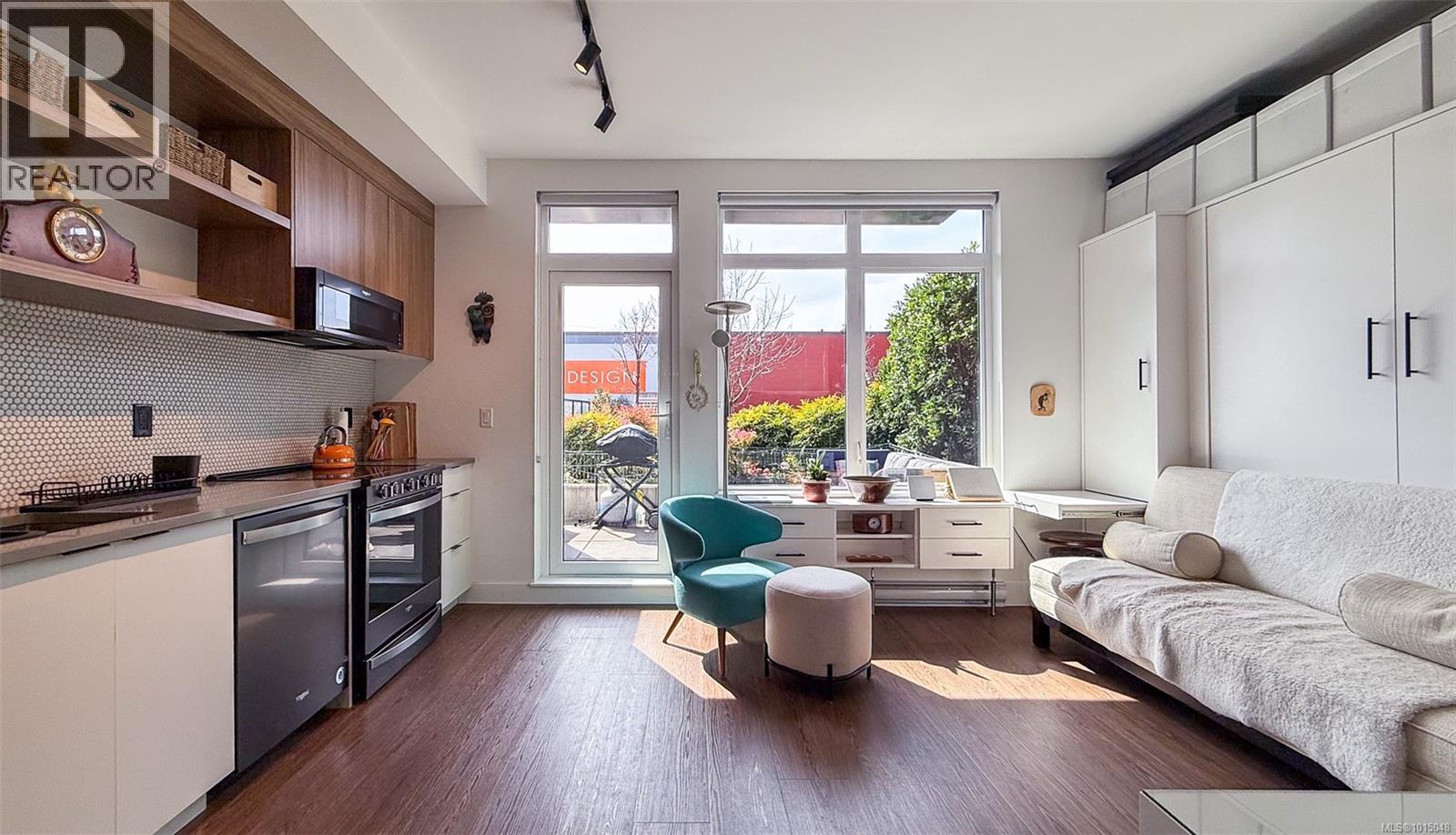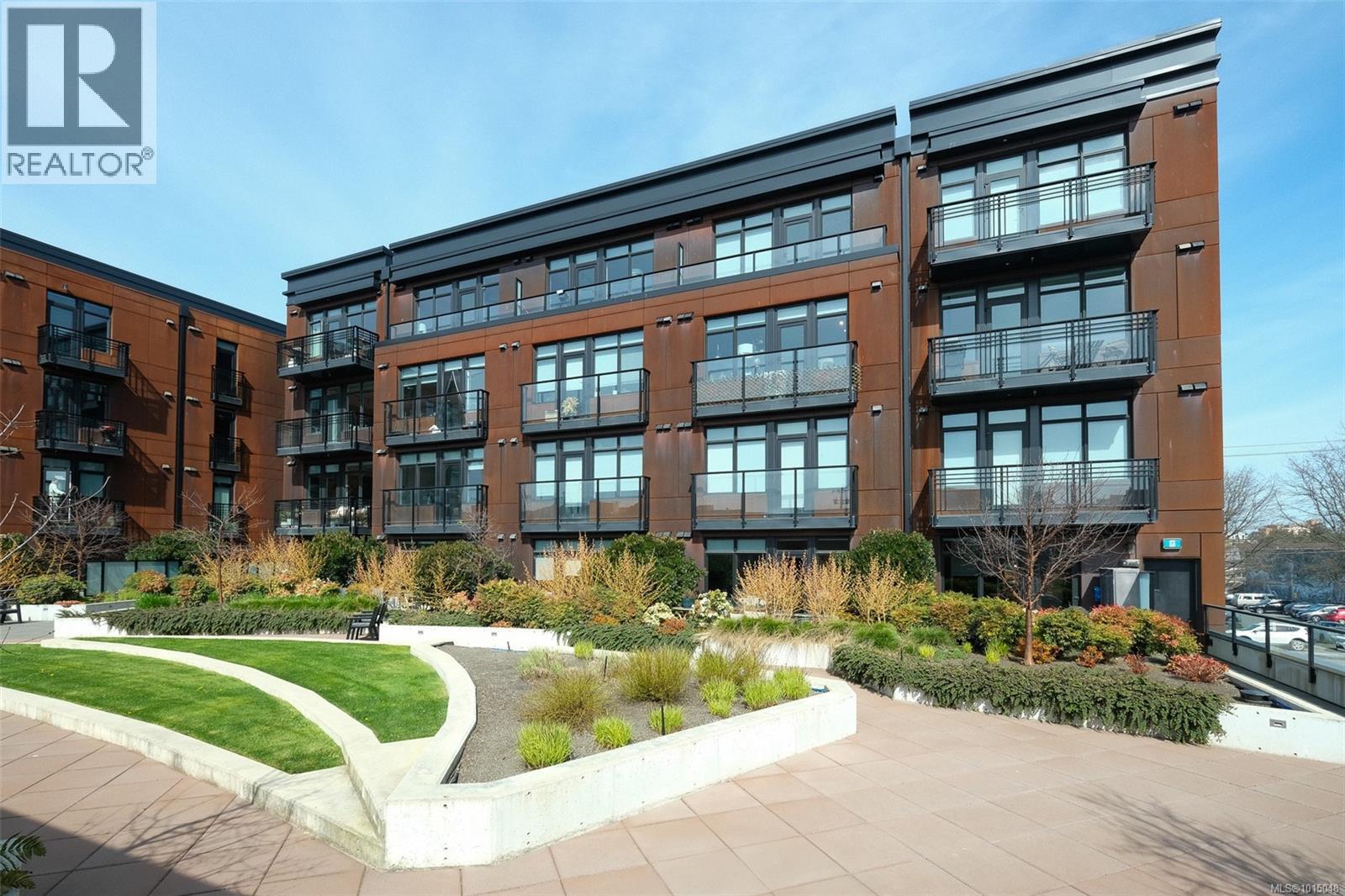 $223.50 MonthlyWelcome to this modern and private, end-unit suite boasting a bright and sunny elevated courtyard patio that is complete with secure underground parking at the Ironworks, in the heart of BC’s historic Capital. The combined living and dining space features a modern kitchen, incorporating premium appliances, quartz countertops, unique backsplash, dual-tone cabinetry and open shelving that blends well with the BBQ-friendly, south-facing outdoor space - perfect for small pets and faces the quiet courtyard outlaid with luscious grass and greenery to enjoy serene afternoons nestled away from the daily downtown activity. This condo has in-unit laundry, a beautiful 3 piece bathroom with contemporary matte black plumbing fixtures & a rain shower head all designed by LeFevre and Co., a local leader in Victoria Development. Steps from the city's best restaurants, cafes, shops, markets, culture venues, and nightlife making it easier to choose the lifestyle that you prefer. (id:44393)