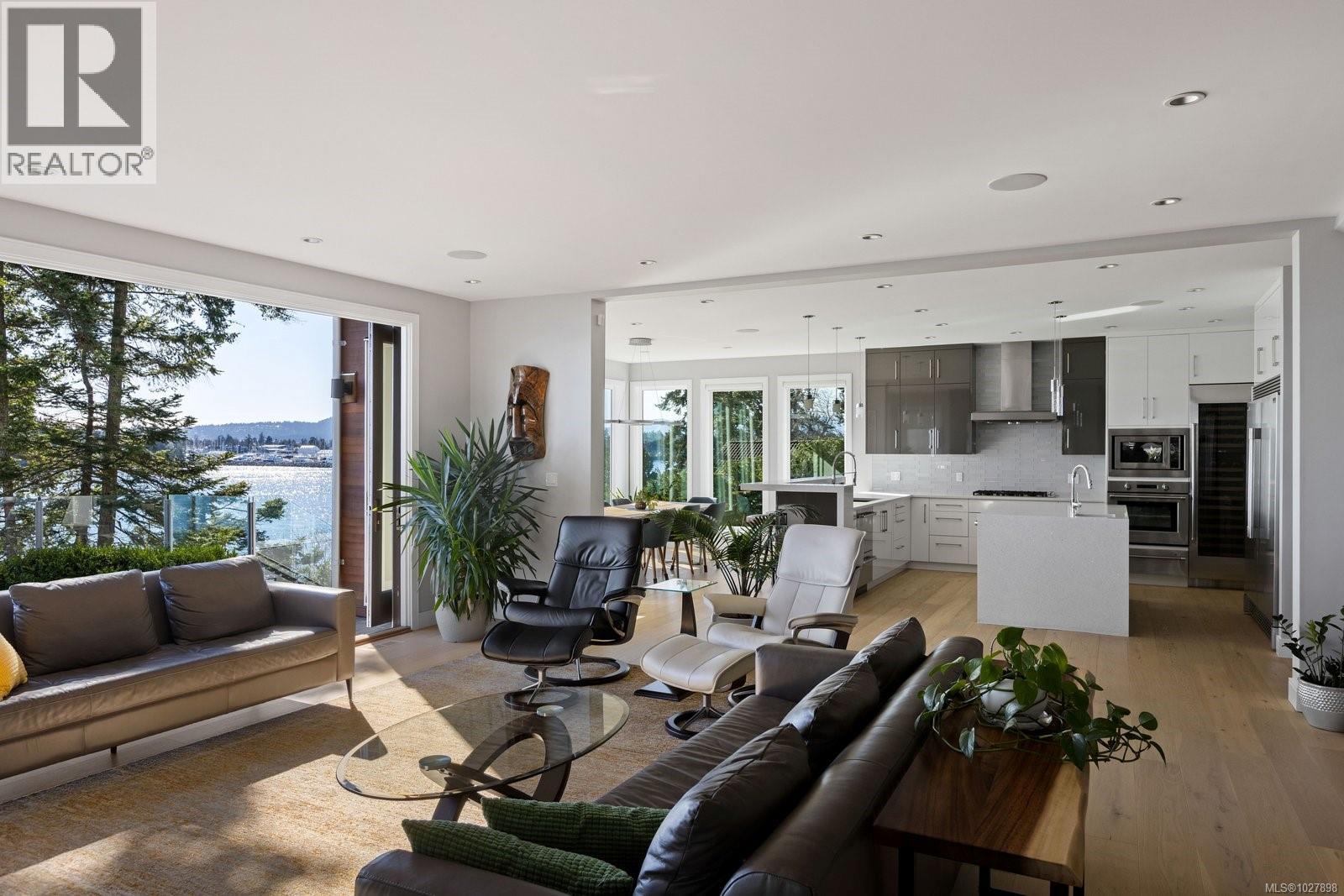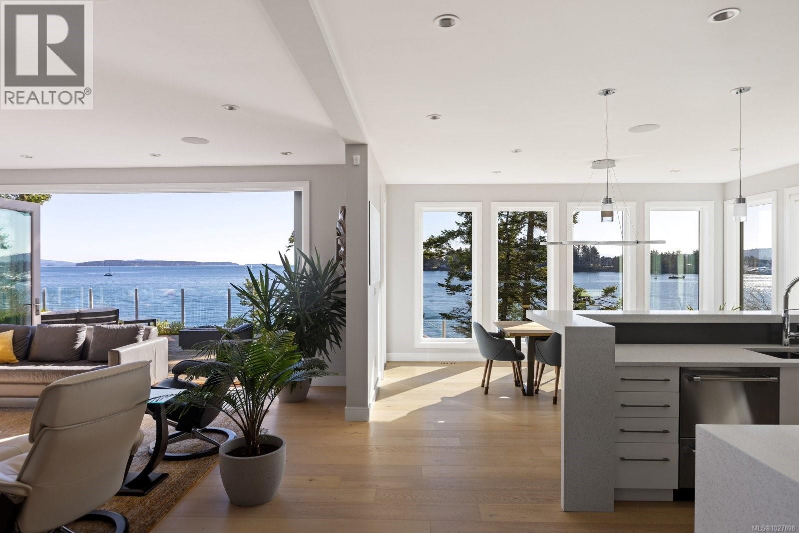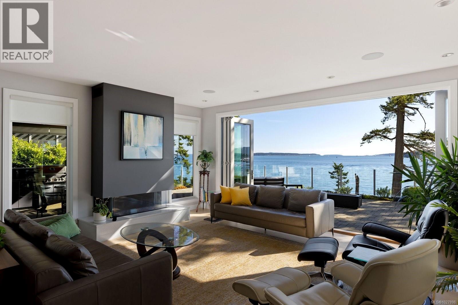 South-facing oceanfront living with exceptional, unobstructed 180° views and outstanding sun exposure from sunrise to sunset. Privately set behind a gated entrance on a beautifully landscaped, low-maintenance half-acre lot, this home offers over 1,050 sq ft of ocean-facing decks for seamless indoor-outdoor living. Enjoy easy beach access directly in front—perfect for launching a kayak or paddleboard—then unwind in the premium saltwater hot tub. Oversized windows fill the open-concept interior with natural light and showcase captivating views from nearly every room. The flexible layout offers 3 bedrooms plus an office or 4 bedrooms. A designer kitchen with high-end appliances anchors the space, complemented by hardwood floors, outdoor kitchen, infrared heaters and integrated sound system. Solar panels provide impressive energy savings. Double garage with Level 2 charger, ample storage and a quiet setting minutes to Sidney. (id:44393)