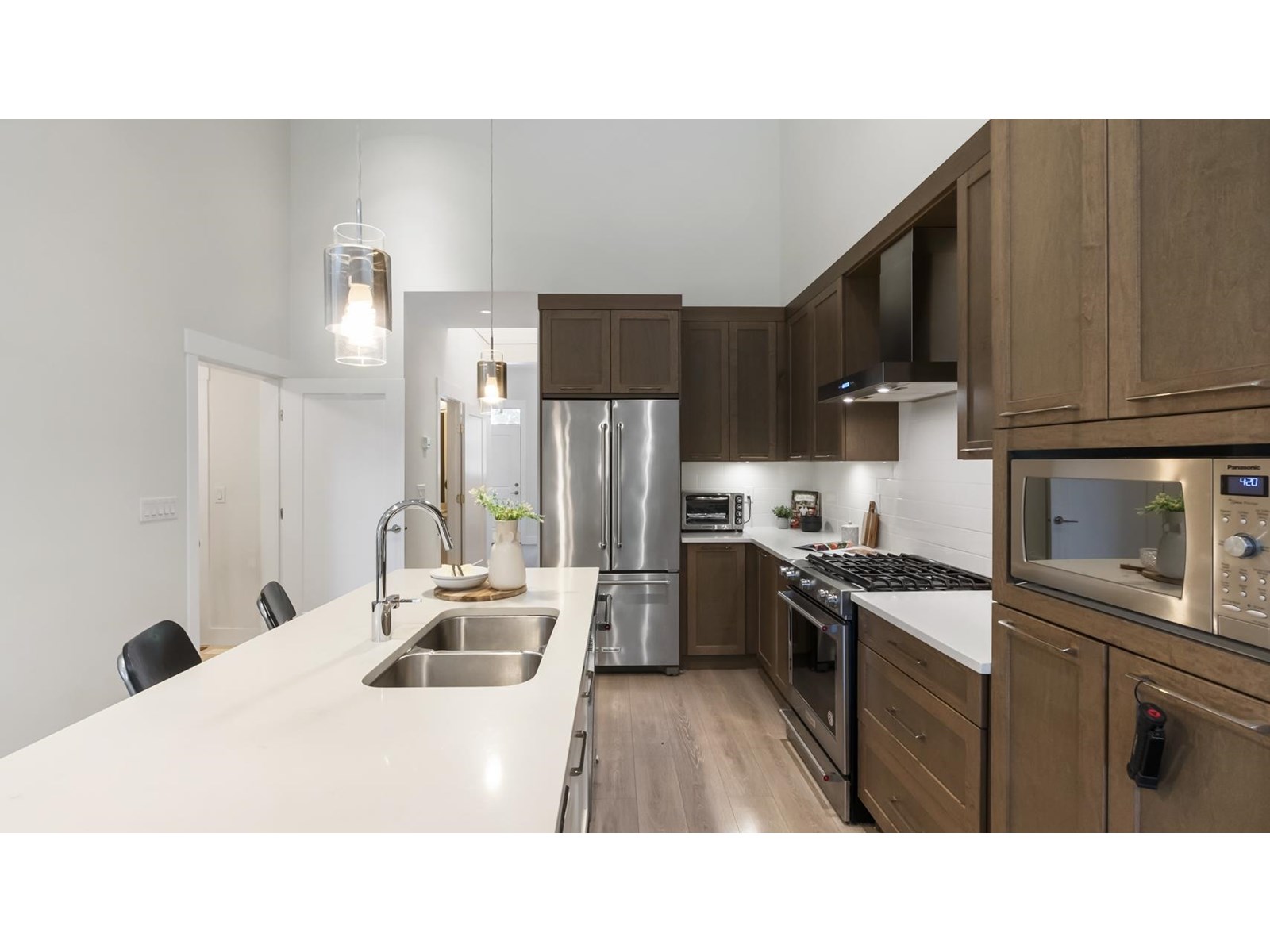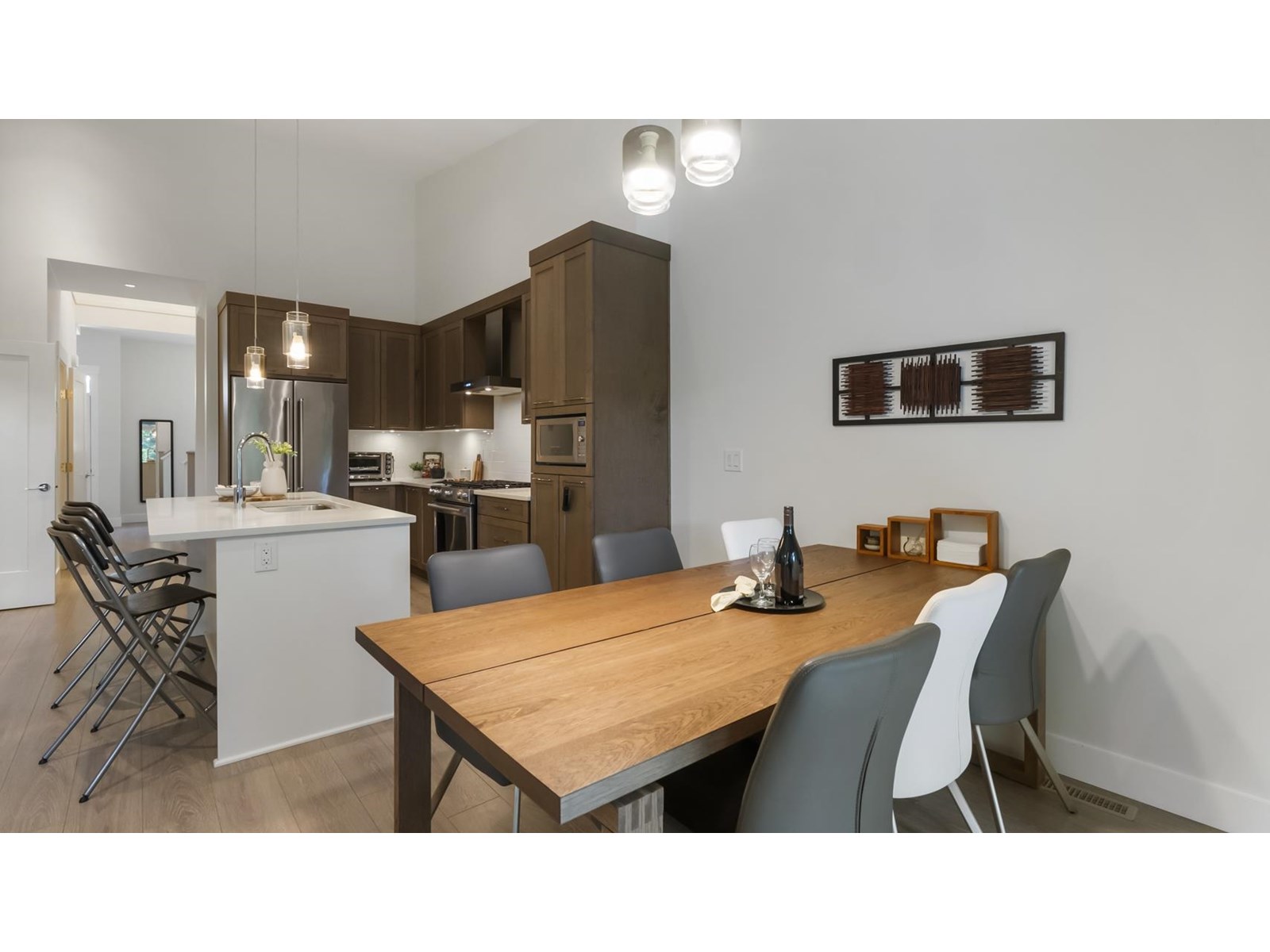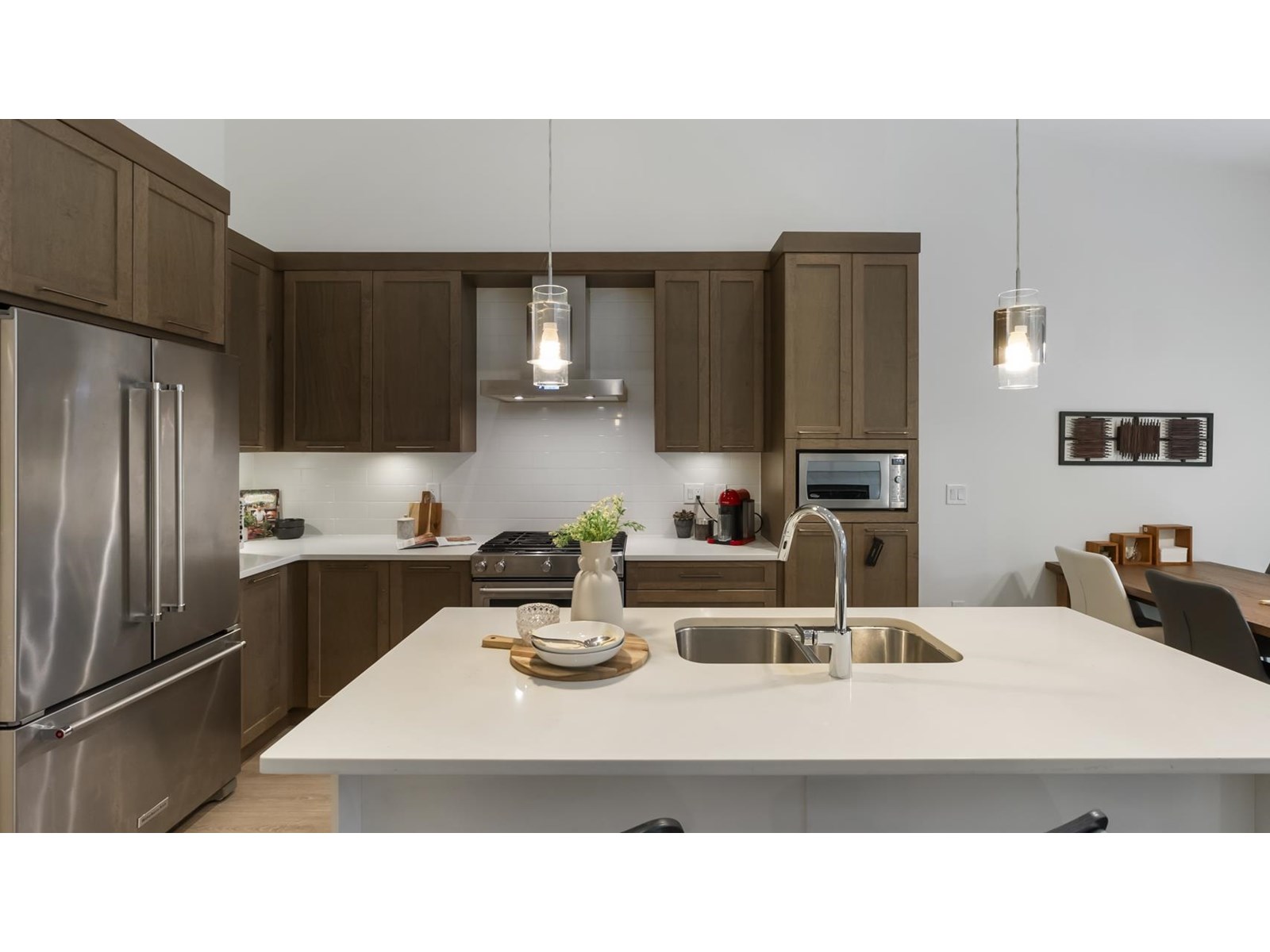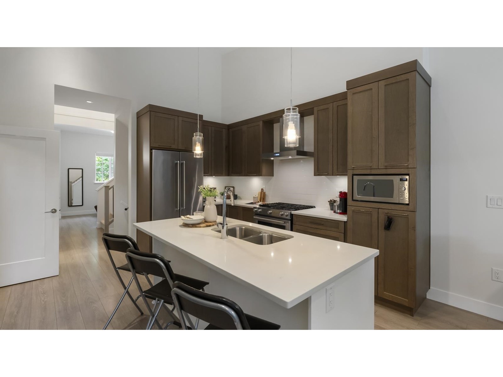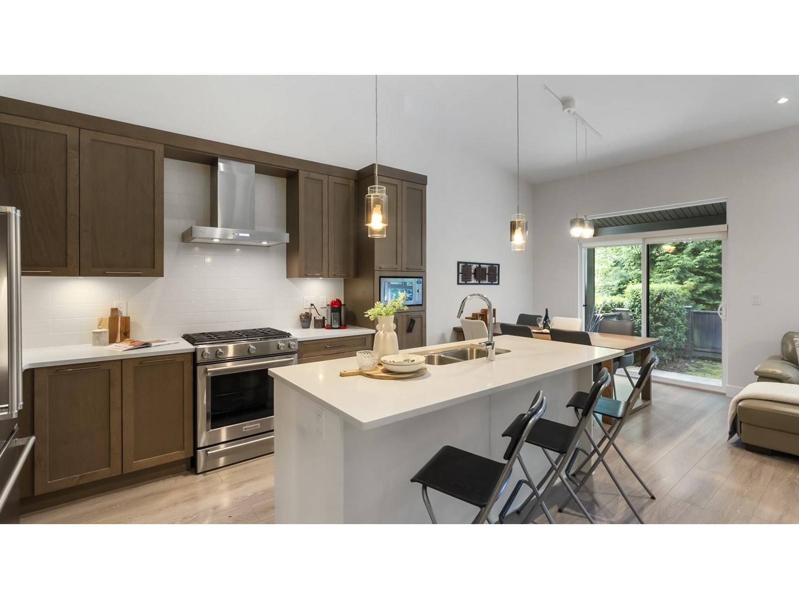 $654.65 MonthlyDiscover luxury living at The Links townhouse community. This spacious 5bd, 4bath townhome offers an open concept design with high vaulted ceilings, double garage & a private yard with tranquil greenbelt views near Guildford Golf Course. The main floor boasts a gourmet kitchen with high end appliances, a quartz island & a dining area overlooking protected green space. Retreat to the master bedroom on the main floor, featuring a spacious walk-in closet & a spa-like 5pc ensuite with heated flooring. Enjoy comfort & elegance in this prestigious setting. (id:44393)