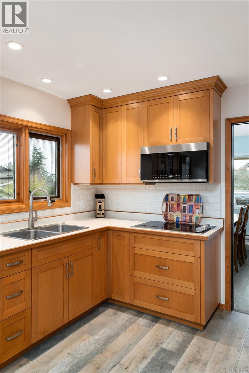 Set on a south-facing lot in a desirable location, this spacious and well-cared-for family home offers over 3,000 sq/ft of versatile living space, an exceptional private lot with an orchard, and a huge deck with a sun shade for entertaining. The layout includes 5 bedrooms + den for your home office or workout space, a family/media room, and a fully finished lower level with income potential, complete with a full kitchen. The bright kitchen features an ocean peek, while multiple living areas throughout the home provide excellent flexibility. Recent upgrades include a heat pump/AC unit, tankless hot water, irrigation, hot tub, and more. Upstairs, you will find 3 bedrooms and 2 bathrooms, including a large primary with a 3-piece ensuite. Additional features include a double-car garage, storage shed, and space to park your RV or boat. Coastal living just steps to the ocean, near Lochside Trail, minutes from the airport, ferries, access to amenities, and within easy reach of downtown. (id:44393)