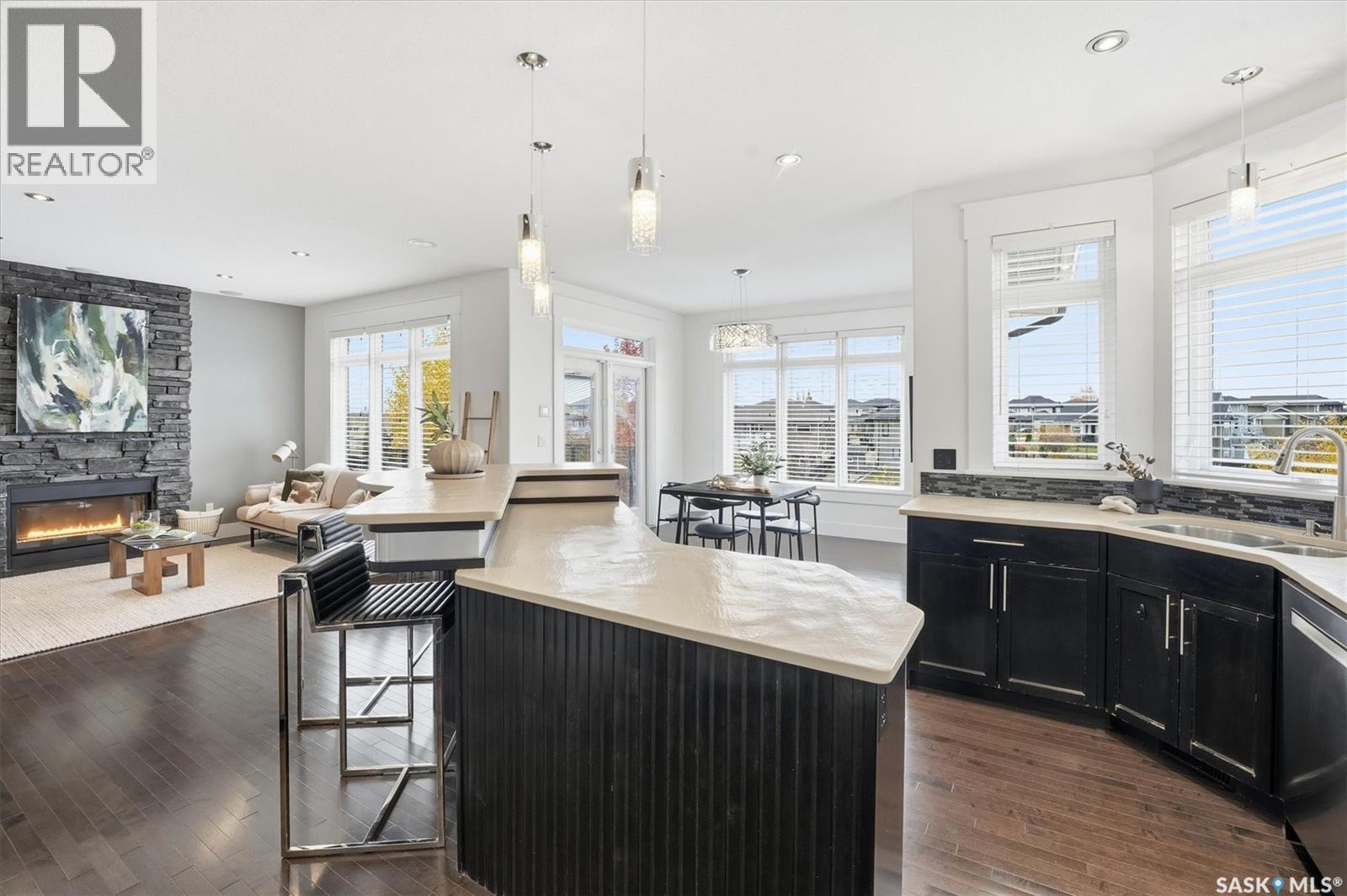 Stunning former lottery home in Stonebridge, backing onto a beautiful park and green space! This 2,114 sq ft two-storey offers a walkout basement with radiant in-floor heat, wet bar, fitness room, large windows, and a cozy gas fireplace overlooking the park. The main floor features a spacious office, an open-concept living, dining, and kitchen area with an angled island, dark walnut cabinets, gas cooktop, and a park and lake view. Upstairs boasts 3 bedrooms including a luxurious primary suite with double sinks, stand-alone shower, and Jacuzzi tub. Enjoy two gas fireplaces (main & basement), triple-pane windows, under-cabinet lighting, heated garage, and professionally landscaped yard. Exceptional craftsmanship built by D&S Homes and move-in ready — a truly one-of-a-kind park-backing home! (id:44393)