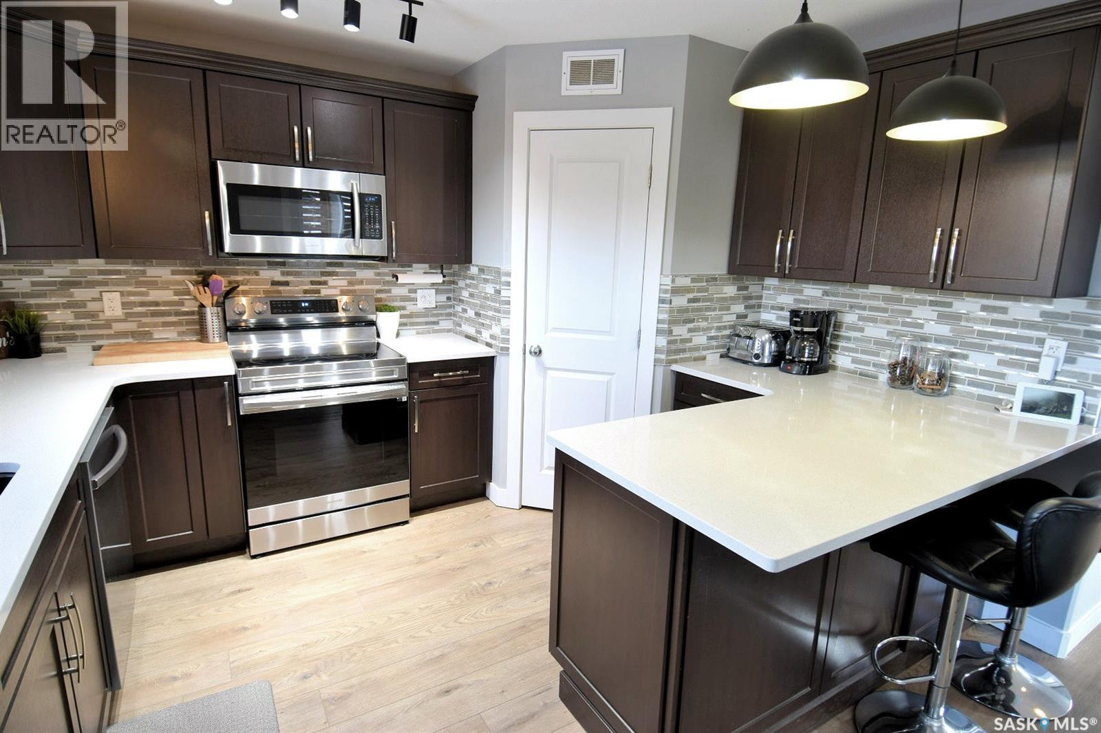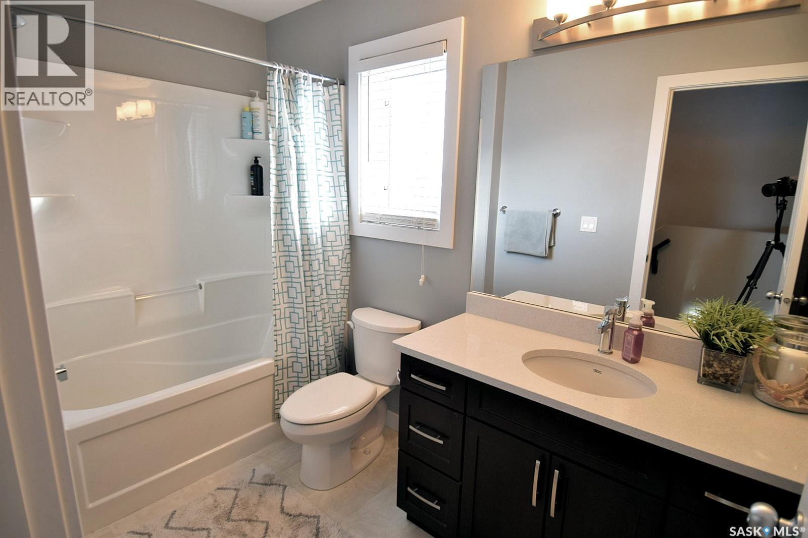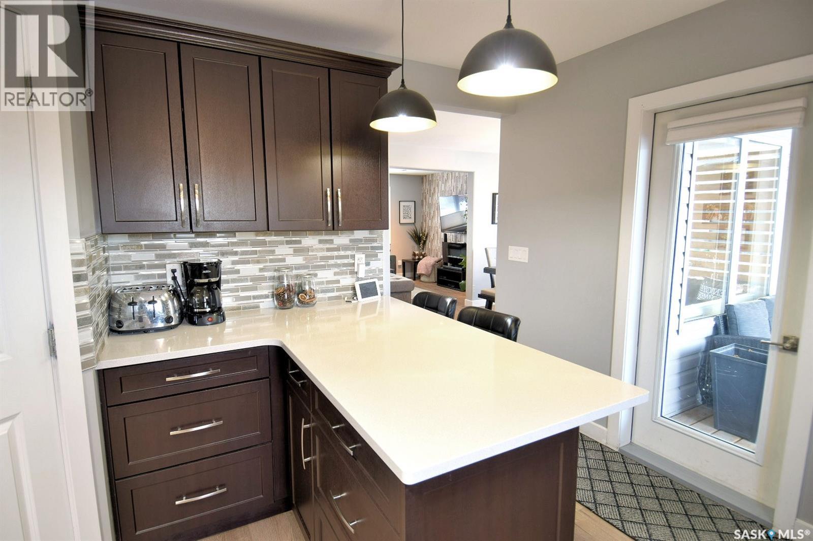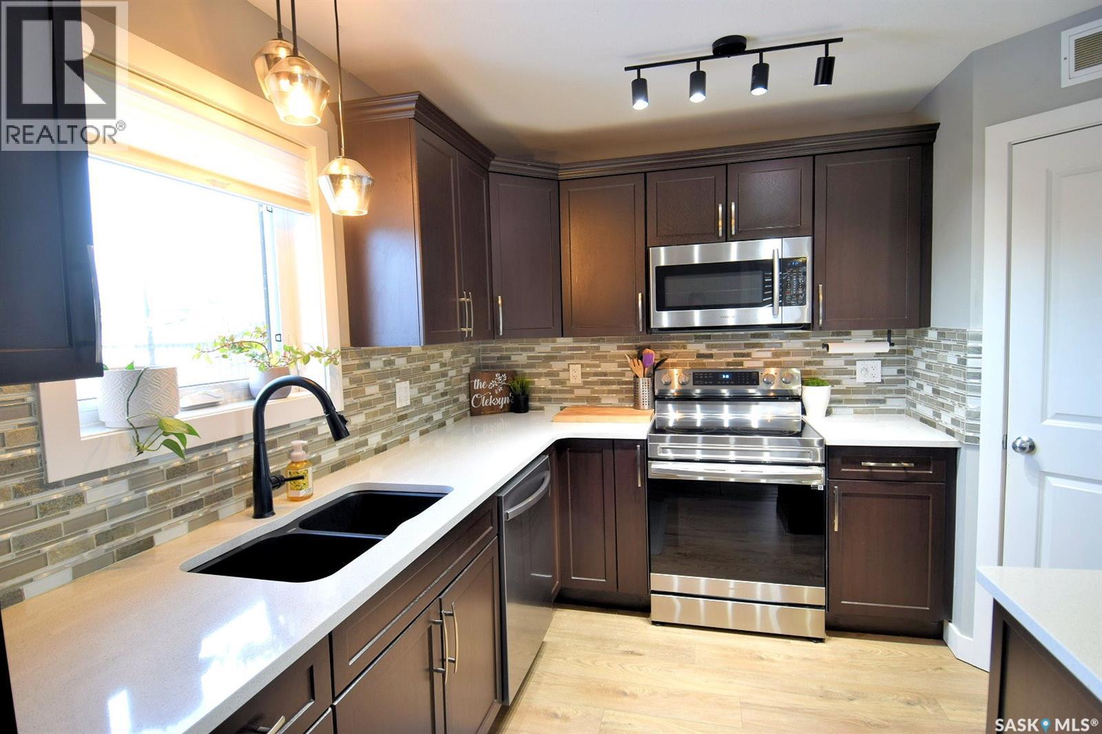 Fully Developed Family Home in Kensington—Steps from Parks, Lakes & Amenities! Discover exceptional value in this well-cared-for home in Saskatoon’s vibrant and family-friendly Kensington subdivision. Nestled near scenic parks, lakes, and walking paths, this property offers the perfect blend of nature, convenience, and community. Just five minutes from a bustling retail hub with groceries, restaurants, coffee shops, medical services, and more, plus easy access to Circle Drive for quick citywide travel. Families will love the proximity to two high schools and the impressive Shaw Centre, featuring an Olympic-sized pool, waterslides, tracks, and gymnasiums. Step inside through a sunlit covered front deck to an efficient, thoughtfully designed floor plan. The chef’s kitchen boasts extensive quartz countertops, a corner pantry, ample cabinetry, and a breakfast bar—ideal for morning coffee or weekend projects. Overlooking the west-facing backyard, the kitchen flows into a bright dining area and opens to a covered deck and fully fenced yard—perfect for entertaining, relaxing, or keeping an eye on kids and pets. Upstairs, find three spacious bedrooms including a primary suite with walk-in closet and absolutely luxurious bubble-jet tub ensuite. The fully developed basement adds a large family room (with potential for a fifth bedroom or den), a fourth bedroom, and a full bathroom. Comfort is assured with a high-efficient furnace, central air conditioning, plus underground sprinklers in the front yard. A detached garage with automatic door opener completes the package, offering secure parking and storage. Access to the garage is easy without a long lane to drive through. With few homes offering this combination of space, location, and features at this price point; this is your chance to make a move! (id:44393)