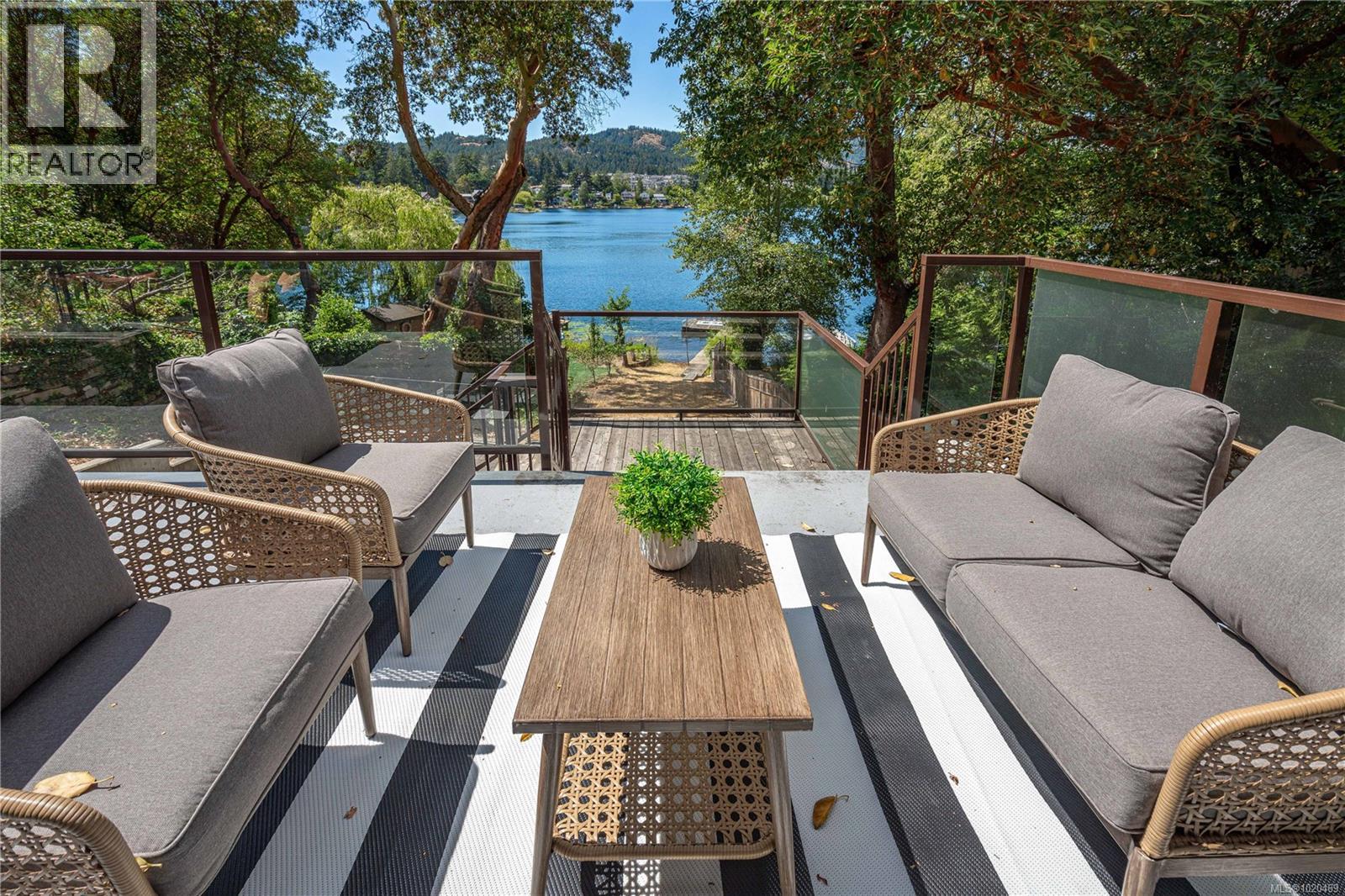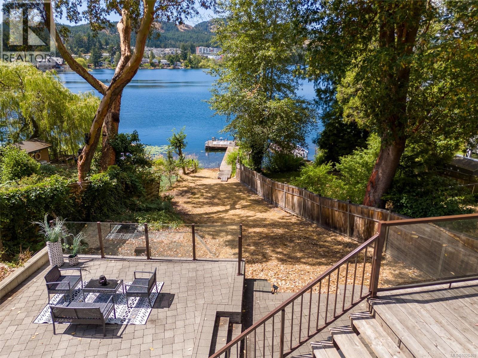 Lakefront living on Langford Lake this executive home is only second to the town centre yet offers full waterfront privacy. On an almost half an acre of land there is no need for a summer home when your main home can be both. The current owners have made many updates and upgrades to ensure luxury living. Situated well off the main road for total privacy this home offers a desirable floor plan with main level living and a suite below. With walls of glass towards the lake you will take in panoramic views from both the great room and the primary retreat. The large kitchen with updated appliances, shaker cabinets, large island, gas cooktop and also has a large window to bring in ample natural light from the lake beyond. The wide plank hardwood floors, board and batten ceiling, multiple skylights, wood fireplace and coved wood ceiling bring charm and ambiance warming the space and creating a relaxing environment. With three bedrooms up, a fourth down with a rec room and a separate suite this floor plan can accommodate a large family or provide income potential. The one bed and den suite is spacious and bright and is situated to also take in breathtaking sunsets and views of the lake. Loads of outdoor space with multiple patios, fire pit, green space, gardens, very large storage shed and a big dock with its own title. Swim all day long with ideal sun exposure to enjoy every last minute of day time. Double car garage, gated driveway, loads of parking and even covered RV parking. Langford lake is an electric motor only lake to ensure serenity and peace, residents putter around on their floating docks waving at one another creating a charming water community. You are steps to YMCA and very easy access to the highway, only seconds away from every amenity you could want or need. This home offers a lifestyle to be envied and is an extremely rare opportunity, call today for your private tour. (id:44393)