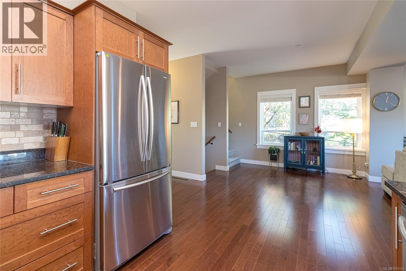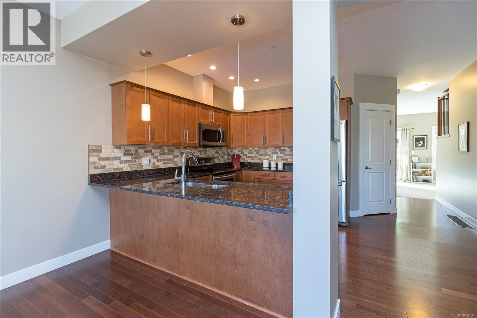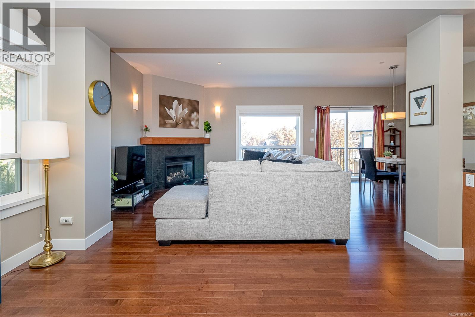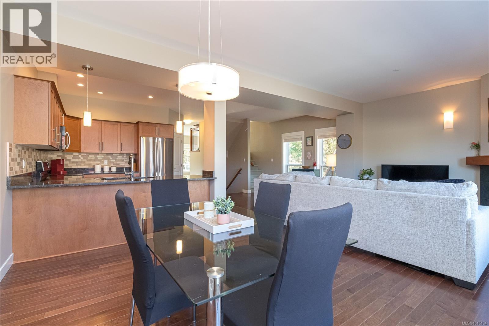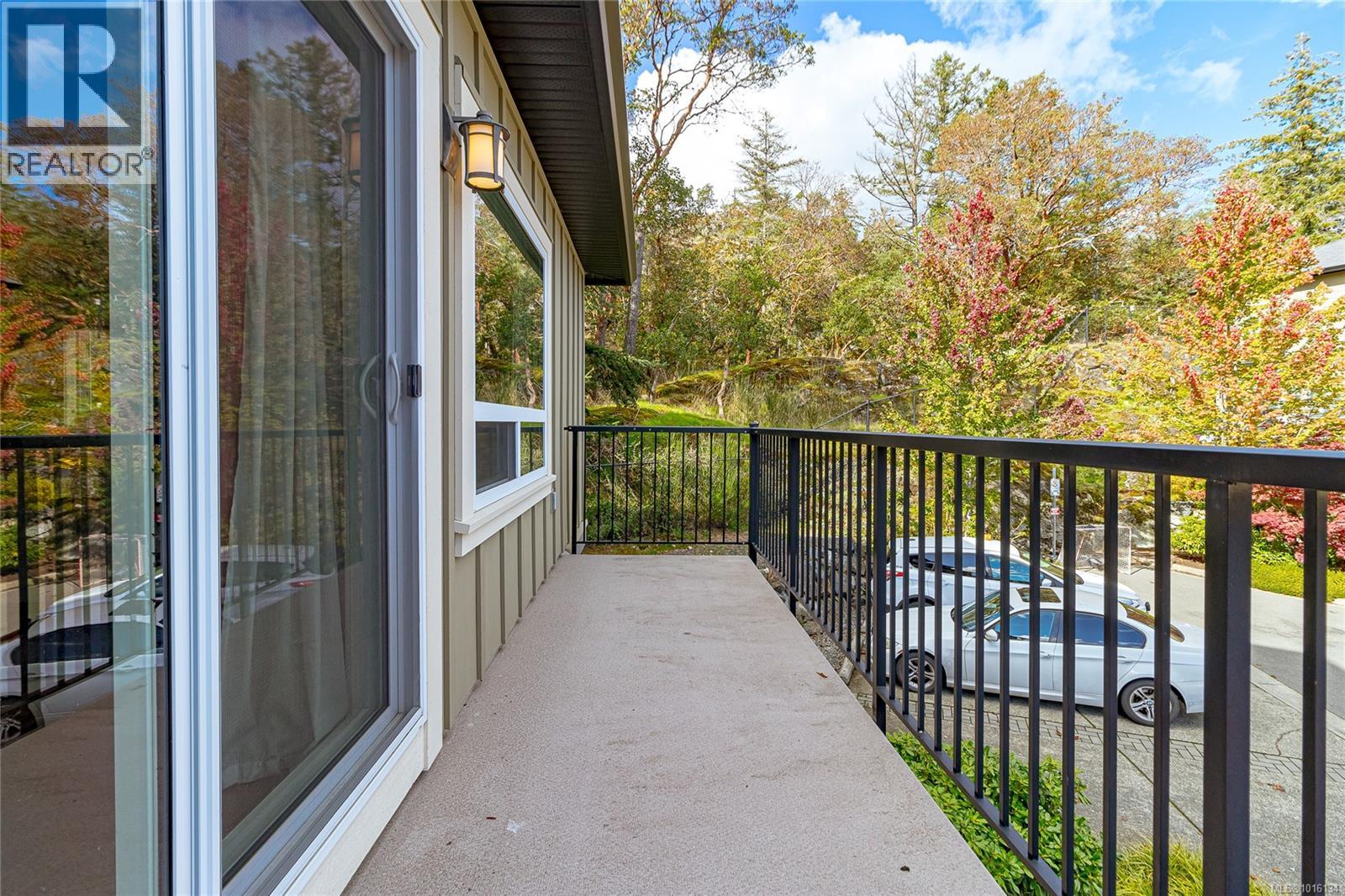 $519.28 MonthlyOPEN Sat. 11th 11:00 - 1:00 PM...A luxurious end unit Townhome located near the park, Galloping Goose Trail and Thetis Lake and is just 12 min. to Downtown. This home has 2266 sf on 3 levels; and is like a half duplex in design with only a neighbor to its one side; a double garage with additional parking spots on its driveway; and views overlooking beautiful treed area and privacy. The 2nd level includes a gourmet kitchen with eating peninsula, granite counters, s/s appliances and walk-in pantry; an open dining and living room with patio door access to a huge balcony area, and a very large family room with a walk out patio and private garden setting. An open staircase leads to 3 good-sized bedrooms on the upper level; including a spacious Primary Bedroom with 10' 6'' ceilings and deluxe 5 pce ensuite bath, a laundry room and a 2nd full bath. Outstanding features include wood floors, good storage area, geothermal heating / AC and extra parking for flexibility. (id:44393)