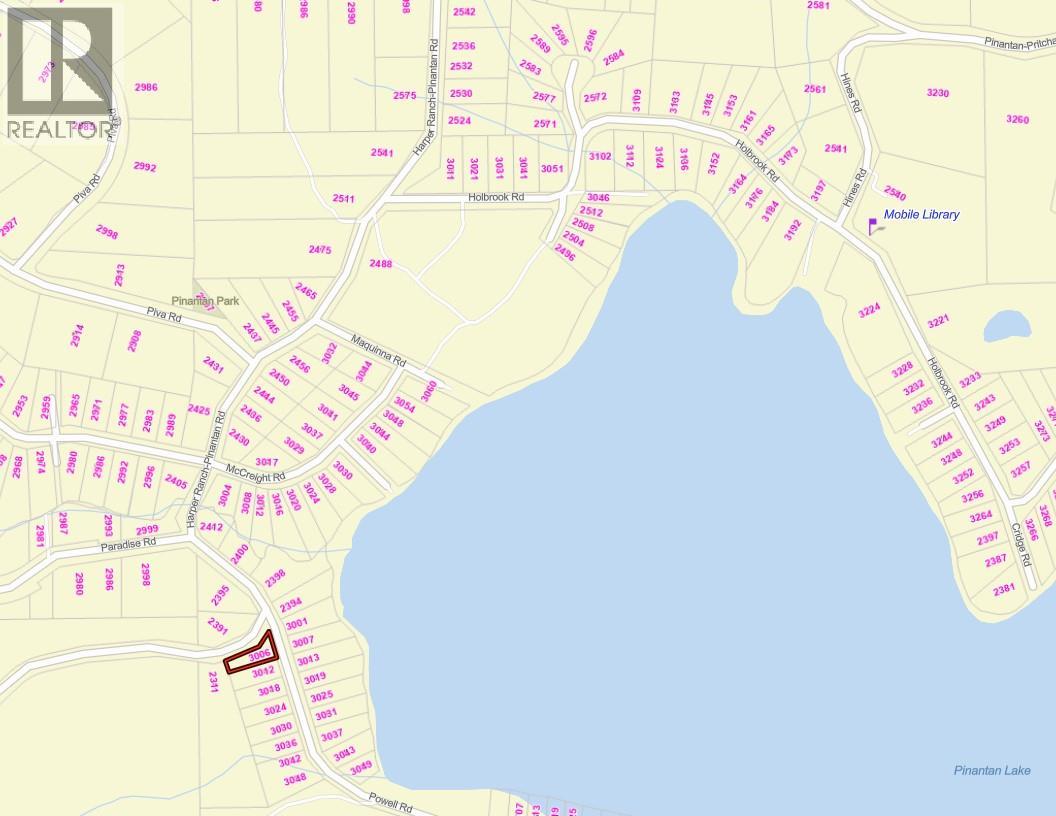 Well-located corner lot in Pinantan Lake ready for your development ideas. This 0.3 acre arcel is directly across the street from the lake and has lake access nearby. Power, cable, and internet at the lot line and store and school are both a 2 minute drive from the property. Septic and well to be installled. This property could be sold in combination with next door property 3012 Powell Road. Property is zoned CR-1 which allows for multiple uses including a residence with secondary suite, a duplex, or a manufactured home. This is a fantastic 4 season community with tons of outdoor recreation at your doorstep, Harper Mountain ski area 20 minutes away, and Kamloops less than 1/2 hour. (id:44393)