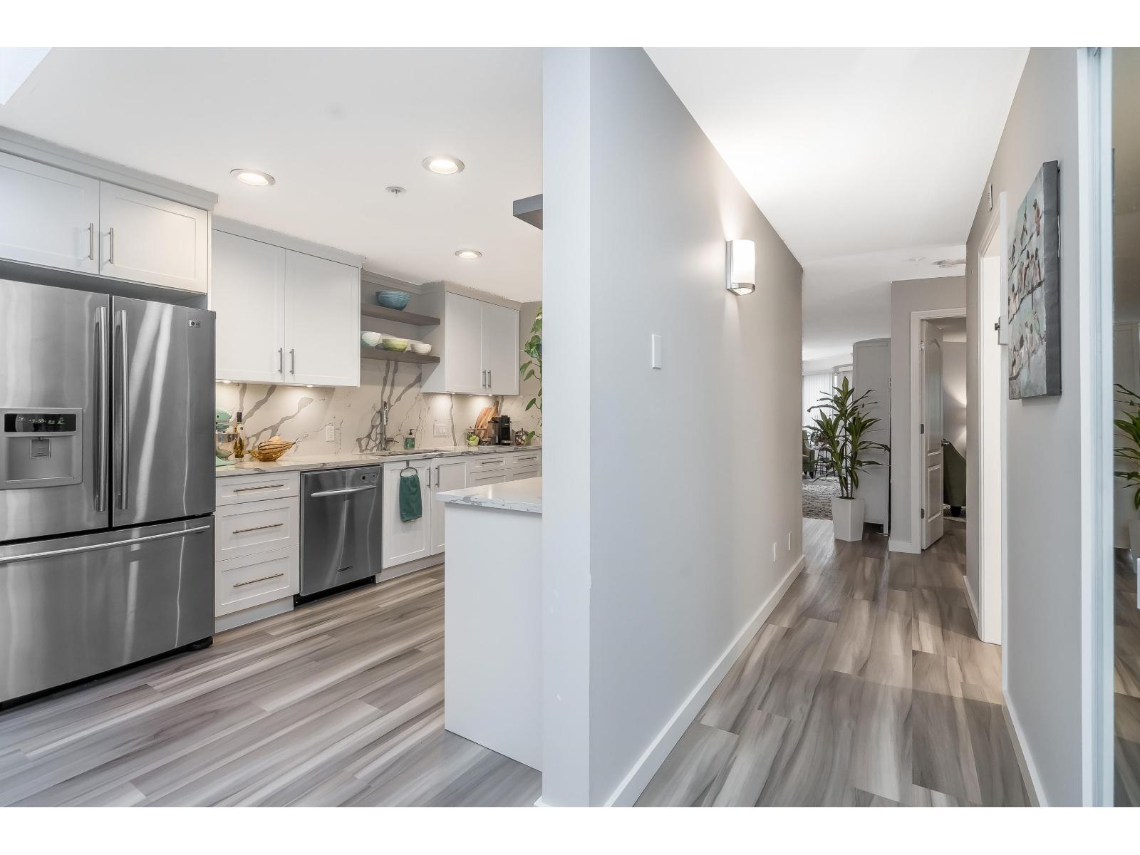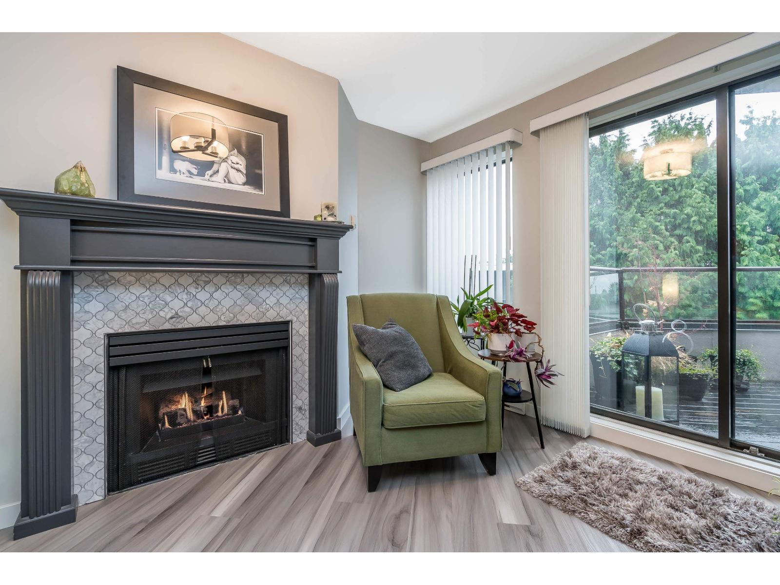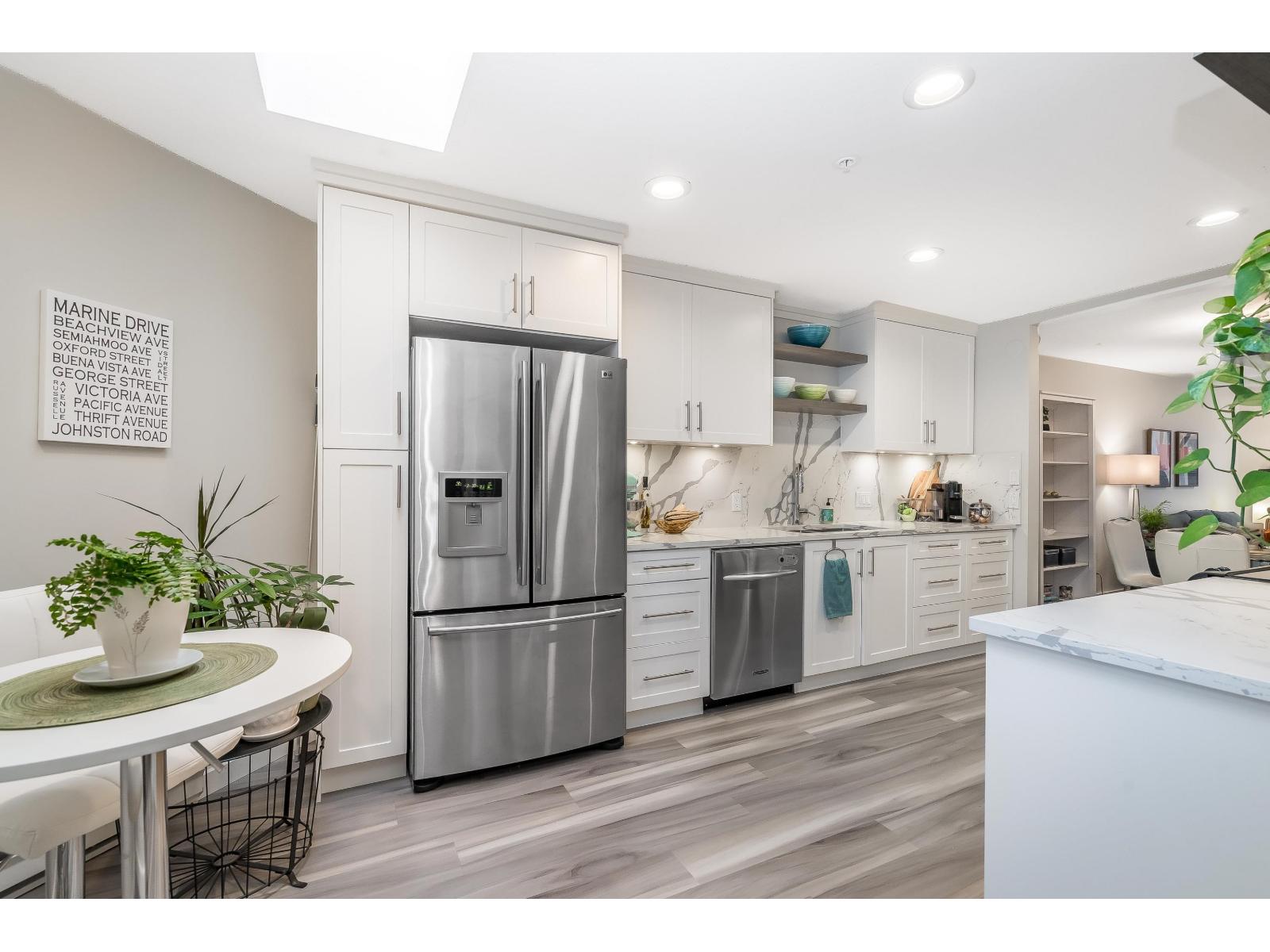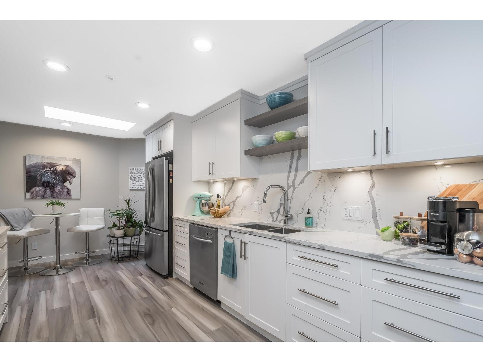 $634.32 MonthlyWelcome to Georgian Square - White Rock's boutique, award-winning building! Top-floor, end unit with 1,300+ sq. ft., 2 large bedrooms, 2 full baths, and a huge wrap-around deck, east facing with partial ocean views. 2020 updates include new kitchen, vinyl flooring, paint, light fixtures, and bathrooms. Bright kitchen with skylight, stainless steel appliances, and eating area. Spacious living/dining areas with a gas fireplace and huge bedrooms. Primary suite has a large walk-in closet and room for a grand piano. Quiet east side location, steps to cafés, shops, and White Rock Beach. 1 cat or dog allowed! Open House November 8th 2pm-4pm (id:44393)