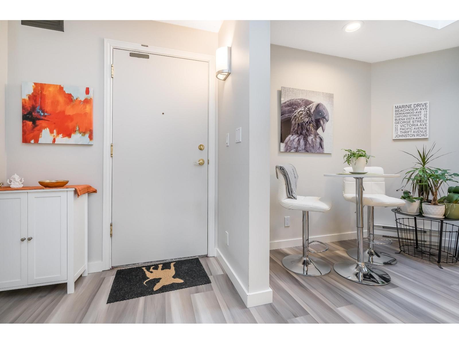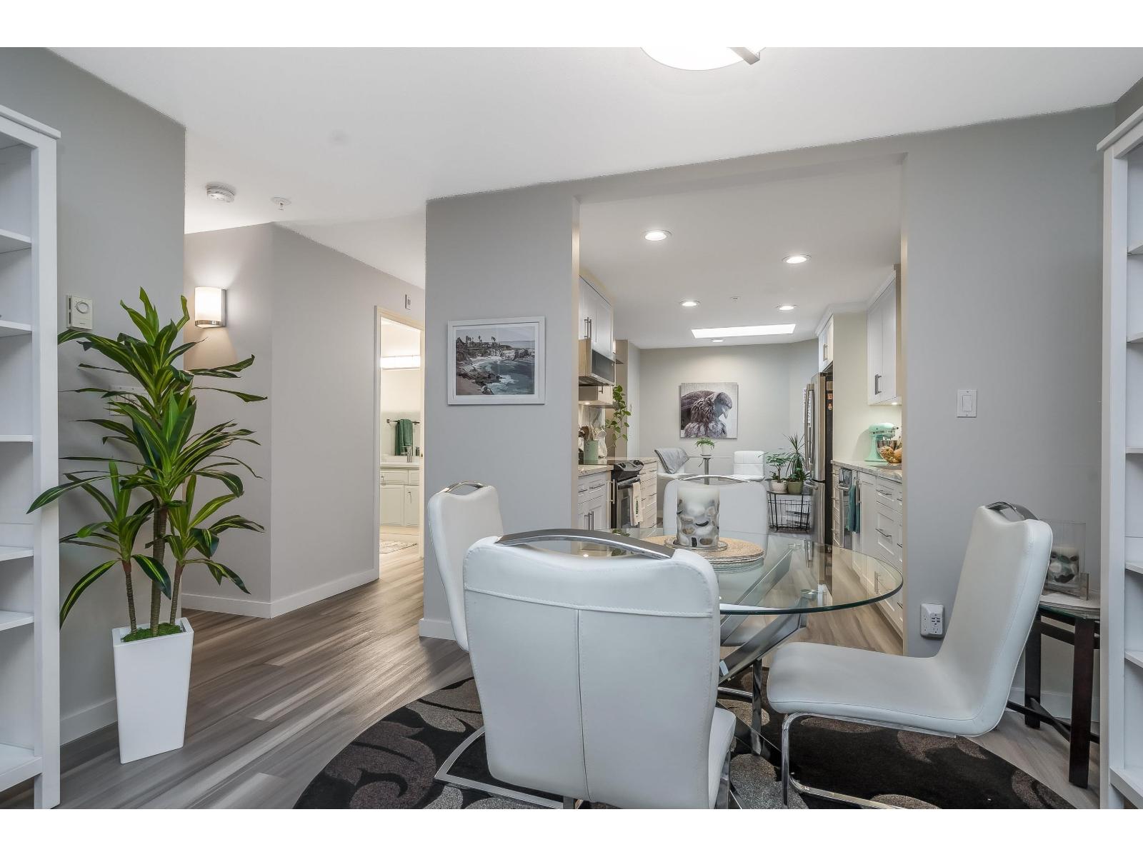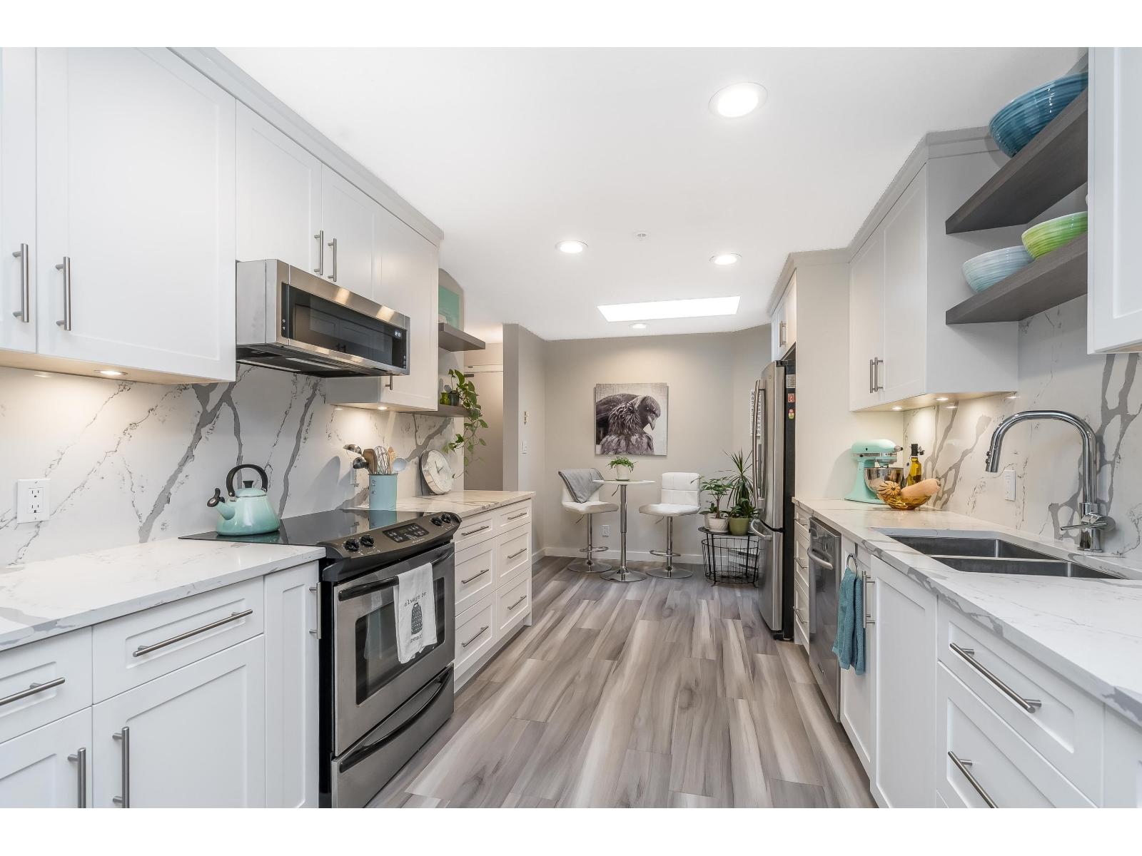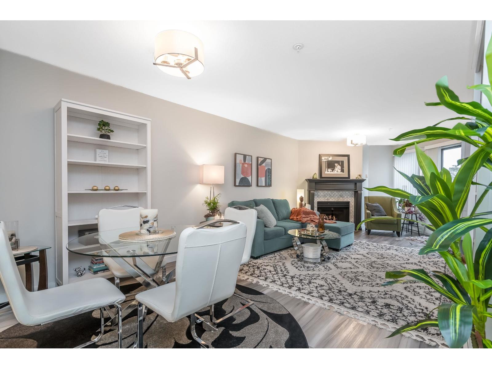 $634.32 MonthlyWelcome to Georgian Square - White Rock's boutique, award-winning building! Top-floor, end unit with 1,300+ sq. ft., 2 large bedrooms, 2 full baths, and a huge wrap-around deck, east facing with partial ocean views. 2020 updates include new kitchen, vinyl flooring, paint, light fixtures, and bathrooms. Bright kitchen with skylight, stainless steel appliances, and eating area. Spacious living/dining areas with a gas fireplace and huge bedrooms. Primary suite has a large walk-in closet and room for a grand piano. Quiet east side location, steps to cafés, shops, and White Rock Beach. 1 cat or dog allowed! Open House November 8th 2pm-4pm (id:44393)