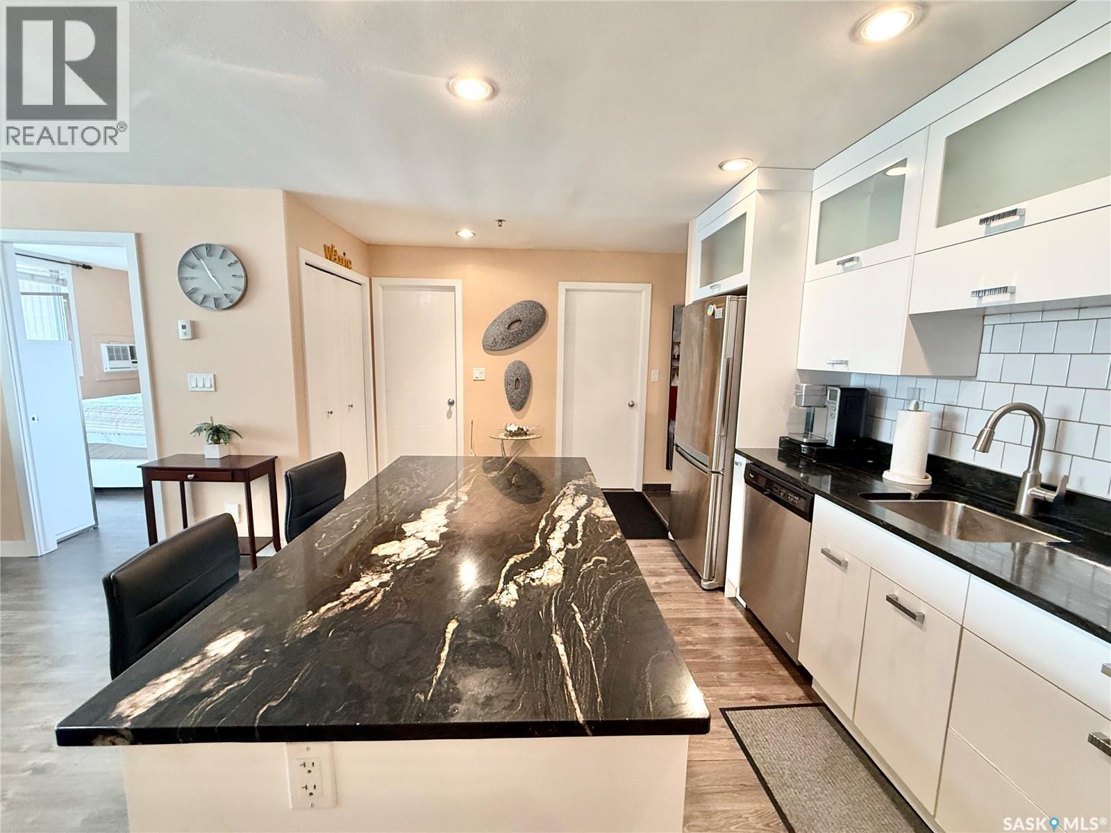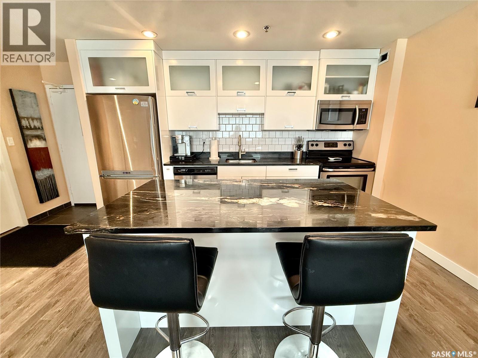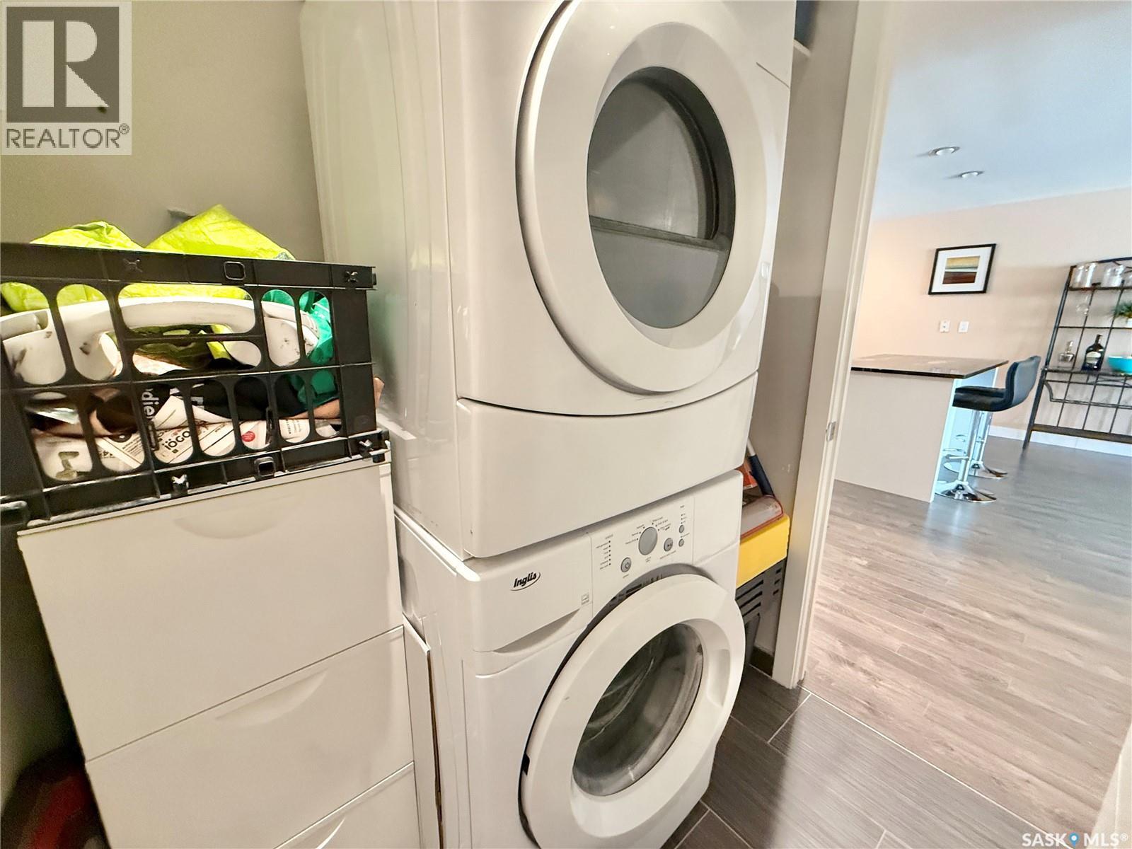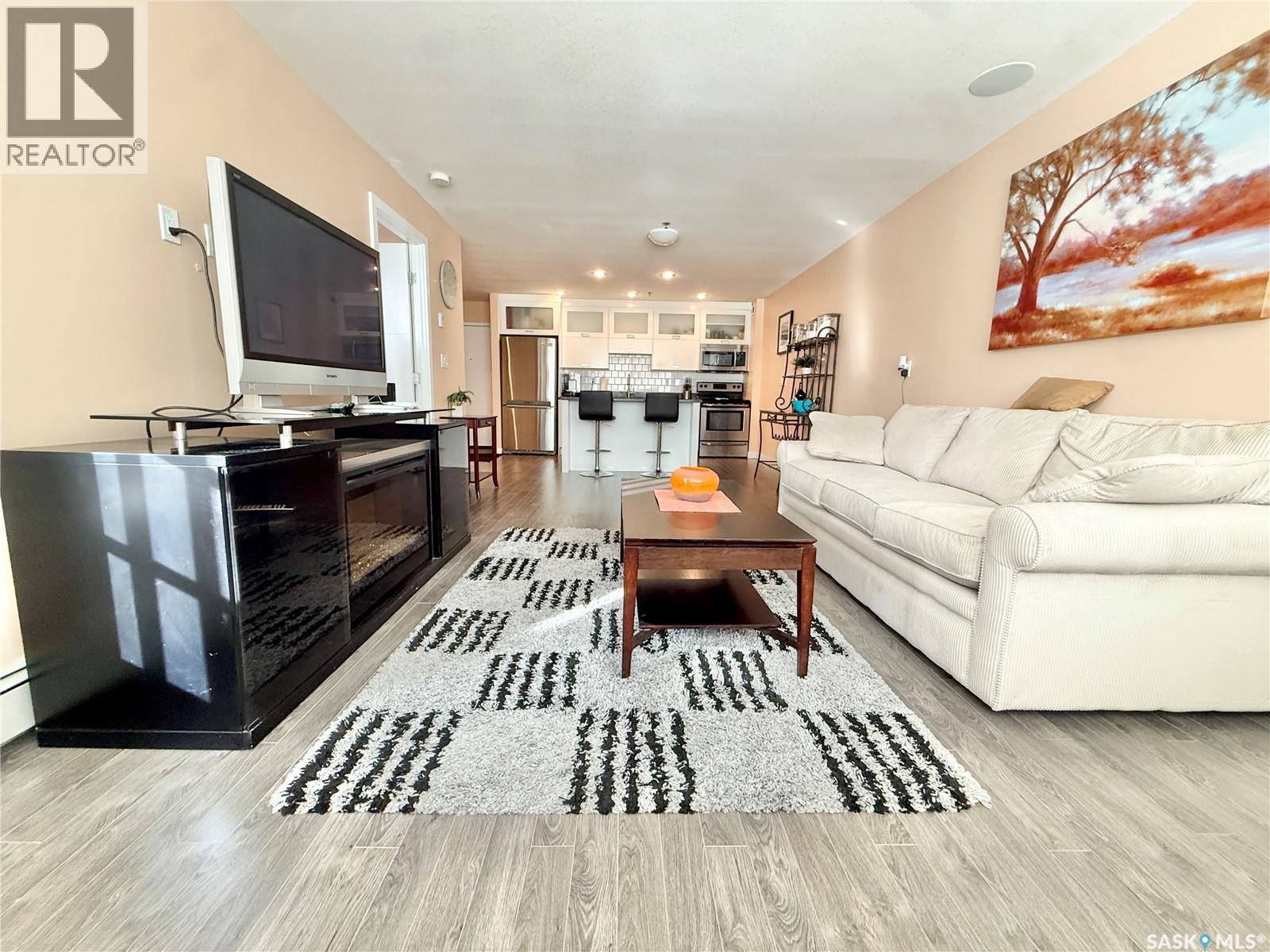 $358.60 MonthlyWelcome to this beautiful 1-bedroom, 1-bath condo in the highly desirable Genesee View building in River Heights. Just a short walk to the river and all amenities, this updated unit features a modern white kitchen with sleek dark quartz countertops and a spacious island perfect for entertaining. Ample cupboard space and stainless steel appliances are included. The home boasts stylish laminate and tile flooring, while the bright, south-facing living room offers a cozy spot to enjoy the glass fireplace/TV stand that can stay. The bedroom comes with a queen bed, high-quality mattress, and modern white wardrobe, all of which can remain. At the entrance, you’ll find a storage area with a stacking washer/dryer and a pantry cupboard for all the extras. The south-facing balcony is screened and covered with outdoor turf—keeping birds out and friends in. This quiet building also offers an indoor pool, hot tub, and a large recreation & amenities room for gatherings. Don’t miss the chance to see this charming unit. (id:44393)