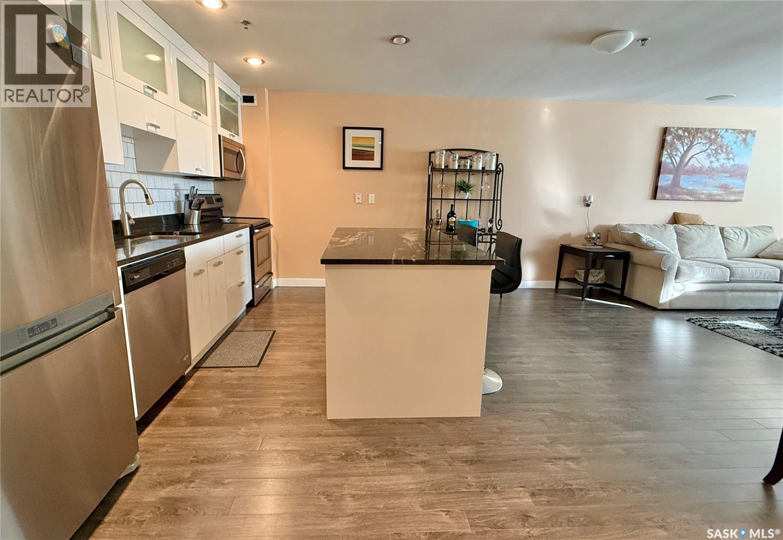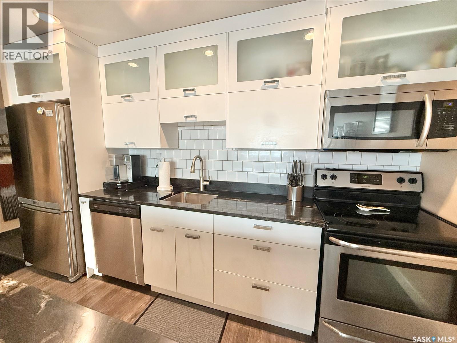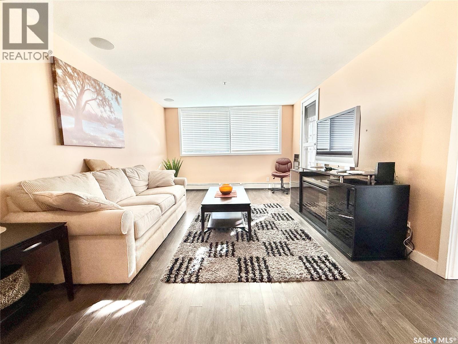 $358.60 MonthlyWelcome to this beautiful 1-bedroom, 1-bath condo in the highly desirable Genesee View building in River Heights. Just a short walk to the river and all amenities, this updated unit features a modern white kitchen with sleek dark quartz countertops and a spacious island perfect for entertaining. Ample cupboard space and stainless steel appliances are included. The home boasts stylish laminate and tile flooring, while the bright, south-facing living room offers a cozy spot to enjoy the glass fireplace/TV stand that can stay. The bedroom comes with a queen bed, high-quality mattress, and modern white wardrobe, all of which can remain. At the entrance, you’ll find a storage area with a stacking washer/dryer and a pantry cupboard for all the extras. The south-facing balcony is screened and covered with outdoor turf—keeping birds out and friends in. This quiet building also offers an indoor pool, hot tub, and a large recreation & amenities room for gatherings. Don’t miss the chance to see this charming unit. (id:44393)