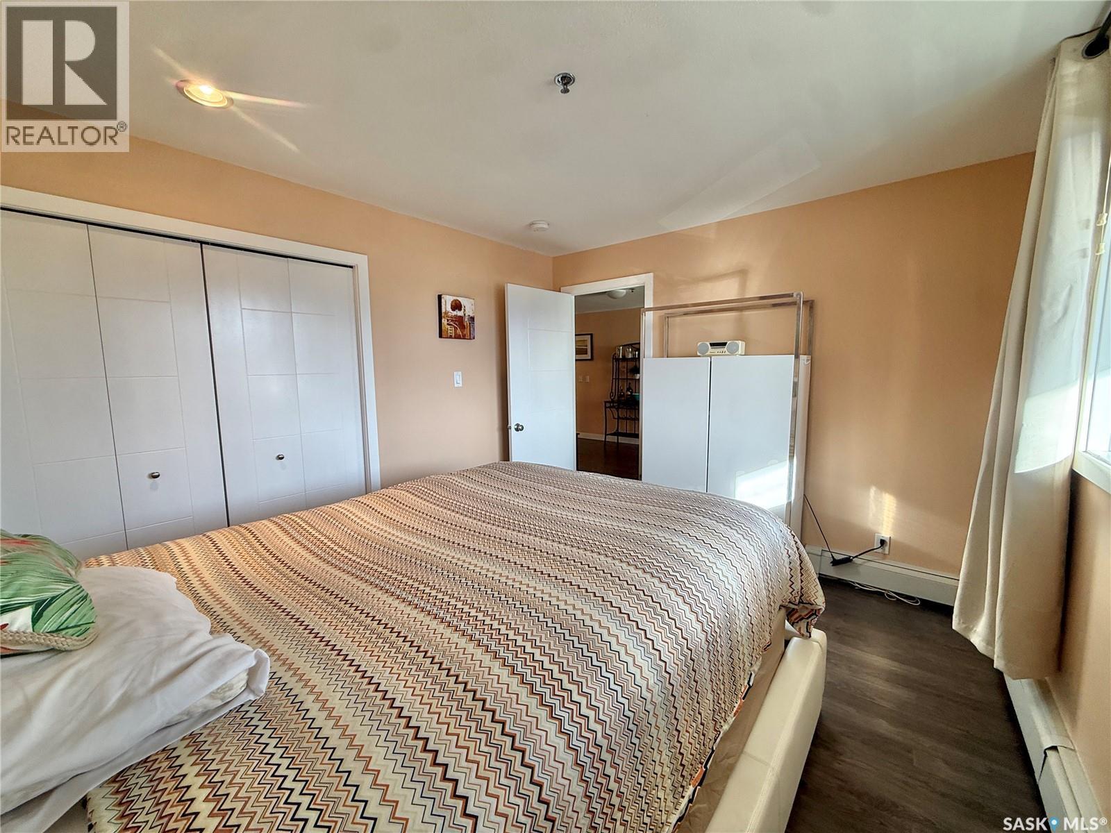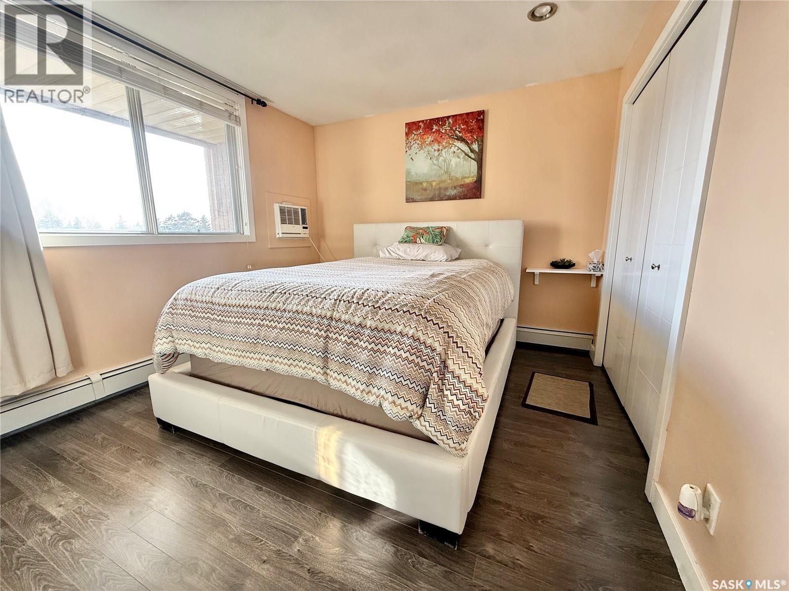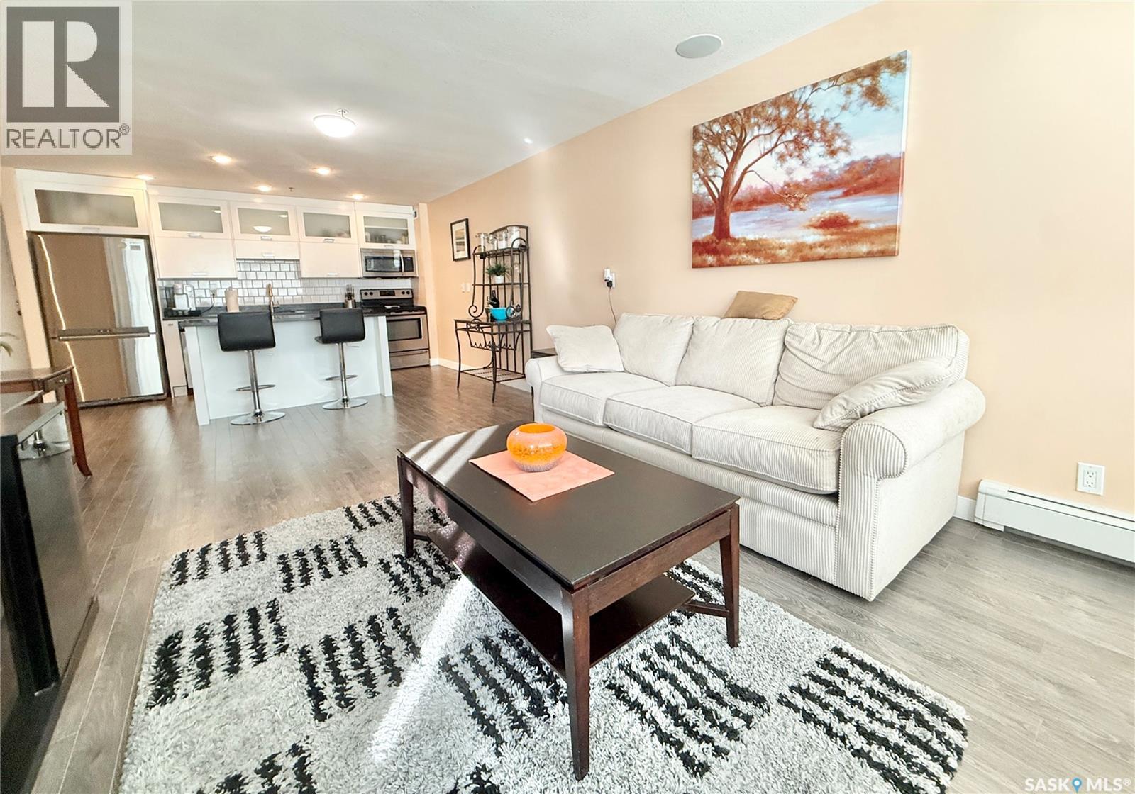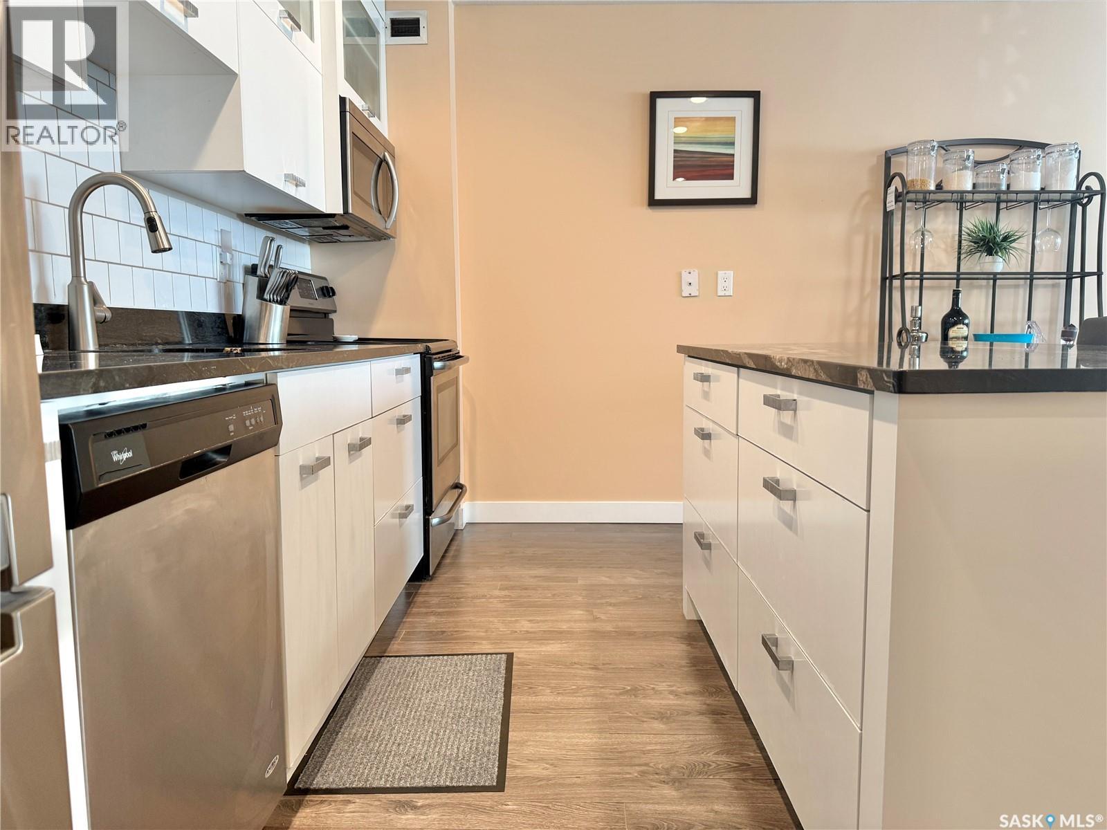 $358.60 MonthlyWelcome to this beautiful 1-bedroom, 1-bath condo in the highly desirable Genesee View building in River Heights. Just a short walk to the river and all amenities, this updated unit features a modern white kitchen with sleek dark quartz countertops and a spacious island perfect for entertaining. Ample cupboard space and stainless steel appliances are included. The home boasts stylish laminate and tile flooring, while the bright, south-facing living room offers a cozy spot to enjoy the glass fireplace/TV stand that can stay. The bedroom comes with a queen bed, high-quality mattress, and modern white wardrobe, all of which can remain. At the entrance, you’ll find a storage area with a stacking washer/dryer and a pantry cupboard for all the extras. The south-facing balcony is screened and covered with outdoor turf—keeping birds out and friends in. This quiet building also offers an indoor pool, hot tub, and a large recreation & amenities room for gatherings. Don’t miss the chance to see this charming unit. (id:44393)