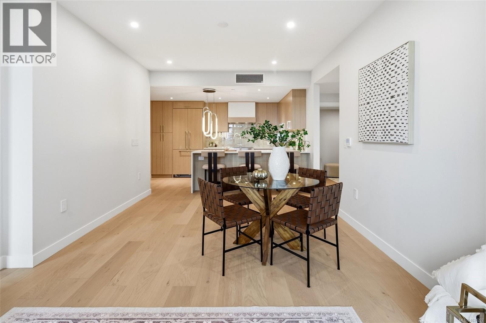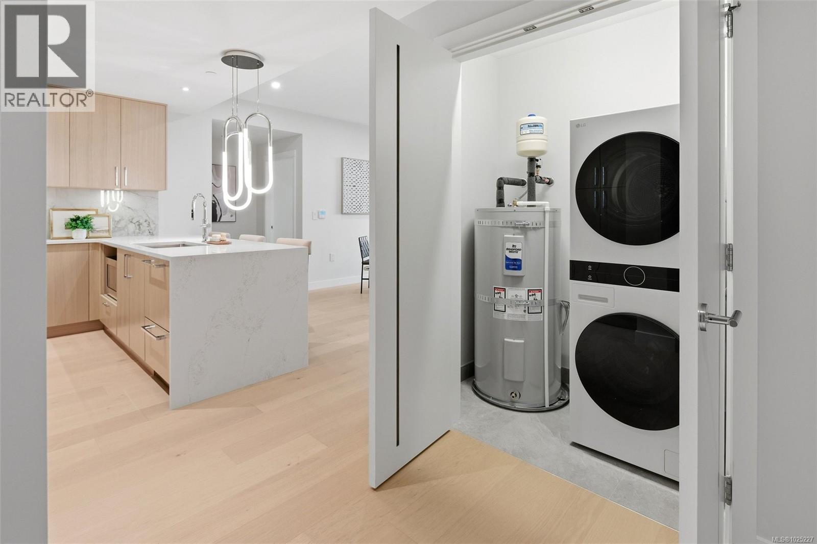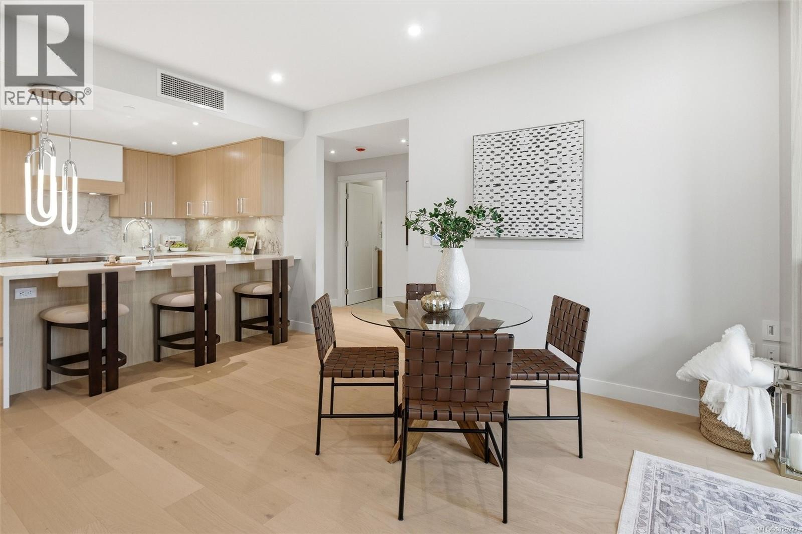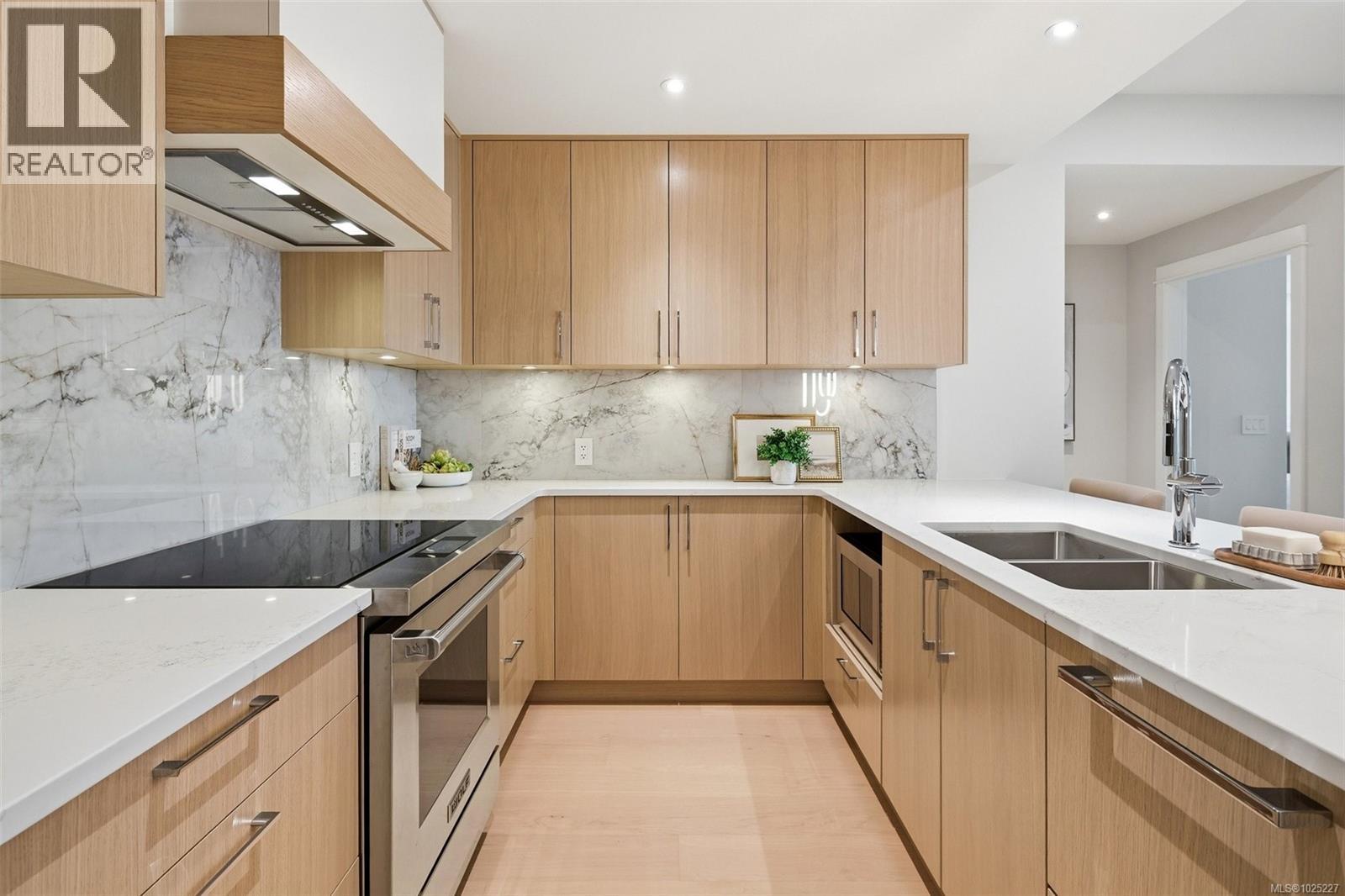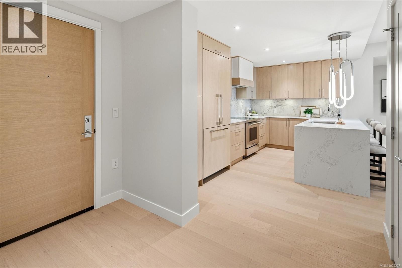 $557.10 Monthly301 at Tiller & Grace is arguably one of the most impressive two-bedroom residences in the building—an east-facing 2-bedroom plus den home crafted by GT Mann with exceptional attention to detail and livability. Its thoughtful layout positions the two bedrooms on opposite sides of the living area, creating a sense of privacy and spaciousness rarely found in modern condo design. The open-concept living space is centred around a chef-inspired kitchen with remarkable storage, a premium appliance suite—WOLF induction cooktop and oven, panelled Fisher & Paykel fridge/freezer, and double-drawer dishwashers—and an oversized island perfect for cooking, hosting, and everyday living. Custom millwork by Harbour City Kitchens features rift-cut white oak veneers and solid birch dovetail drawers, bringing warmth and sophistication to the home. The den adds meaningful versatility: well-sized for a sofa bed, ideal as a home office, music room, art space, or additional storage—allowing the home to adapt to a wide range of lifestyles. Expansive ocean views extend across the living room and both bedrooms, capturing breathtaking sunrises and filling the home with natural light. A fully covered east-facing balcony provides generous outdoor living space—the perfect setting for morning coffee with the coastal horizon as your backdrop. Ducted air conditioning ensures year-round comfort. Blending an exceptional layout with premium craftsmanship, flexible spaces, and some of the most captivating views in the building, 301 at Tiller & Grace represents a rare opportunity to own one of the development’s standout homes in the heart of Cordova Bay. (id:44393)