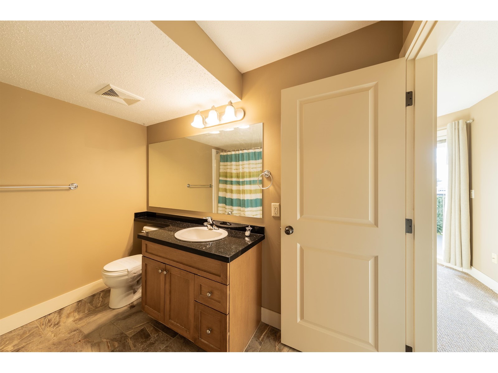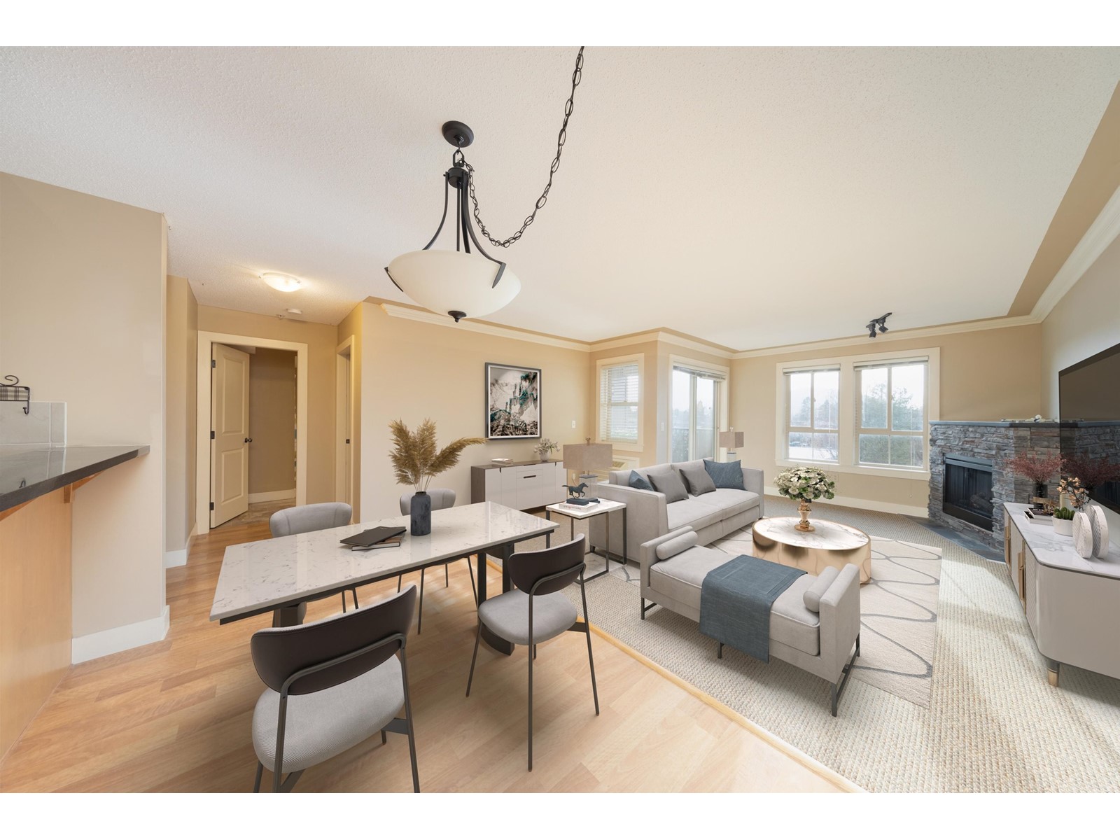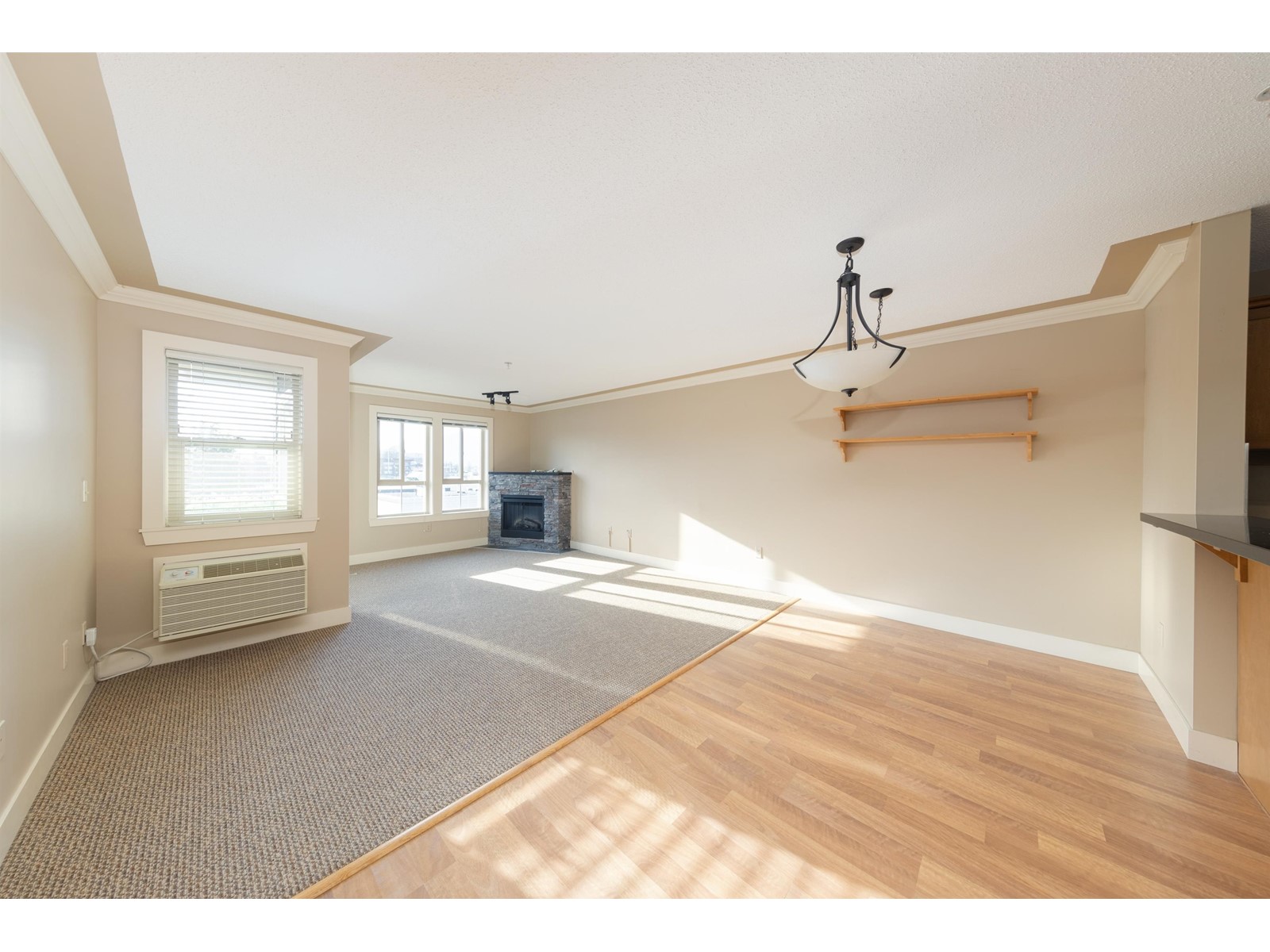 Vacant and move-in ready, this spacious 855 sq.ft. 1-bedroom condo offers both comfort and convenience. Located just steps from shopping, dining, banks, the library, Chilliwack General Hospital, and the leisure centre. Enjoy stunning 180-degree mountain views and sunsets from your private balcony. The unit features a cozy stone fireplace, built-in computer nook, granite countertops, tile flooring, and access to the balcony from both the living room and bedroom. Additional highlights include hot/cold AC, in-suite laundry and storage, newer semi-industrial carpets, and appliances (excluding the range) replaced from 2022 onward. The building offers secure underground parking, a clubhouse, a library, and is pet-friendly. BC Assessment Value: $366,000. A must-see! (id:44393)
