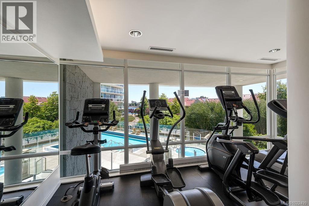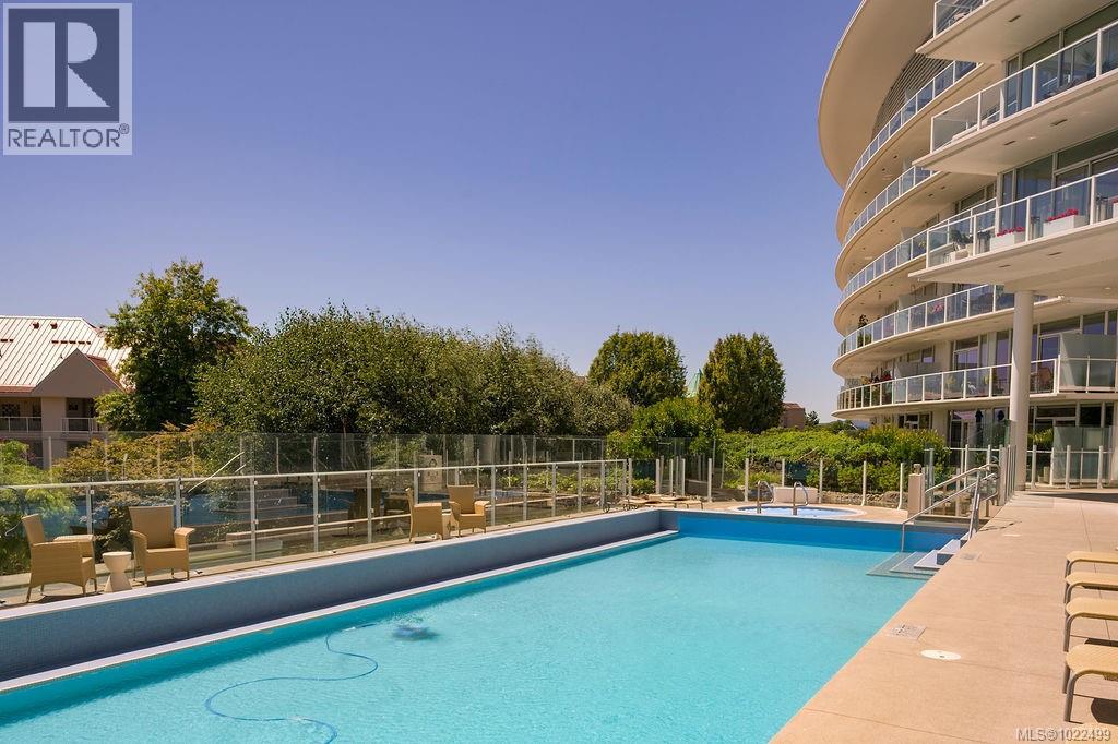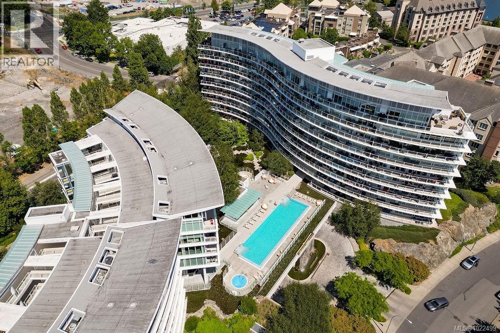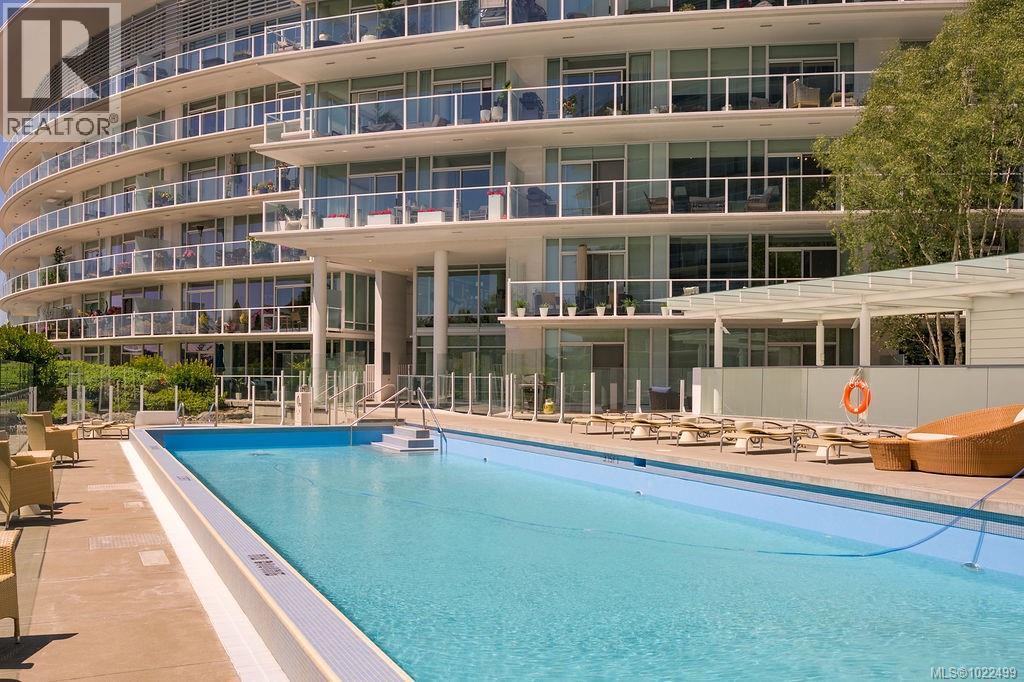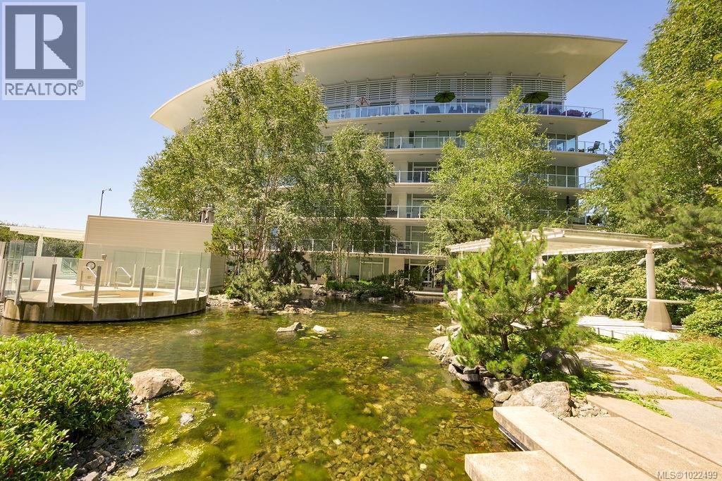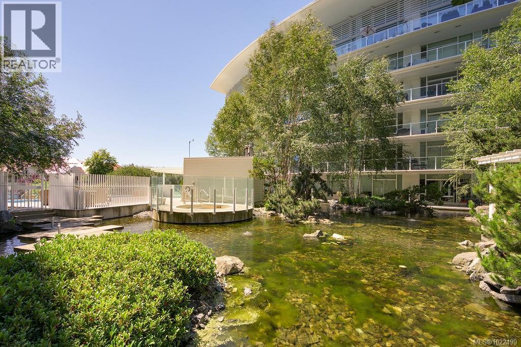 $773 MonthlyBEST of the SONGHEES - Discover Shutters Residences - A prestigious address in Victoria's Inner-Harbour. Premier 3-acre architecturally unique property enhanced by tranquil water gardens and resort-styled amenities: Heated outdoor seasonal lap pool, 2 hot tubs, steam room, sauna & fitness centre available year-round. This exquisite 3rd floor 2 bedroom suite with seasonal Middle-Harbour views comes with striking contemporary interior, 2 full bathrooms-both with transom windows for natural lights, 3 sets of sliding glass doors presenting floor to ceiling windows in living room & both bedrooms, bonus 3 sets of disappearing retractable phantom screens provide energy efficient crossed ventilation to improve air quality and thermal comfort as needed, engineered wood-floors thru-out living/dining, hallway and bedrooms including W-I closet, heated marble floor in spa-liked ensuite, high quality S.S. appliances with granite tops kitchen and 215 S/F entertainment sized balcony with serene views over water garden comes with power and natural gas hose bib for the BBQ and/or Fire Pit to add to the ambience. Come enjoy the beauty of Victoria's vibrant waterfront surrounded by sea-walks, just minutes stroll to downtown yet removed from hustle/bustle of the core. Cycle, kayak, walk - everything is moments from your door. Suite has been used very lightly past number of years - Shows BEAUTIFULLY and priced sensibly well under 2026 BCAA Assessment of $917,000 and available for quick possession! (id:44393)